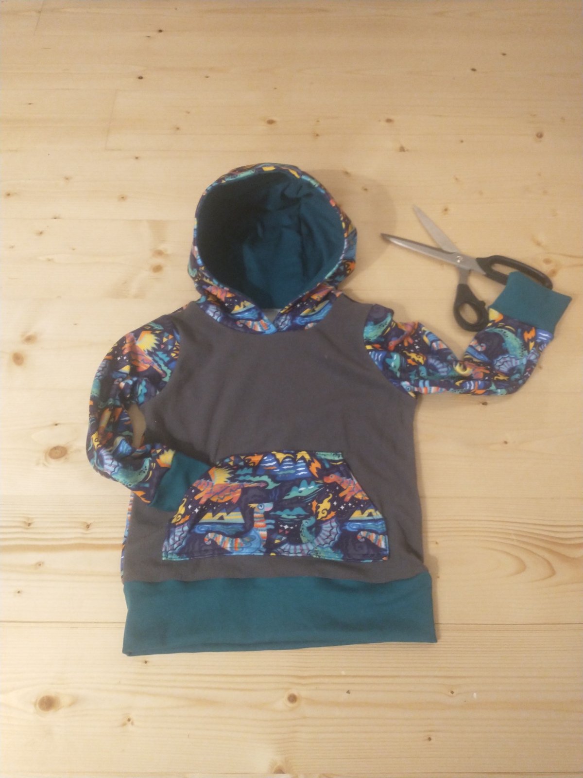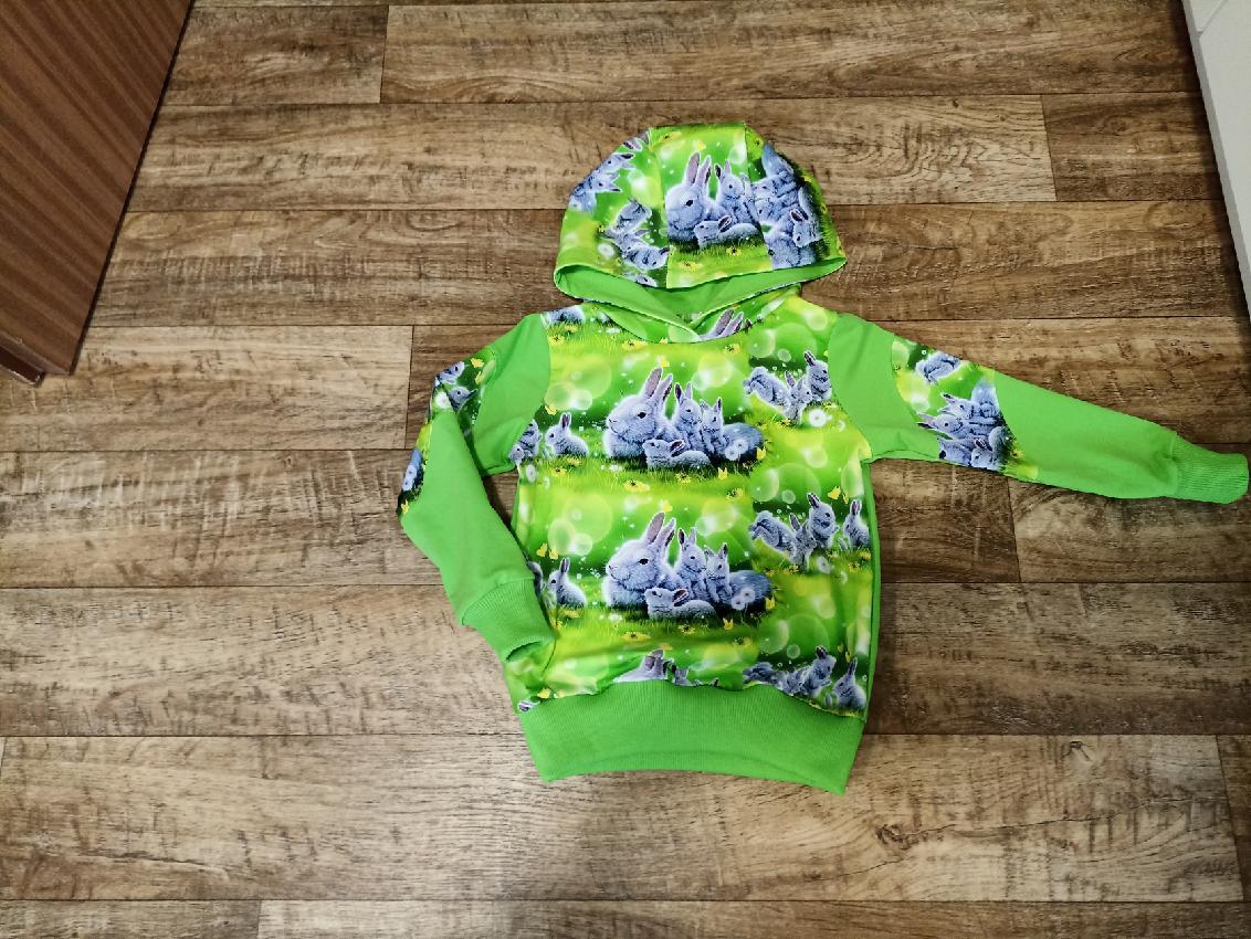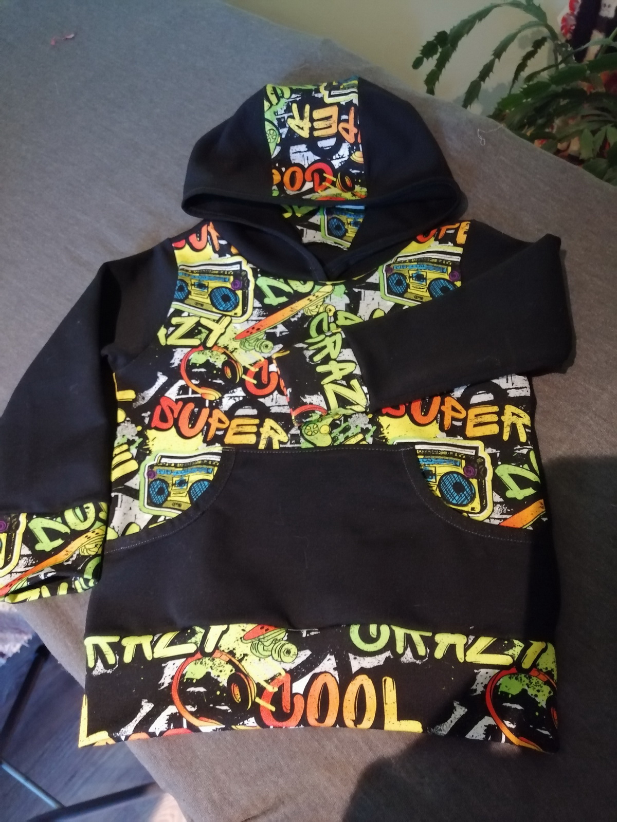 „Už čtvrtá mikina dle tohoto střihu, na přání bez kapuce, protože v kapuce pod zimní bundou "zavazí". Šilo se opět úžasně.“