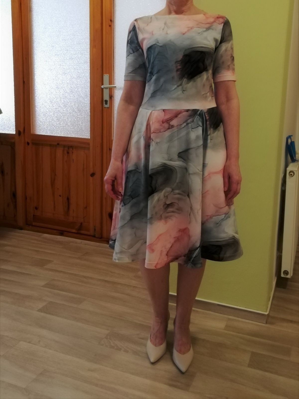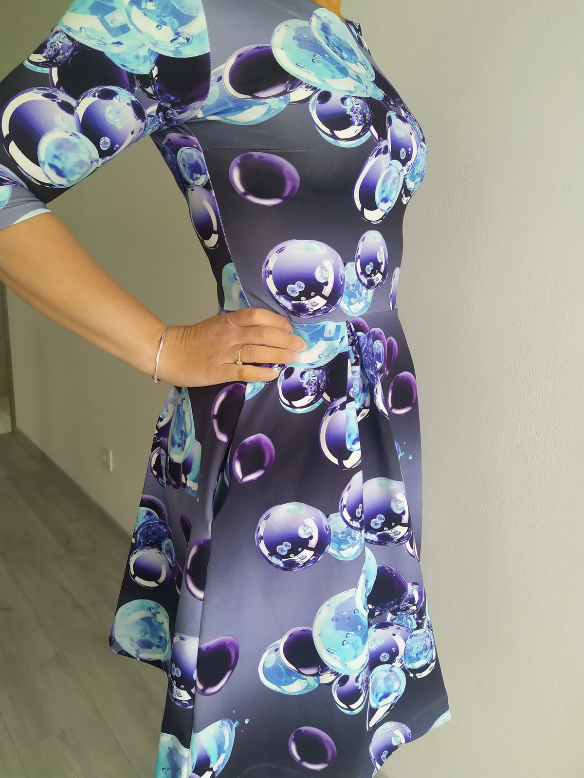 „Šaty se šily pěkně, ale pro příště vynechám dvojité sklady na PD sukně a zadní díl zkrátím. Do pasového švu jsem všila gumičku, aby šaty neodstávaly.“