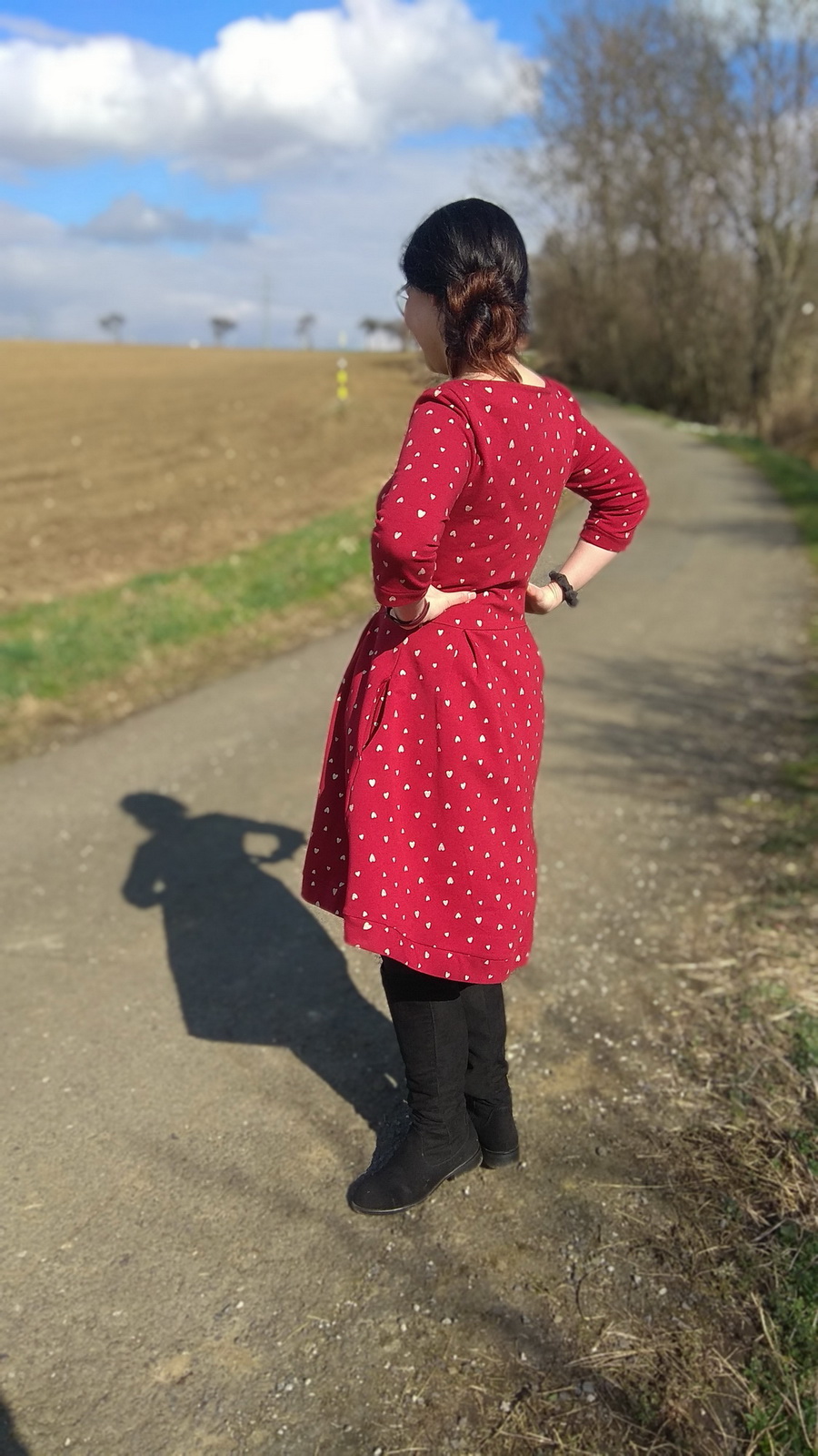 Slušivé, ženské, pohodlné a snadné na šití. Podzimní, jarní šaty se sklady a prodlouženou zadní částí sukně. Výstřih je zpracován do formy podsádky. Lze je nosit jako těhotenské (pokud by se zvýšil pas, tak i do pokročilého těhotenství :-). Střih je primárně zamýšlen pro teplákovinu s elastanem a tak by měly nejlépe sedět velikostně. Ale lze zvolit i jiný pružný materiál. Velikost je dobré odzkoušet ušitím jen vršku, jak je ukázáno ve video návodu. Koukněte do inspiračního alba, střih je úspěšně šit i z úpletu.