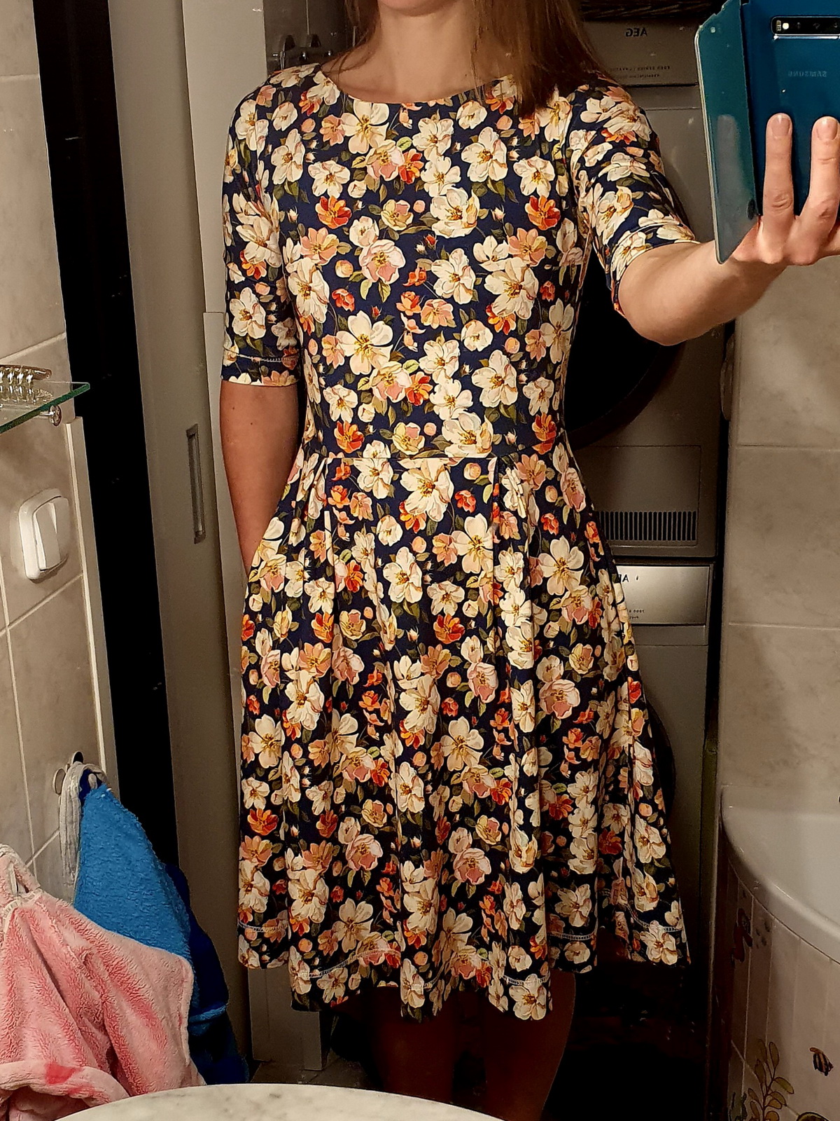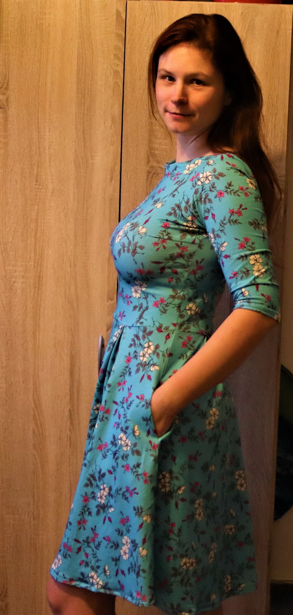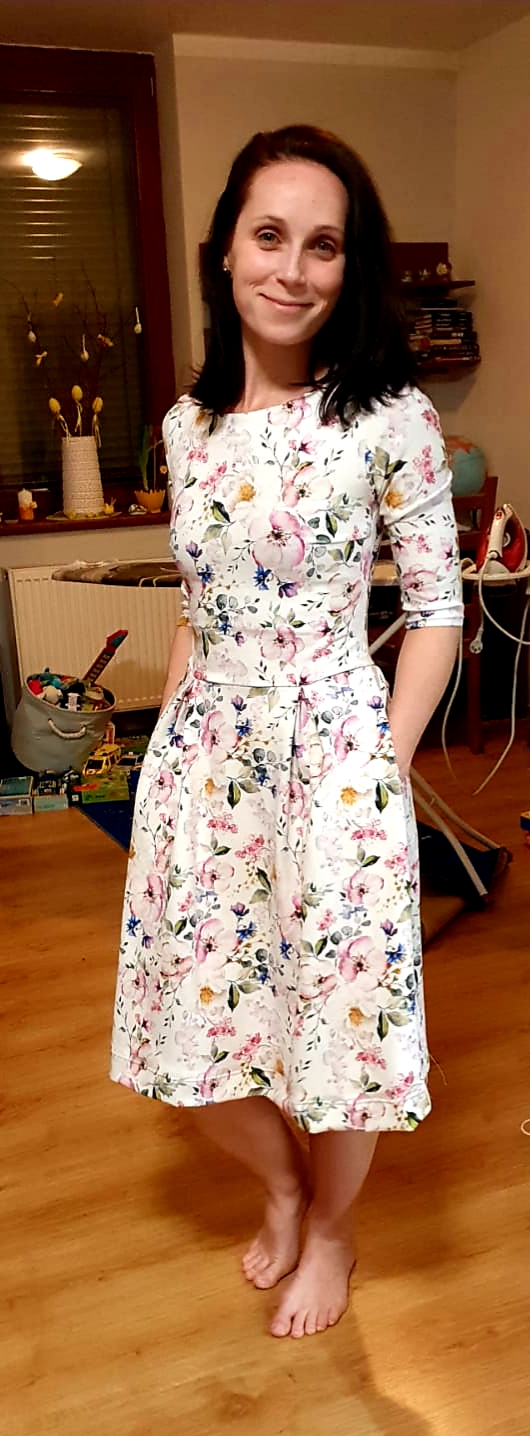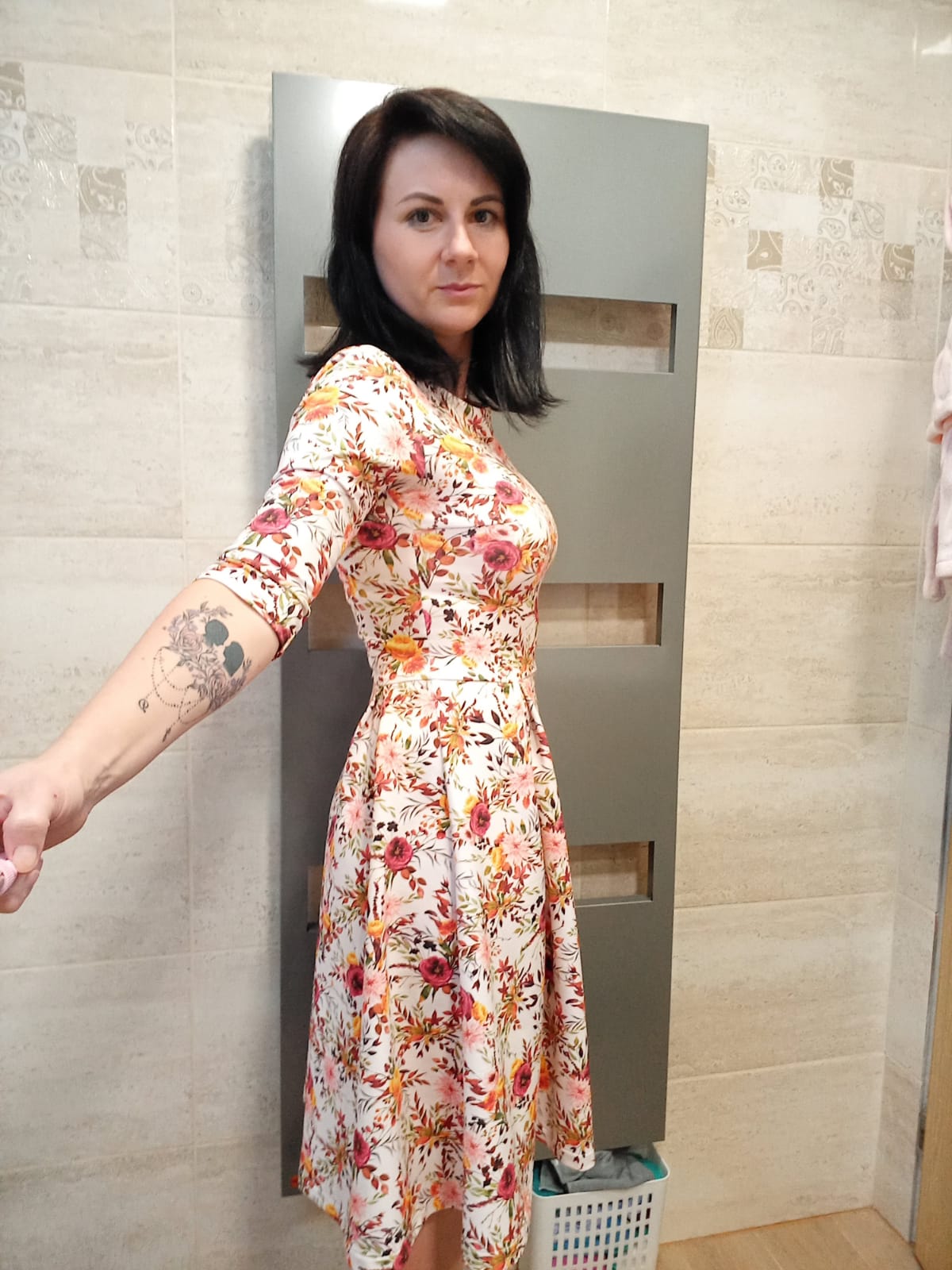 „MOC spokojena, střih i videonávod srozumitelný!Aneb šaty Pavlína ze SILKY- Jde to!:)Zde mé postřehy: Střih je určen pro úplet nebo teplákovinu, nutno přeměřit své proporce a hlavně připočíst i fakt, že silky "jen" mírně pruží , resp.ne tolik jako úplet nebo teplákovina s elastanem.Nosím běžně vel. 38,po zvážení mé postavy střihnuto v tomto případě vel.40+švy. Rukávy jsem raději rozšířila(květované látky bylo málo,nemohla jsem si dovolit chybu,že se do nich nevejdu) 😛.Na šatech není žádný zip nebo zapínání-přetahuji přes hlavu . Záševky jsem "vynechala". (Na ta má kůzlátka je to zbytečný 😛).Myslím, že se nic nestalo a i tak to vypadá dobře. Délka sukně zvolena podle svého uvážení a konzervativnosti, zakončeno rolovacím stehem. Rolovací steh + ohnutí a ruční stehování jsou rukávy i kolem krku.“