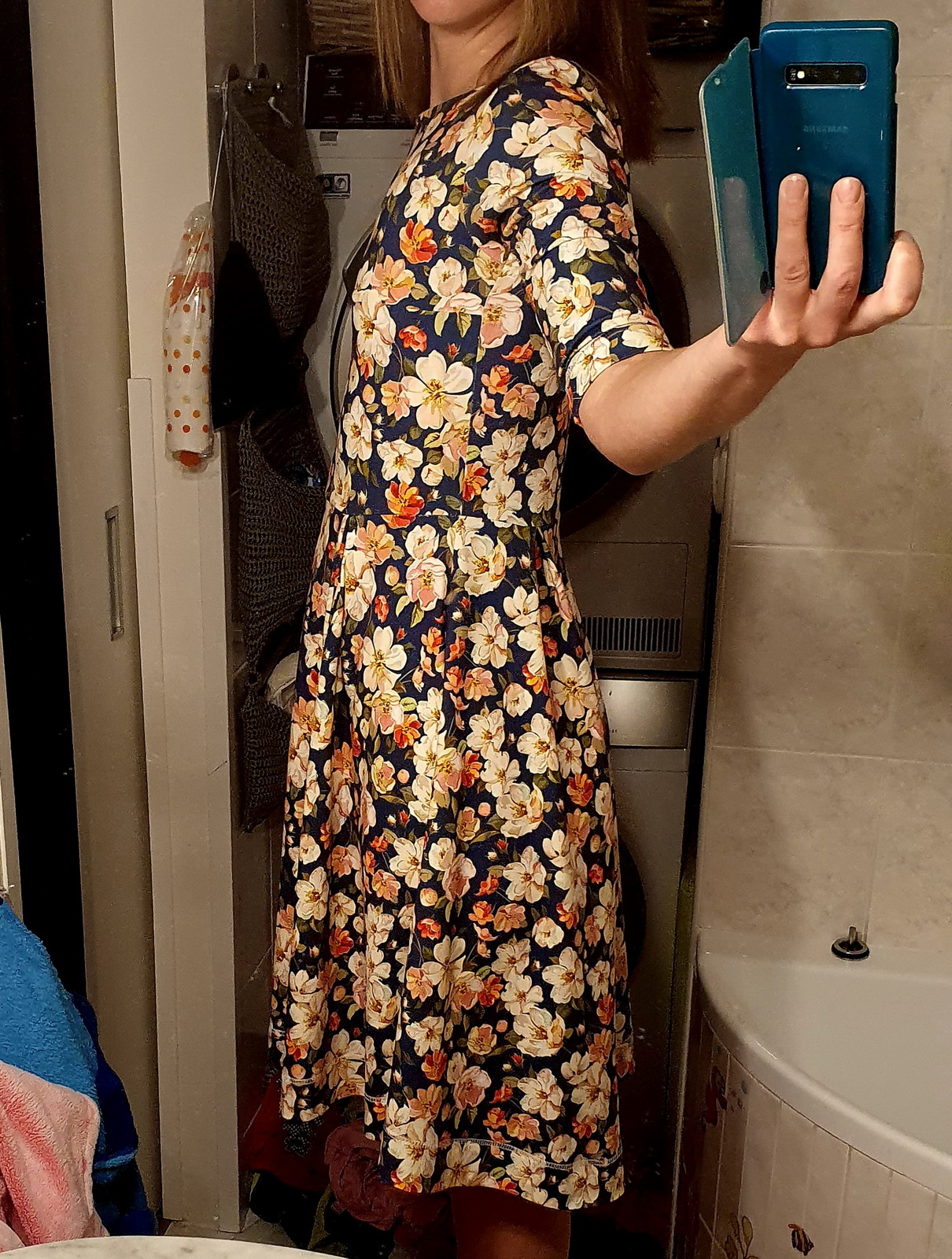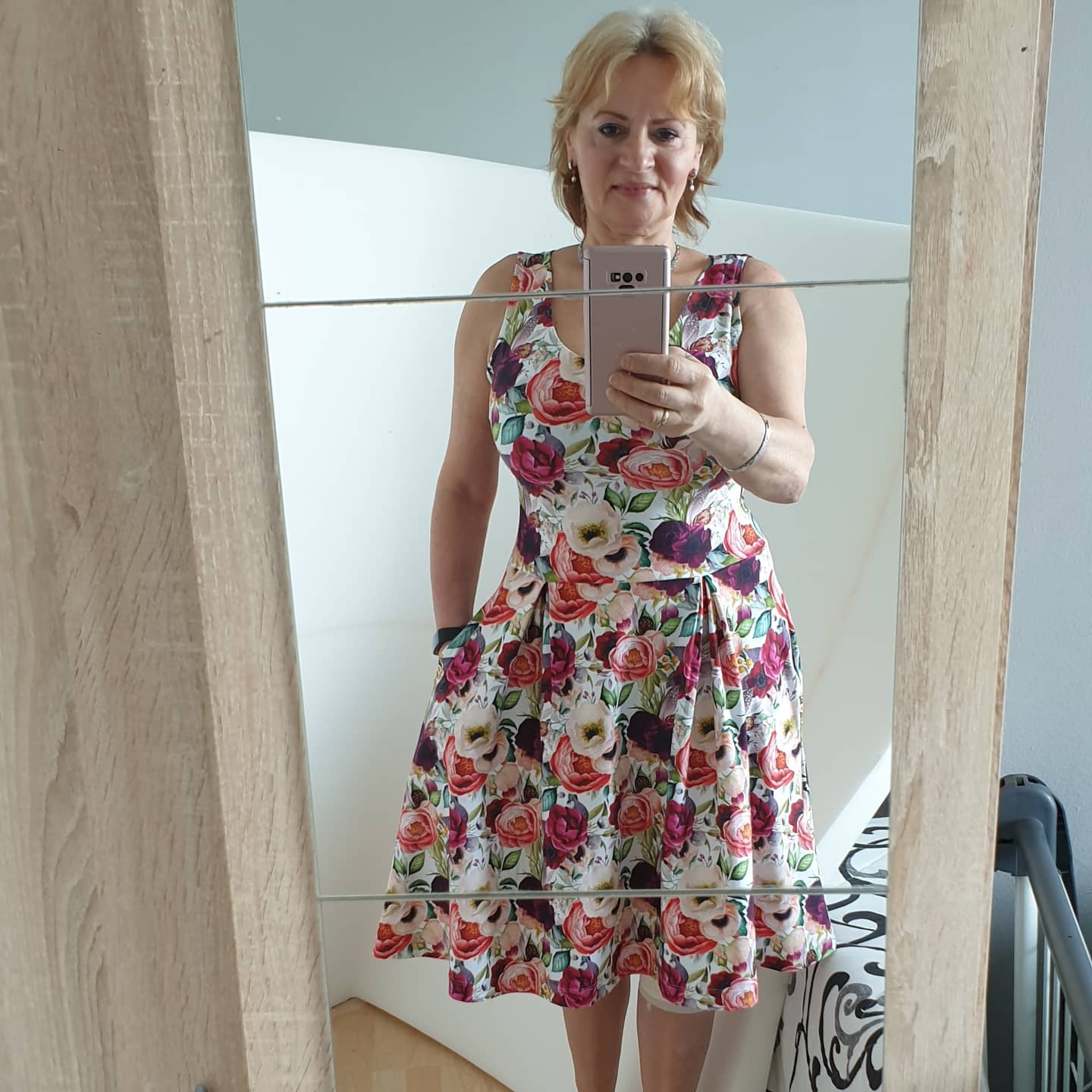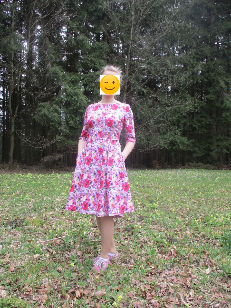 „MOC spokojena, střih i videonávod srozumitelný!Aneb šaty Pavlína ze SILKY- Jde to!:)Zde mé postřehy: Střih je určen pro úplet nebo teplákovinu, nutno přeměřit své proporce a hlavně připočíst i fakt, že silky "jen" mírně pruží , resp.ne tolik jako úplet nebo teplákovina s elastanem.Nosím běžně vel. 38,po zvážení mé postavy střihnuto v tomto případě vel.40+švy. Rukávy jsem raději rozšířila(květované látky bylo málo,nemohla jsem si dovolit chybu,že se do nich nevejdu) 😛.Na šatech není žádný zip nebo zapínání-přetahuji přes hlavu . Záševky jsem "vynechala". (Na ta má kůzlátka je to zbytečný 😛).Myslím, že se nic nestalo a i tak to vypadá dobře. Délka sukně zvolena podle svého uvážení a konzervativnosti, zakončeno rolovacím stehem. Rolovací steh + ohnutí a ruční stehování jsou rukávy i kolem krku.“