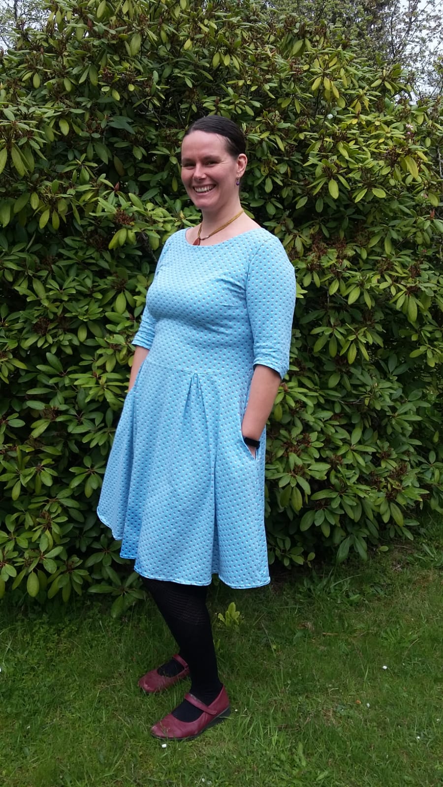 „Můj první větší projekt z pleteniny ozvláštněný stuhou. Určitě to nejsou poslední šaty, které jsem dle tohoto střihu šila! Děkuji za něj :)“