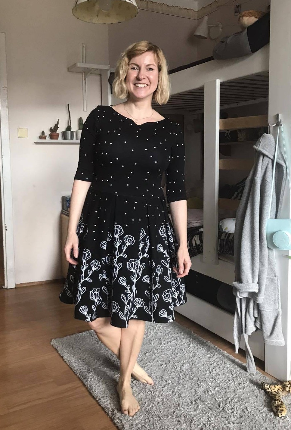 „Moc pekny strih, saty se sily paradne, moc se mi libi hlavne uprava vrchni casti - pekne podtrhuje zenske krivky. Na mem obrazku neni sukne zcela podle puvodniho strihu: protoze jsem nemela dostatek latky, musela jsem vynechat sklady. Ale to je kouzlo dobreho strihu - umoznuje spoustu drobnych variaci pri kazdem siti. A diky za video - vizual celeho procesu je neocenitelny 👍.“
