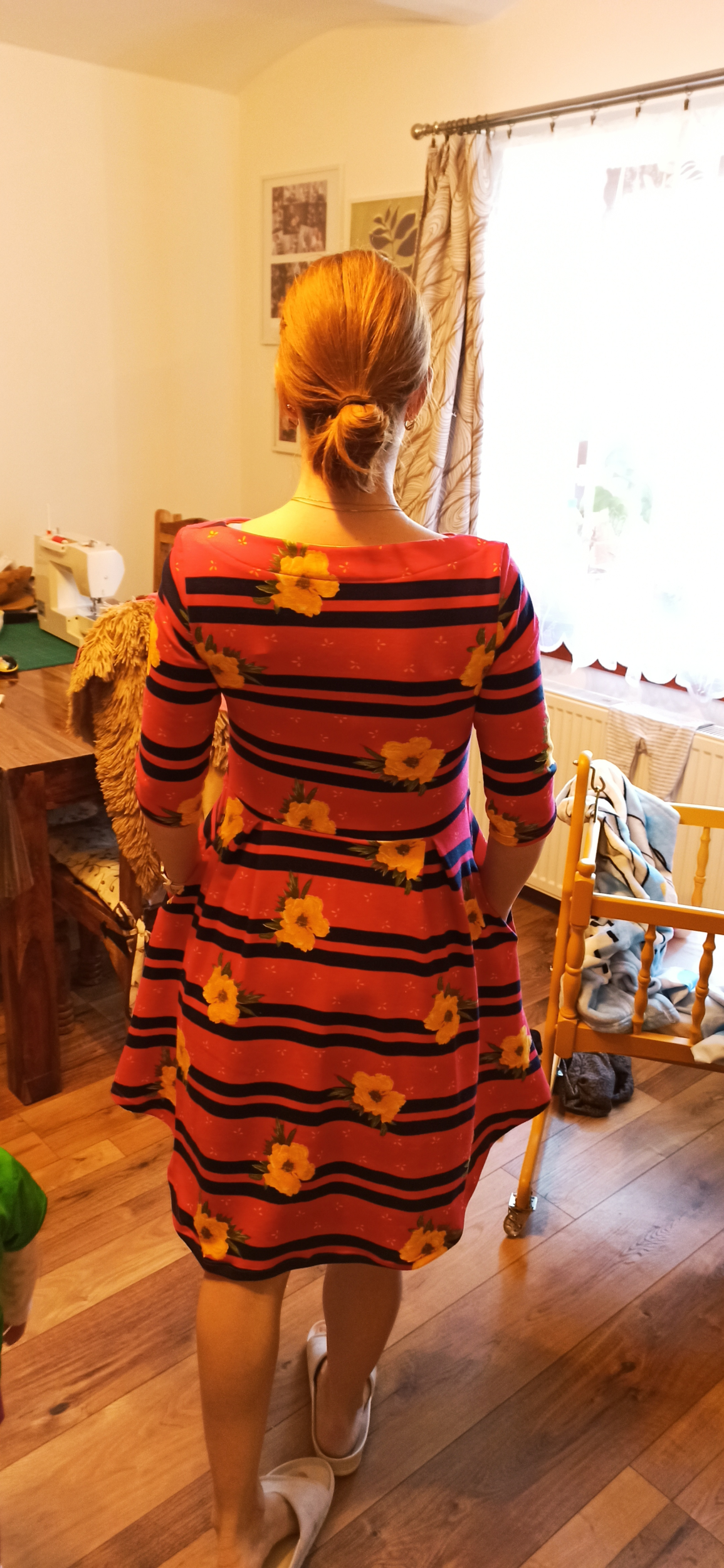 „Šaty se šily dobře, už jsem šila druhé. Akorát jsem zašila sklady, připadalo mi, že z téhle látky trochu trčely. Je to trochu silnější materiál, než jsem čekala, ale takhle, myslím, sedí dobře 😊.“