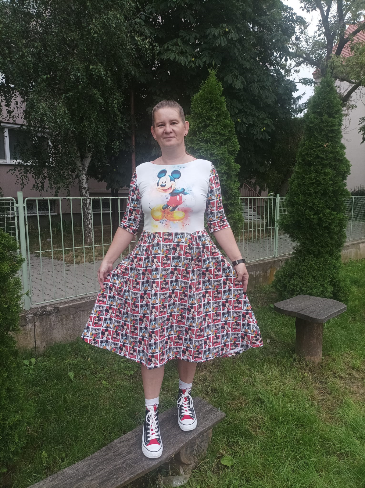 „Toto jsou aktuálně moje nejoblíbenější šaty. Cítím se v nich skvěle. Pěkně zamaskují nedostatky. Vršek Pavlíny, sukně prodloužená z Letnín.“
