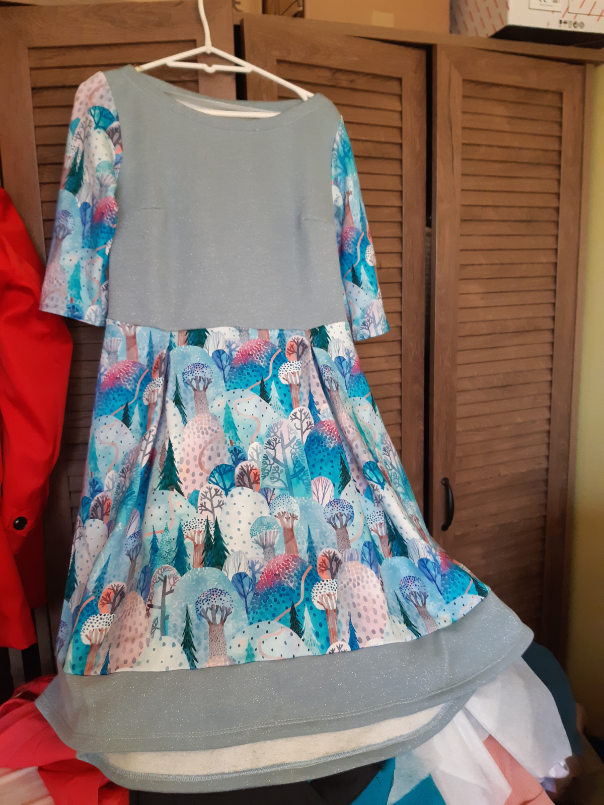 „První šaty pro maminku. Rozhodovala jsem se mezi Pavlínami a Letniny, volba padla na Pavlíny. Podle videonavodu se silo úplně fajn, i pro začátečníka jako jsem já. Už hledám vhodný vzor na šaty i pro mě a dcerku 😁“