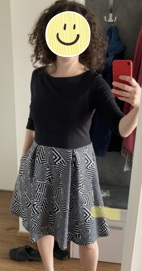 Šila som zo zbytku, čo mi ostal z iného projektu, preto som pri sukni zaimprovizovala - predný diel som nerozširovala, ale iba "naskladala" podľa návodu. Sukňa je kratšia, práve kvôli nedostatočnému množstvu látky, ale ja aj tak uprednostňujem kratšie sukne, tak mi to vôbec nevadí :-)