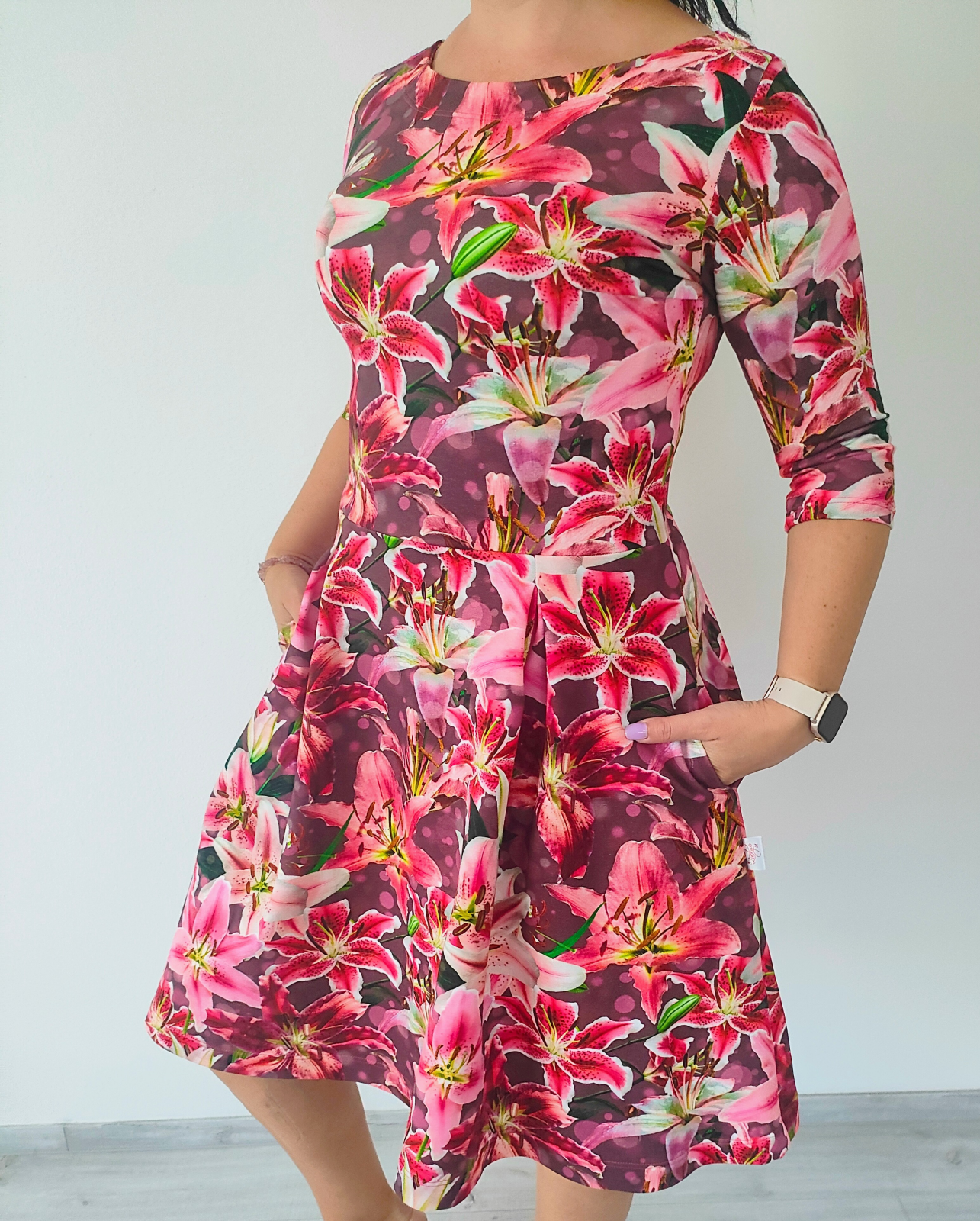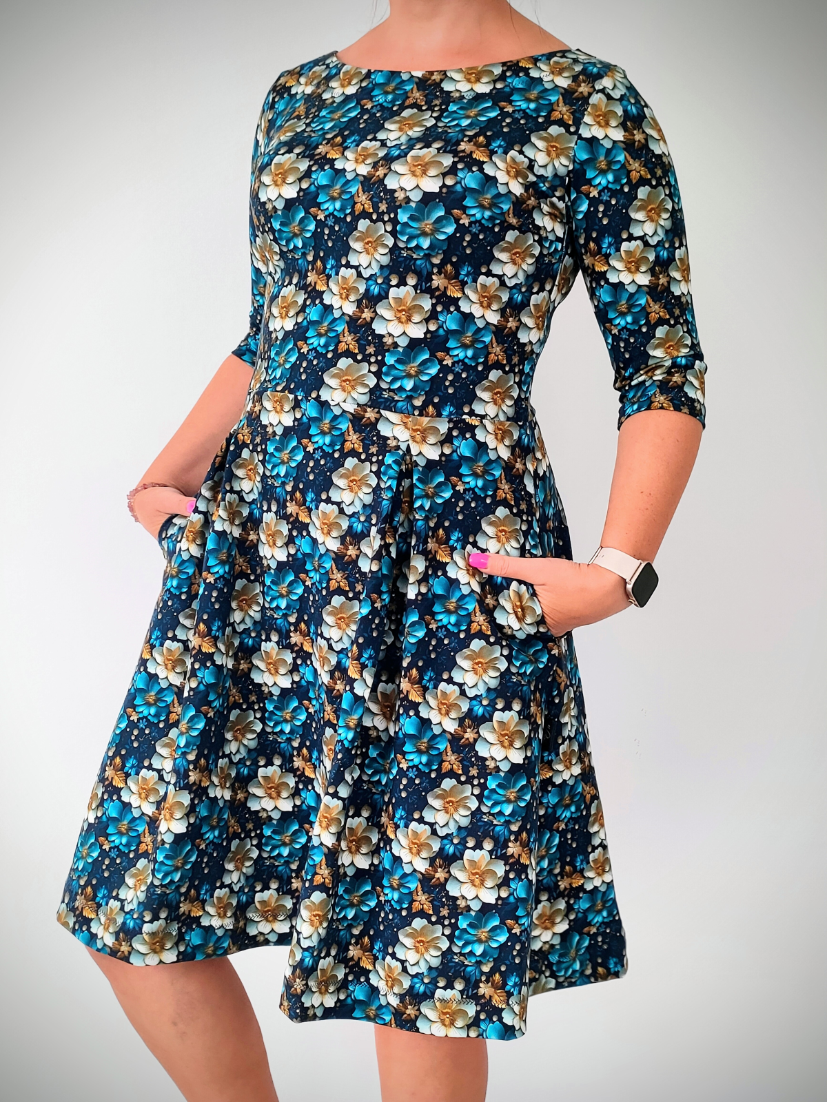 „Jsem moc spokojená! Videonávod je super a střih krásně sedí! Rukávy a kapsy jsem vynechala a sklady na sukni sešila po délce. Určitě budu šít do svého šatníku další.“