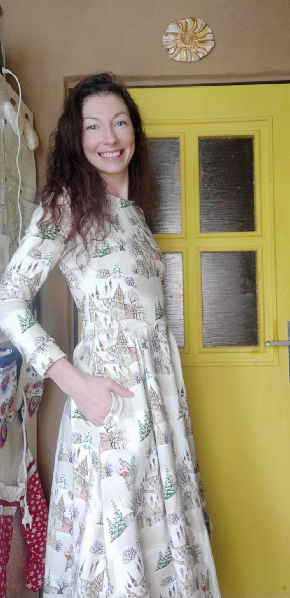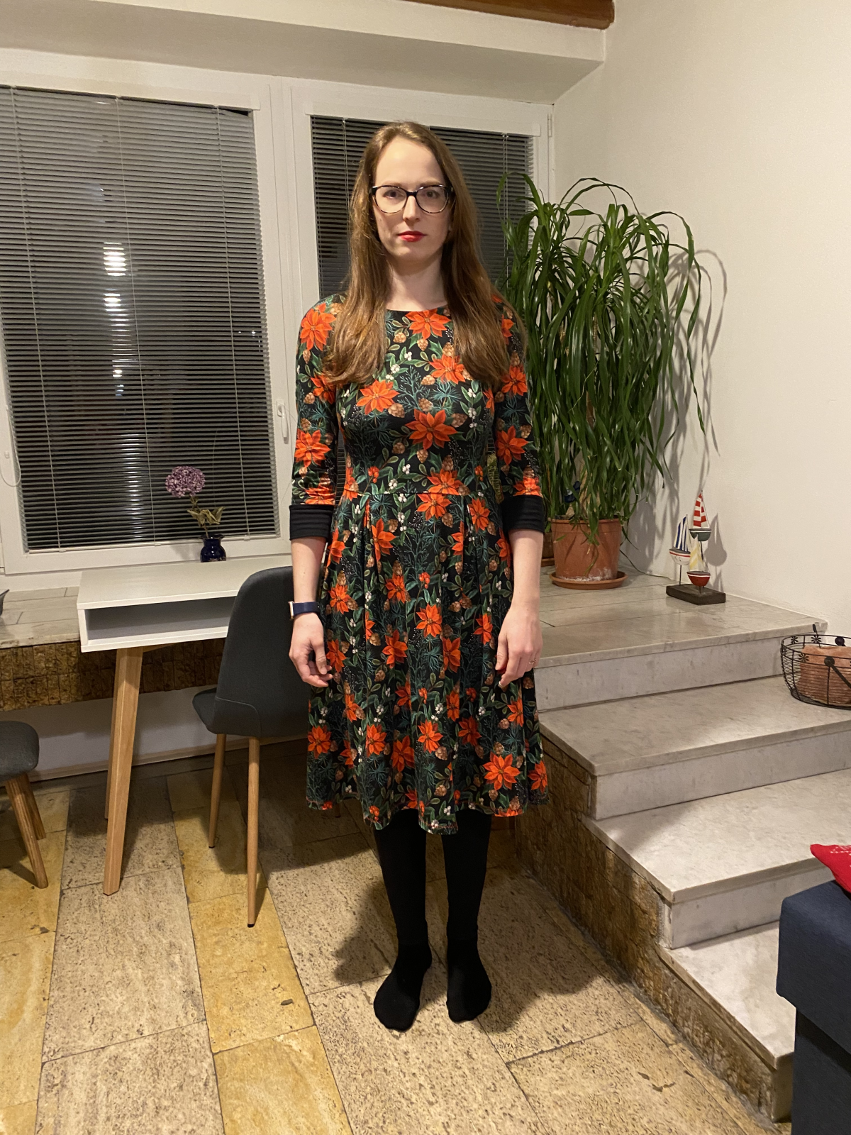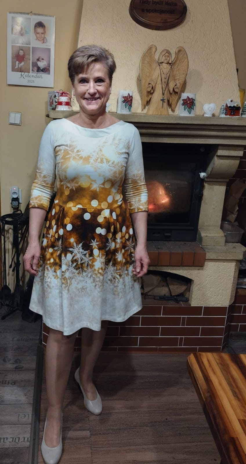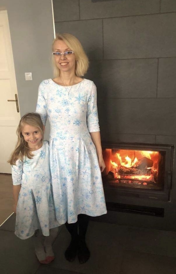 „Šaty jsem šila poprvé. Velmi mi pomohl videonavod a skvělé jsou sesazovaci značky. Díky jim jsem neprehodila rukav, což se mi málem přihodilo. Šilo se mi dobře, leč pomalu, abych neudělala chybu. Pro opatrnost jsem šila 42, ale pak životek trochu projmula po vyzkoušení,zbytek steihla ve 42.Po celem usiti jsou šaty trošku větší než se mi zprvu zdálo. Příště rovnou zvolím 40. Vychazela mi podle tabulek na moji postavu ale když jsem měřila strih a jiné moje šaty, zdal se mi maly a raději strihla 42. Rukavy jsem strihla delší a zakoncila sirokym lemem, aby byly spise 3/4. Měla jsem 2,5m šíře 165cm a vyšlo mi na moje šaty, pak holcickam jednodušší podle vlastního strihu dle saticek a nakonec ještě vyzbylo pro chlapa, ikdyž jen kousek. V kombinaci s jednobarevkou je triko skvělé a máme nejen Vánoční rodinný set. Díky za motivaci, chytlo mne to. Původně jsem chtěla jen šaty pro sebe😁“