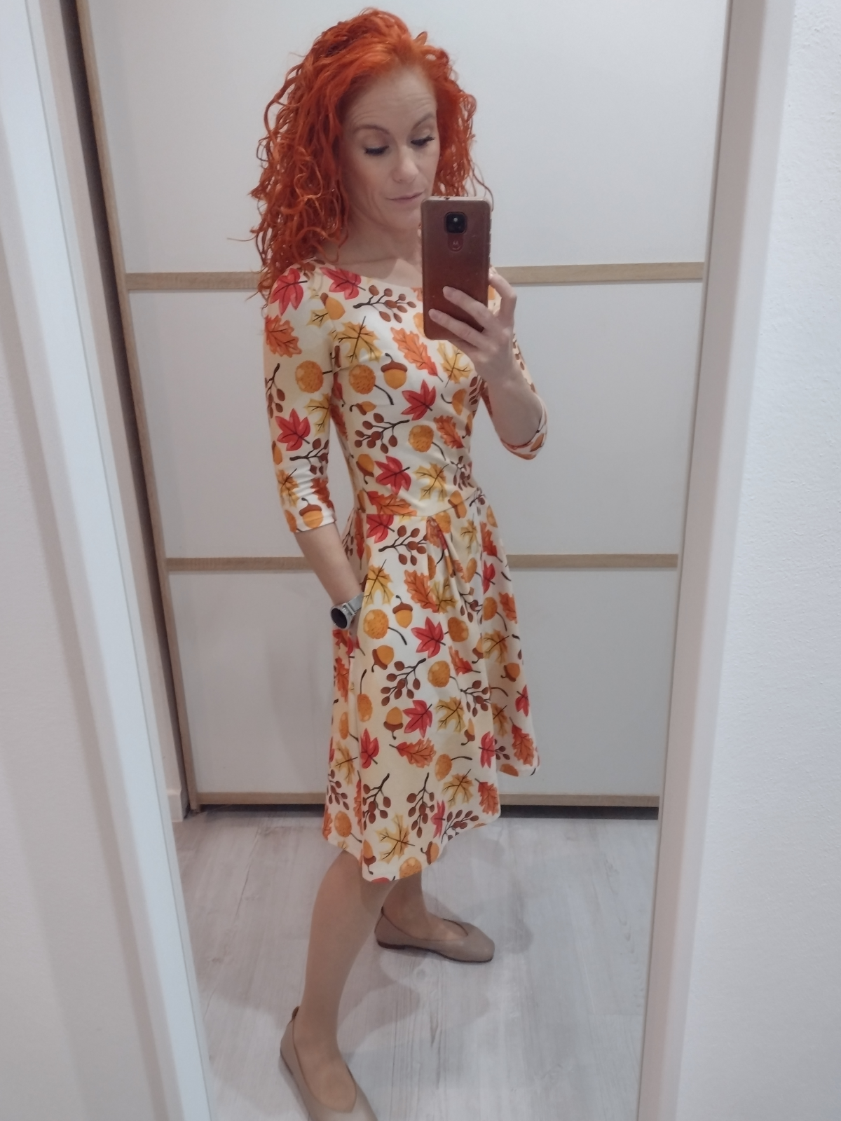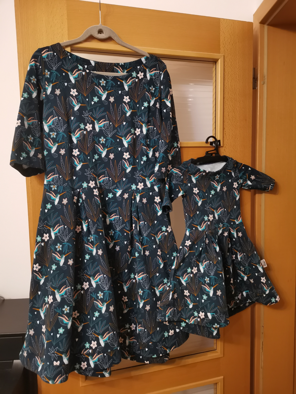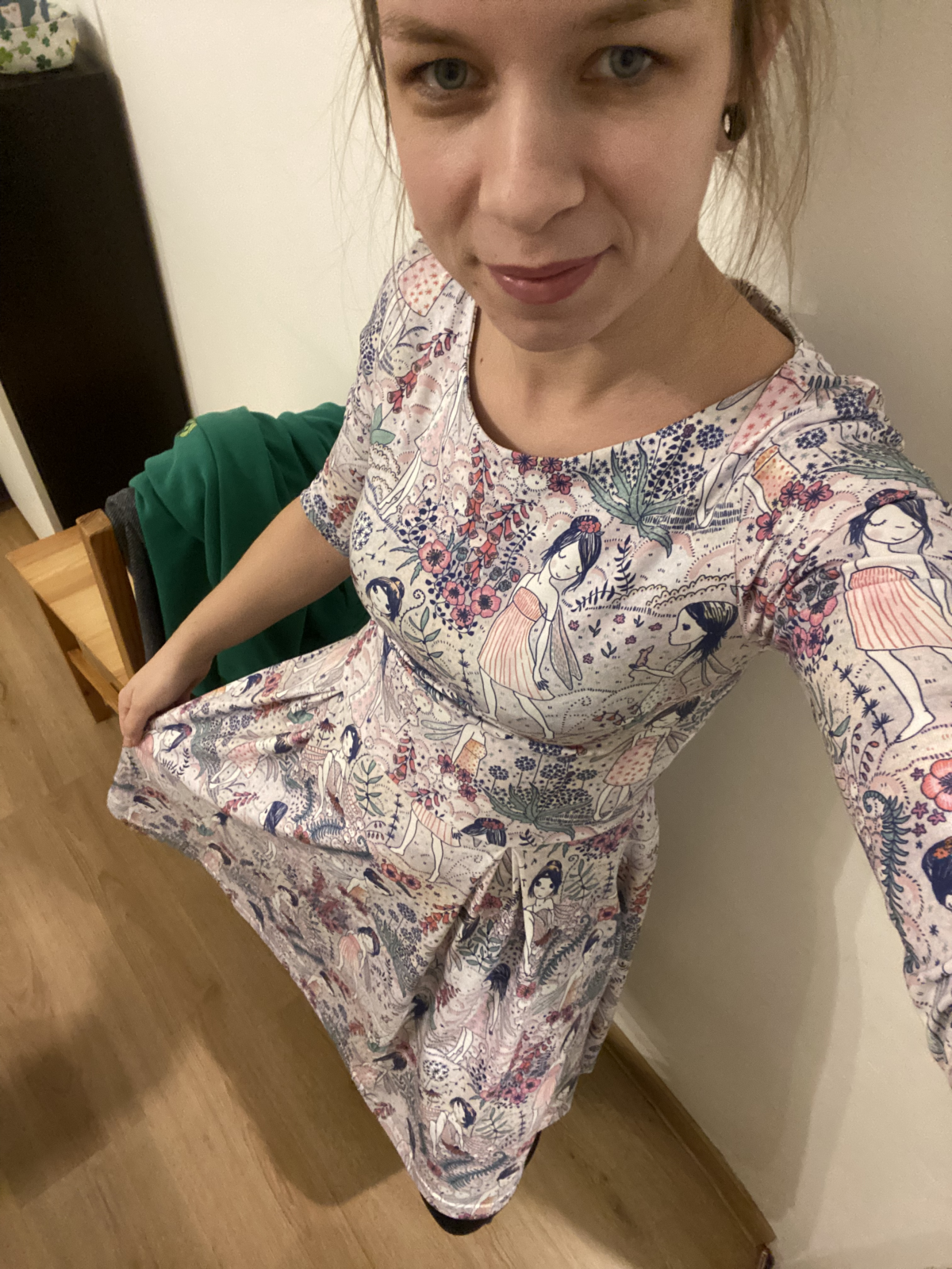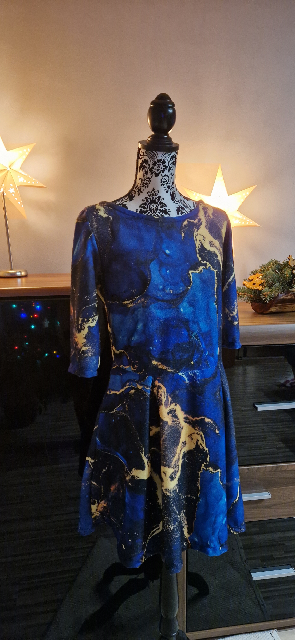 „Šaty jsem šila poprvé. Velmi mi pomohl videonavod a skvělé jsou sesazovaci značky. Díky jim jsem neprehodila rukav, což se mi málem přihodilo. Šilo se mi dobře, leč pomalu, abych neudělala chybu. Pro opatrnost jsem šila 42, ale pak životek trochu projmula po vyzkoušení,zbytek steihla ve 42.Po celem usiti jsou šaty trošku větší než se mi zprvu zdálo. Příště rovnou zvolím 40. Vychazela mi podle tabulek na moji postavu ale když jsem měřila strih a jiné moje šaty, zdal se mi maly a raději strihla 42. Rukavy jsem strihla delší a zakoncila sirokym lemem, aby byly spise 3/4. Měla jsem 2,5m šíře 165cm a vyšlo mi na moje šaty, pak holcickam jednodušší podle vlastního strihu dle saticek a nakonec ještě vyzbylo pro chlapa, ikdyž jen kousek. V kombinaci s jednobarevkou je triko skvělé a máme nejen Vánoční rodinný set. Díky za motivaci, chytlo mne to. Původně jsem chtěla jen šaty pro sebe😁“