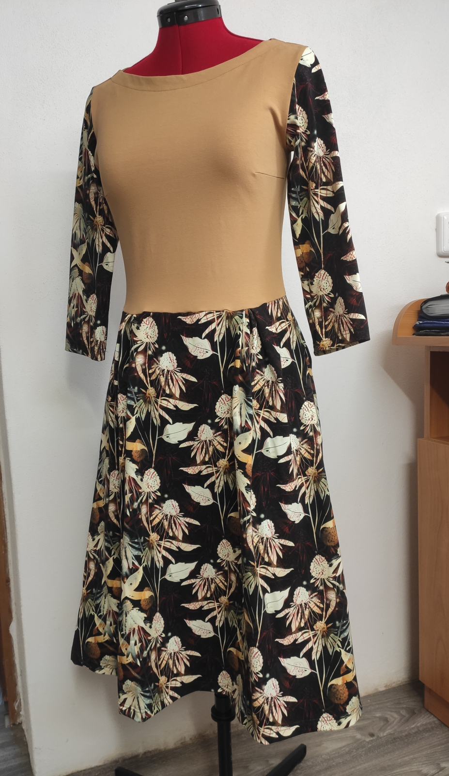 Střih byl konstruován pro pružnou teplákovinu s elastanem. Teplákovina je trochu pevnější než úplet. Zákaznice šaty s úspěchem šijí i z úpletu. Tady bych sáhla raději po nějakém s vyšší gramáží, ať se nevytáhne živůtek pod tíhou sukně. Některé odvážné zákaznice zkoušeli šít šaty i z velmi málo pružné silky (volily o velikost větší střih) a byly spokojené - viz inspirační album. Sama tuto variantu vyzkoušenou nemám.