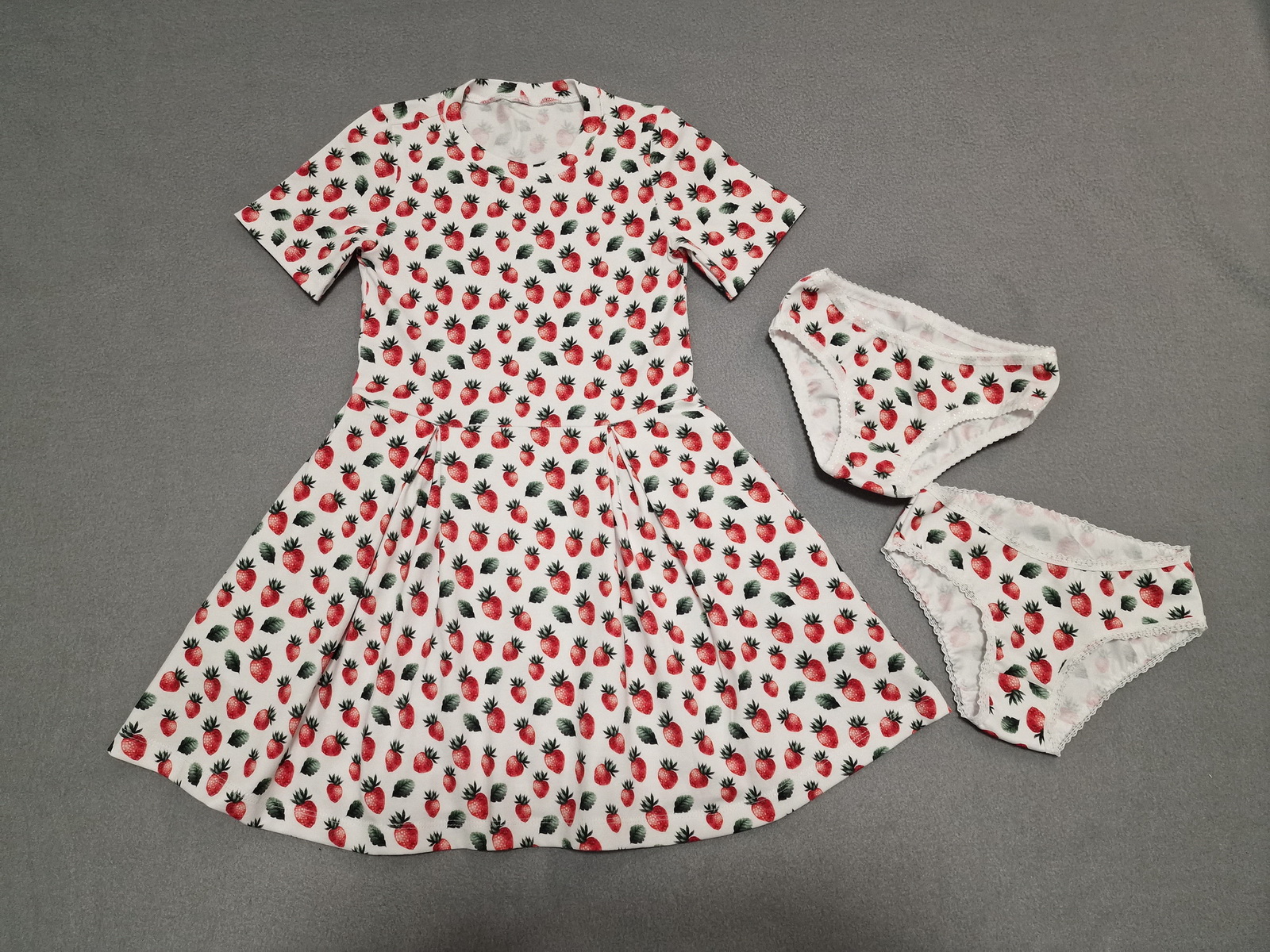 „Se střihem jsem maximálně spokojena, díly na sebe krásně sednou, a ta možnost, zvolit si jak střih vytisknout, to se málokdy vidí a usnadní to práci. Střih jsem mírně upravila, protože jsou to šaty do školky, takže kulatý výstřih lemovaný proužkem na polvinu a zadní díl stejně dlouhý jako přední