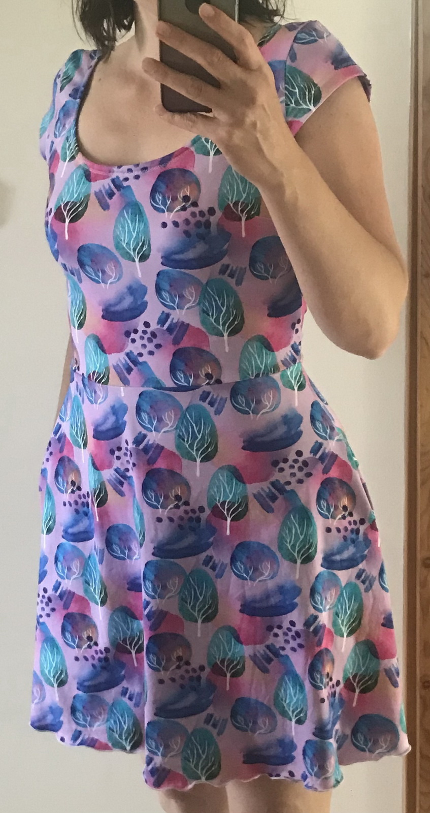 „Krásné šaty ❤️ jen se pořád asi ještě úplně nekamarádím s konfigurací na míru 🙈 navolila jsem si moc hluboký výstřih, takže neplánovaně lemován širokým proužkem na polovinu a krátká sukně, takže jsem poprvé vyzkoušela rolovací steh na OL 😊 a když už jsem byla v tom, tak jsem na rukávech vyzkoušela slepý steh, takže každé zakončení jiné, ale řekla bych, že to nevadí.“