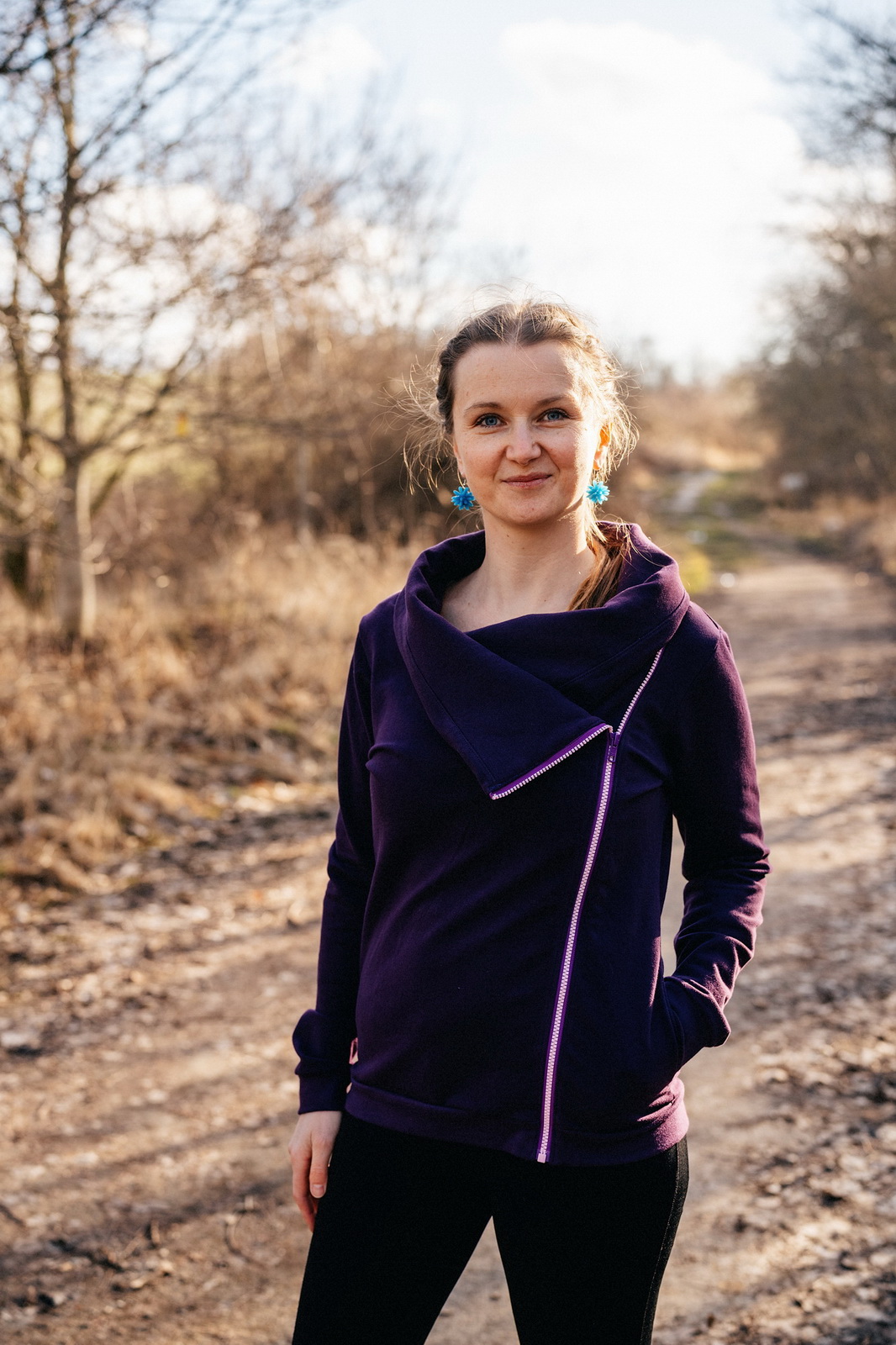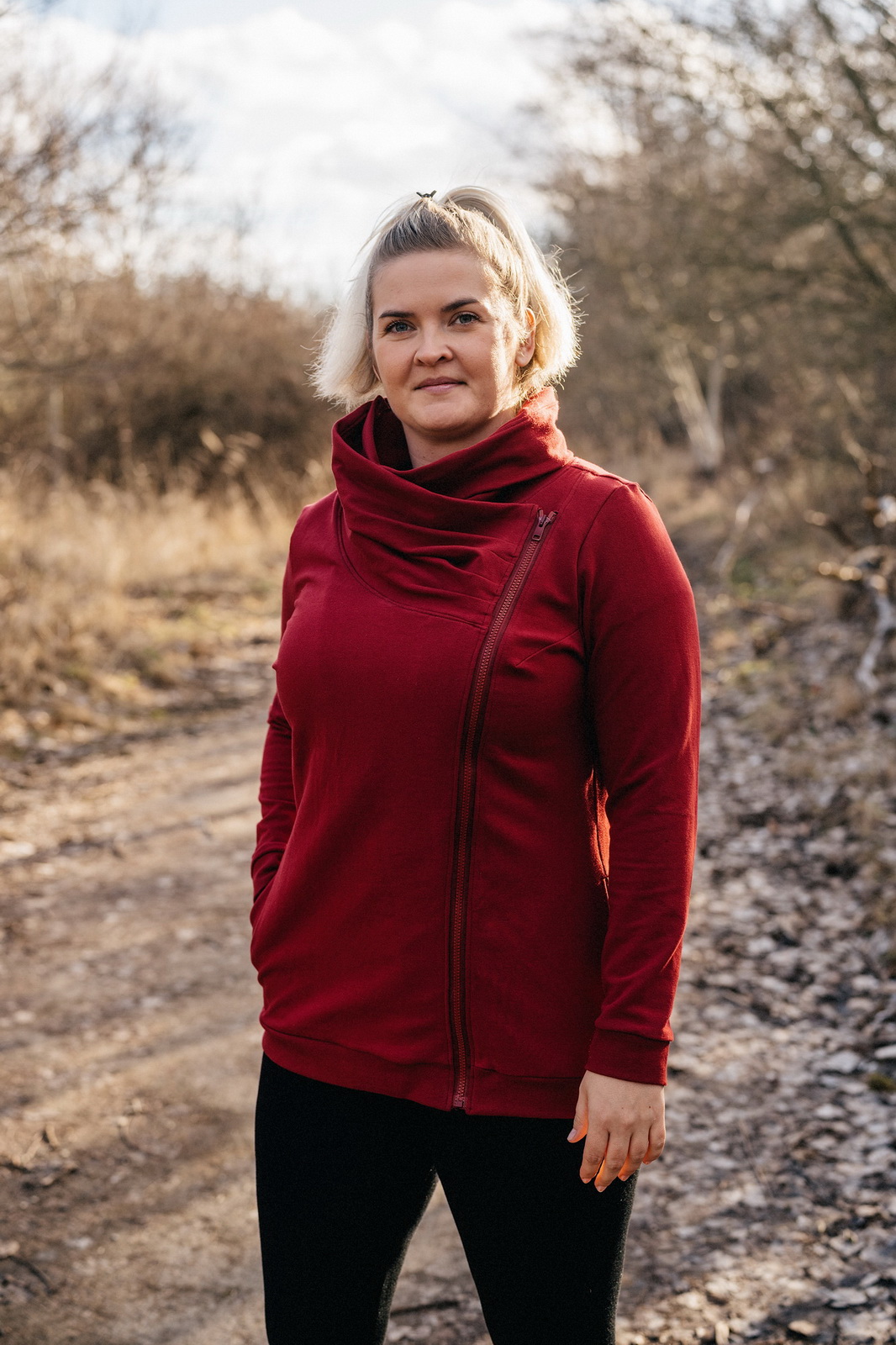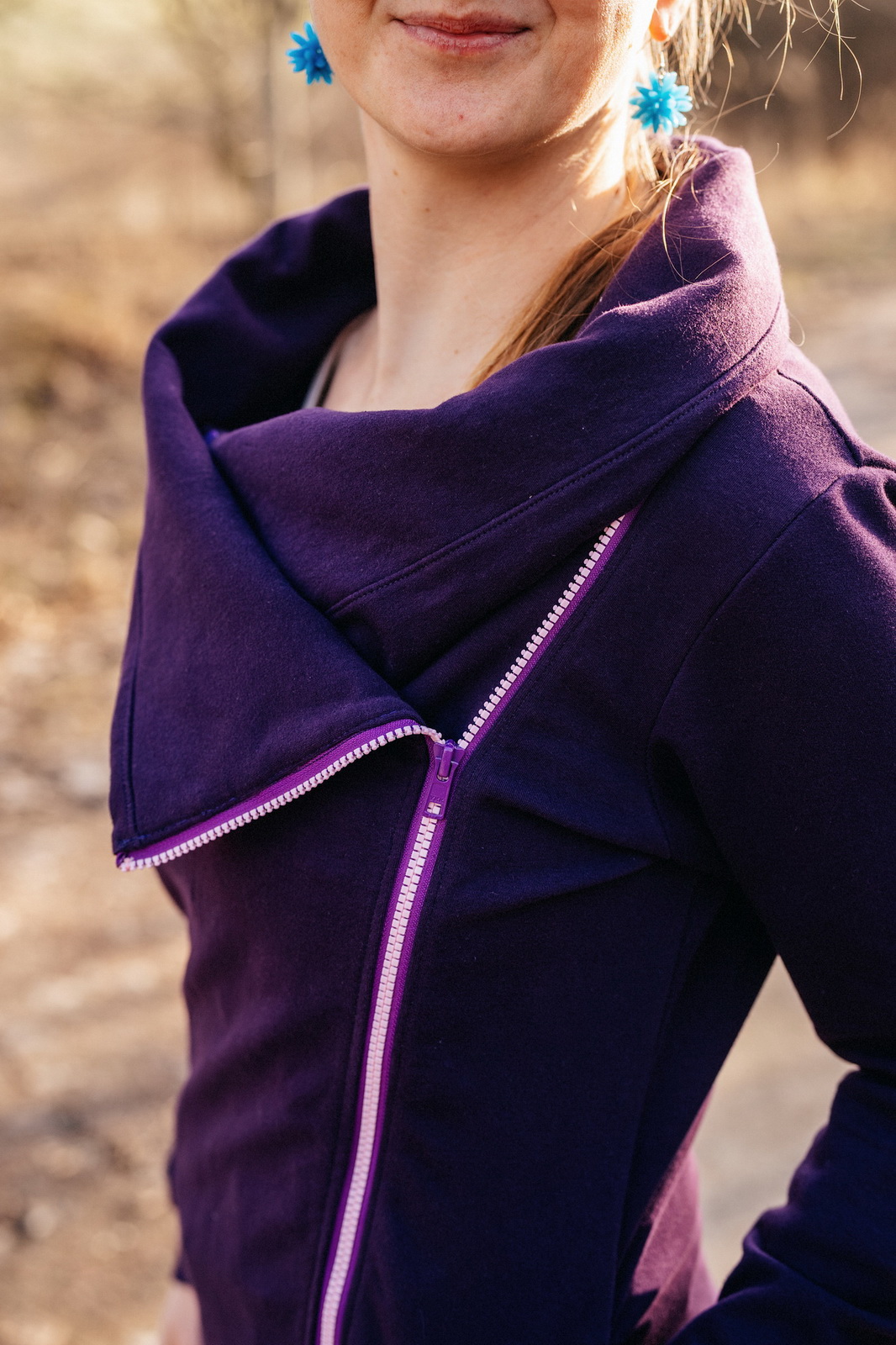 Na začátku byl nápad: mikina s límcem. A co kdyby byl zip asymtrický? A límec skládaný, výrazný? Uděláme z něj TEN límec. Límec, který půjde nosit jako rozhalenka, elegantní prvek i jako útulná skrýš před větrem. A vymazlíme i tu větší velikost, aby z toho nevzniknul neforemný pytel, ale byla to parádnická elegantní mikina. Přidáme prsní záševky! Ať padne přes prsa i v pase. A musí mít kapsy. Má všechno, co jsme si vysnili, ladili jsme jí opravdu dlouho. A tady je!