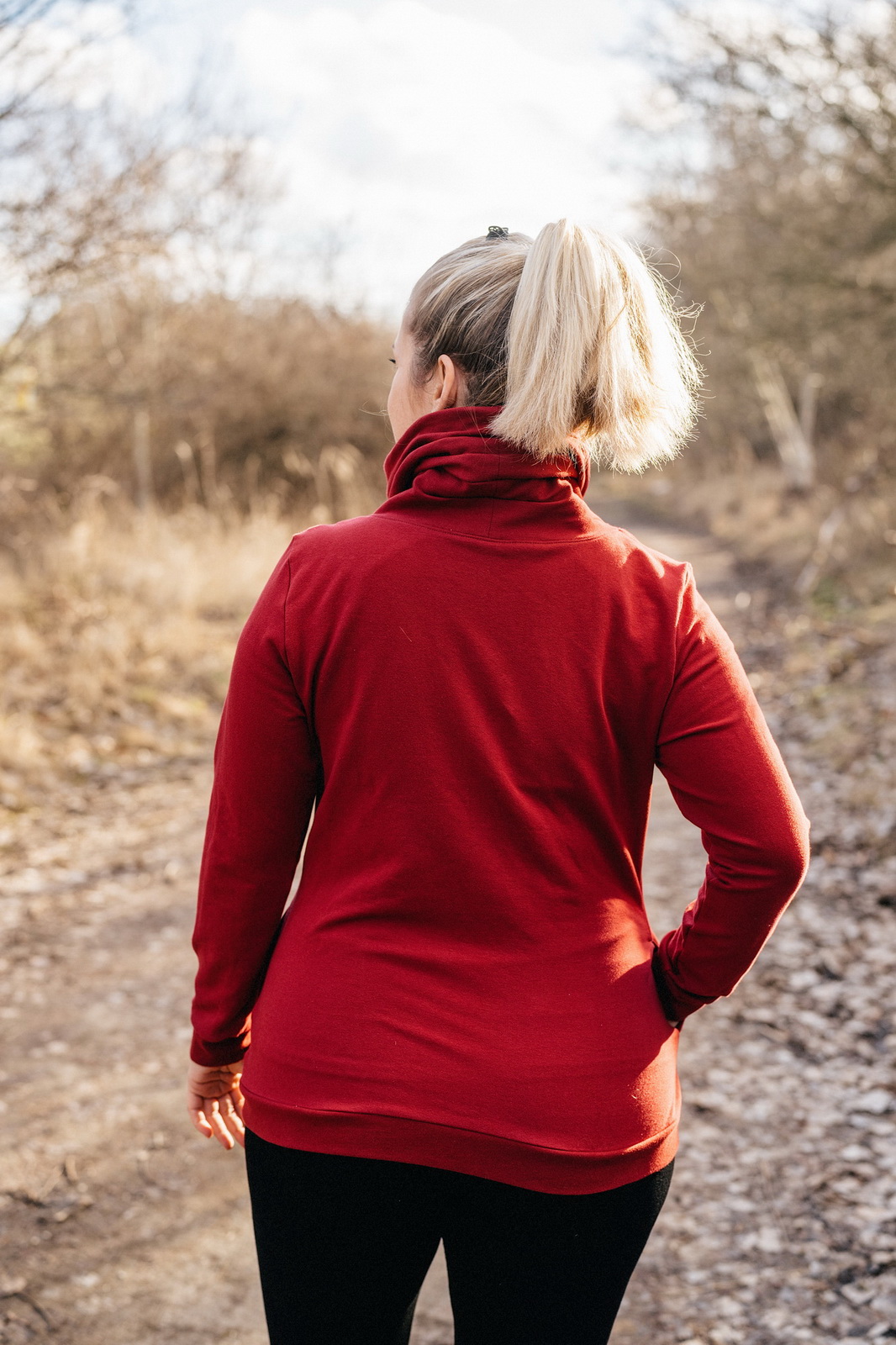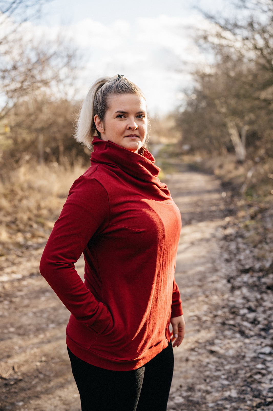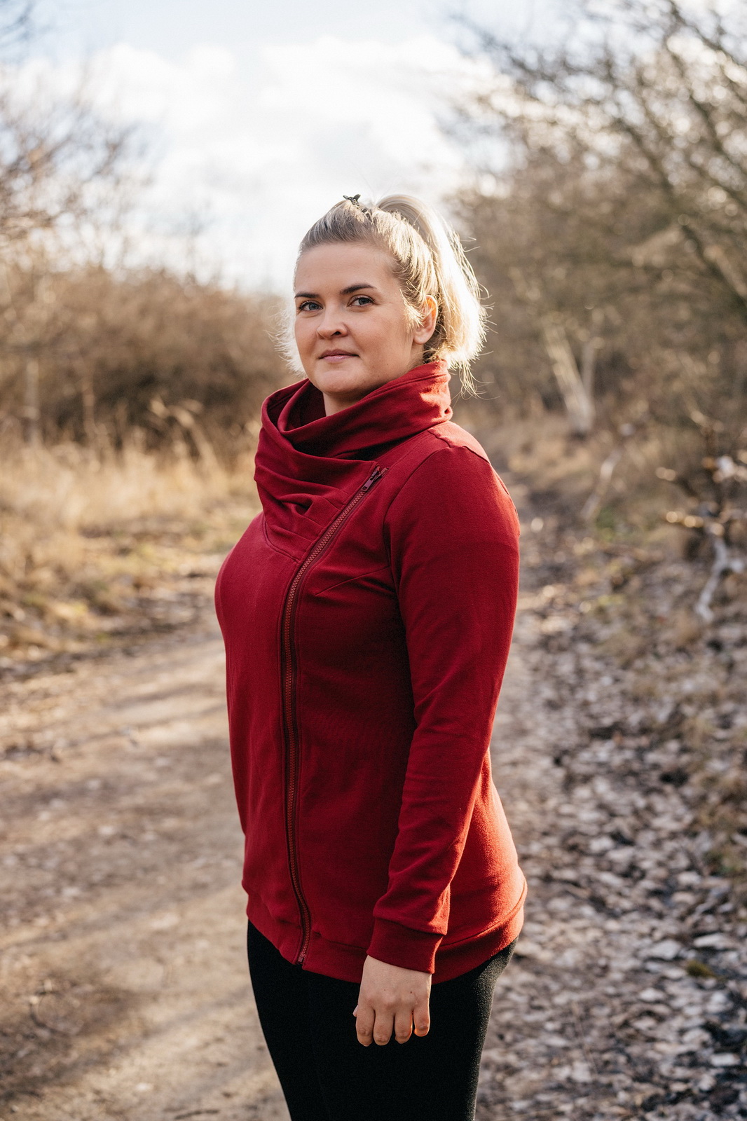 Na začátku byl nápad: mikina s límcem. A co kdyby byl zip asymtrický? A límec skládaný, výrazný? Uděláme z něj TEN límec. Límec, který půjde nosit jako rozhalenka, elegantní prvek i jako útulná skrýš před větrem. A vymazlíme i tu větší velikost, aby z toho nevzniknul neforemný pytel, ale byla to parádnická elegantní mikina. Přidáme prsní záševky! Ať padne přes prsa i v pase. A musí mít kapsy. Má všechno, co jsme si vysnili, ladili jsme jí opravdu dlouho. A tady je!