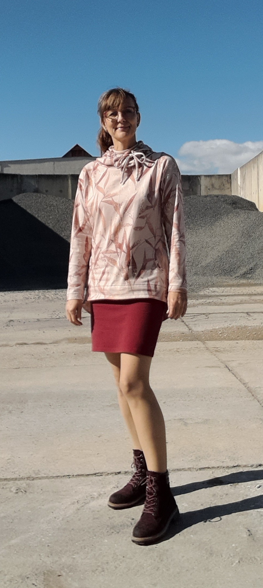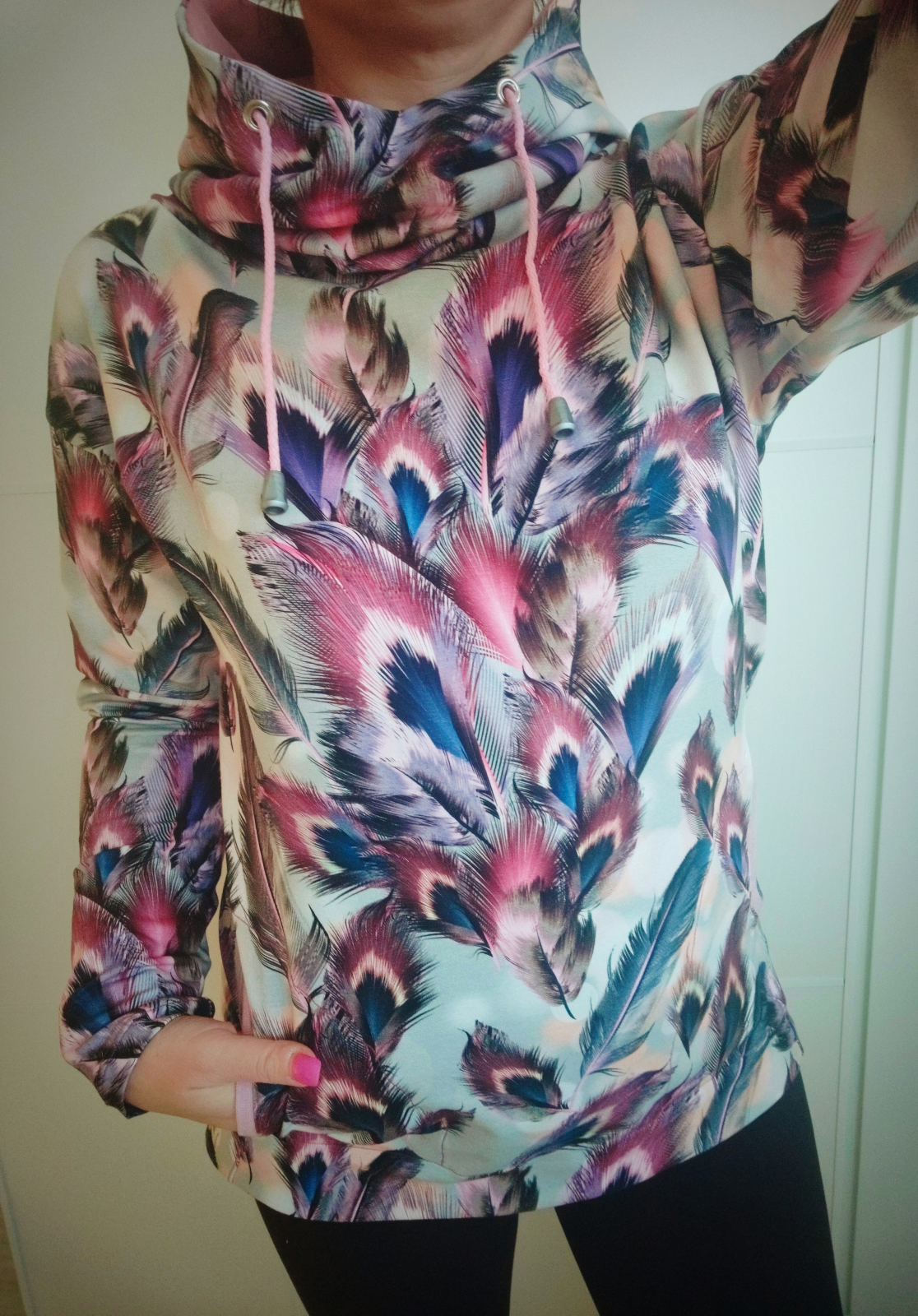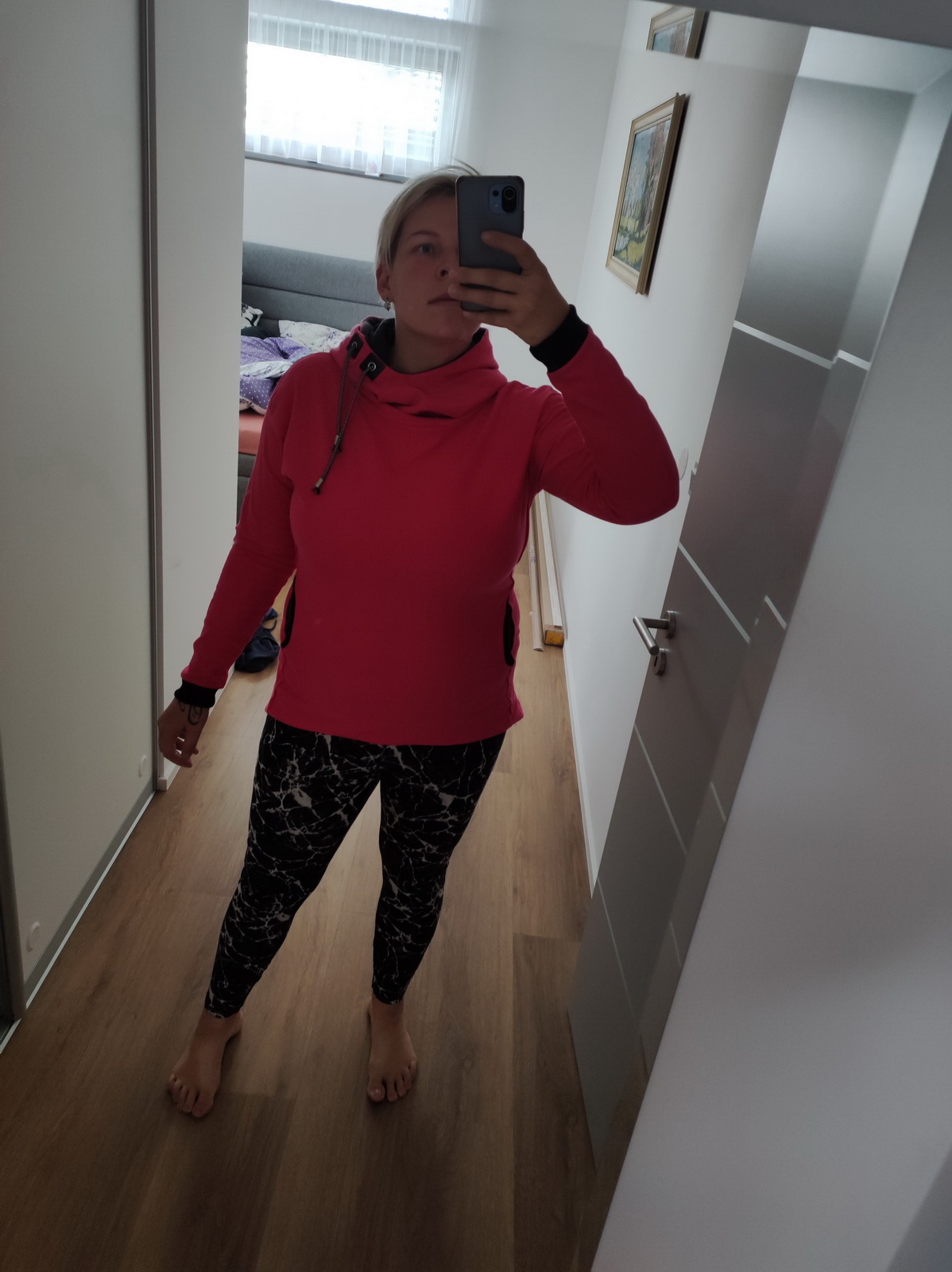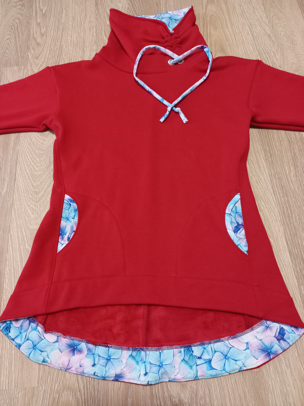 „Mikina se šila dobře. Má krásně velkou kapuci. Při mírách 158 Cm 90-73-90 bych příště zvolila menší velikost nebo zakončila spodek napletem. Necítím se v mikině úplně dobře.“