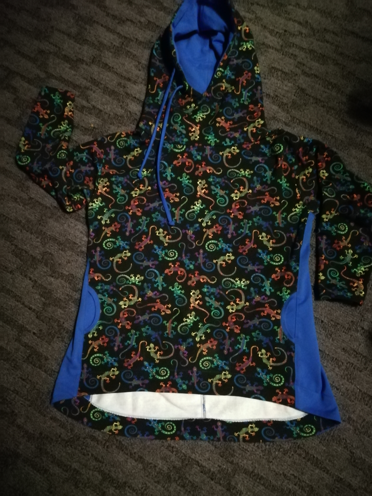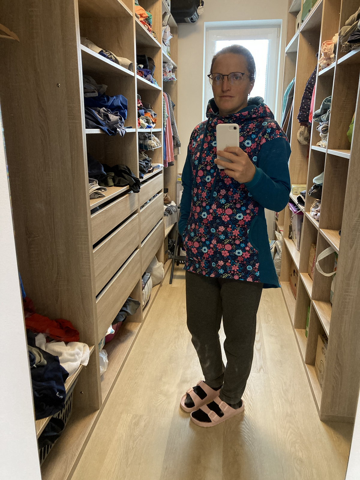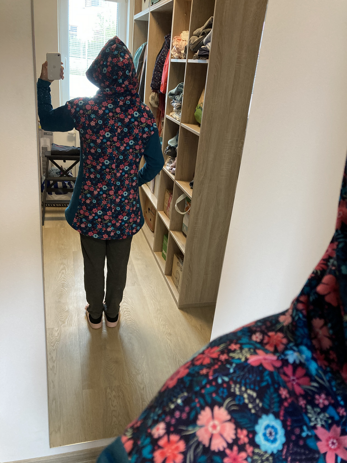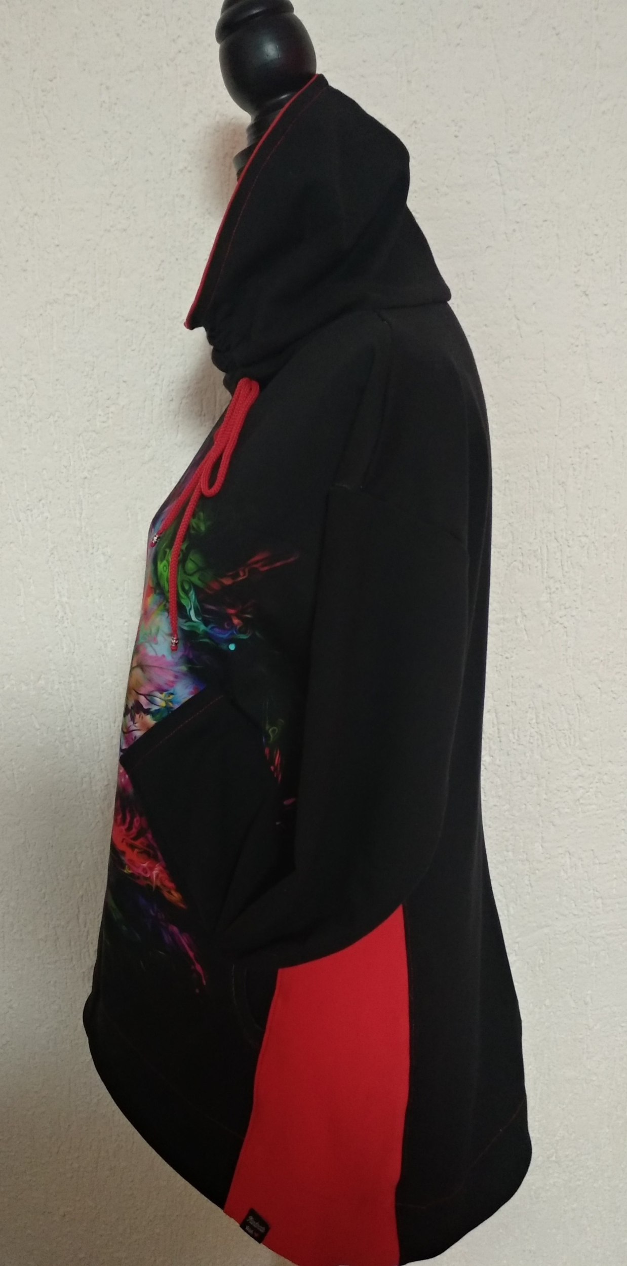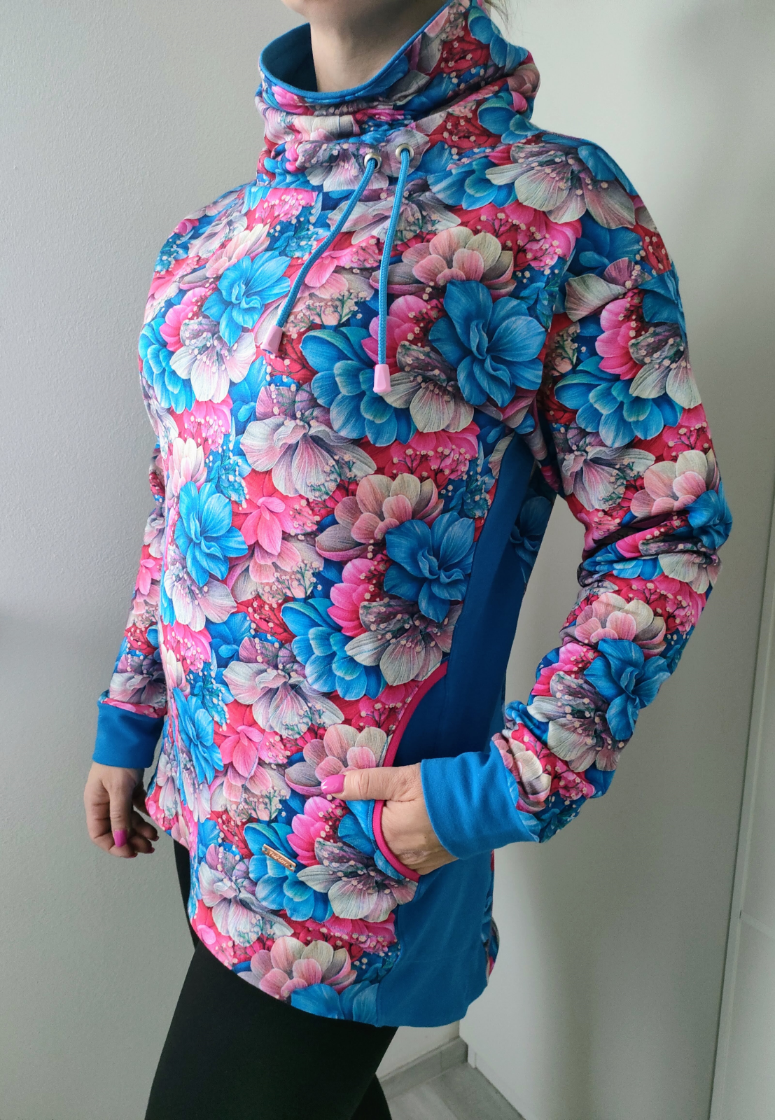 „Mikina se šila dobře. Má krásně velkou kapuci. Při mírách 158 Cm 90-73-90 bych příště zvolila menší velikost nebo zakončila spodek napletem. Necítím se v mikině úplně dobře.“