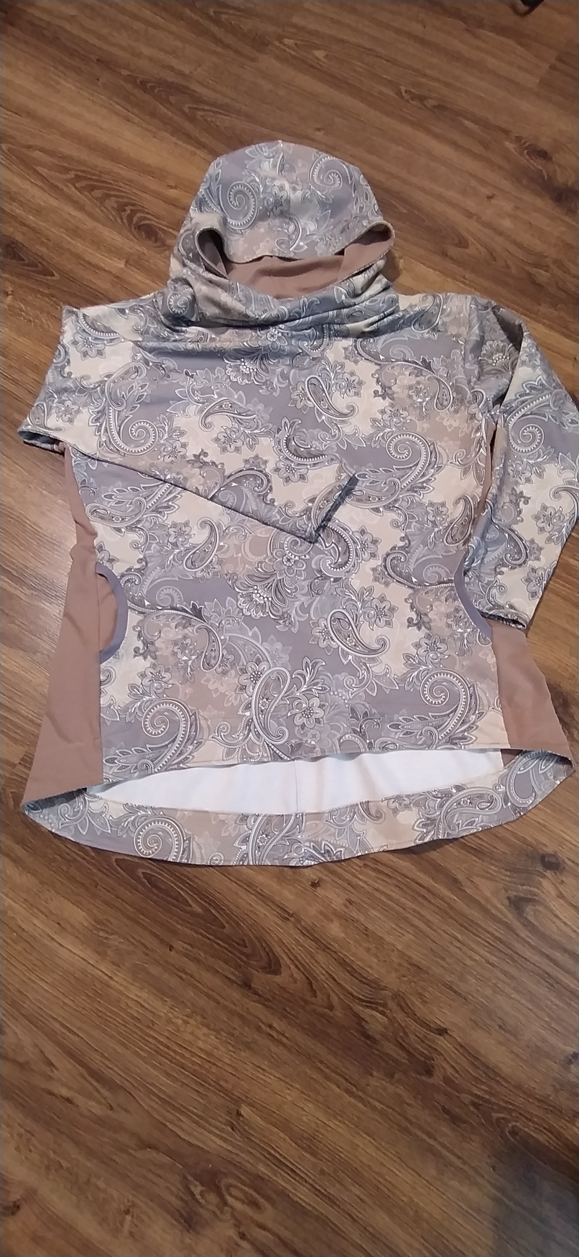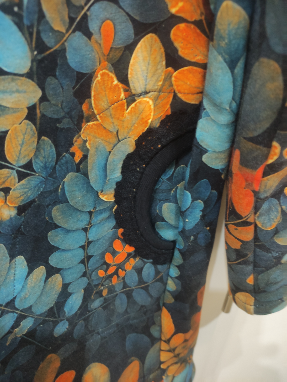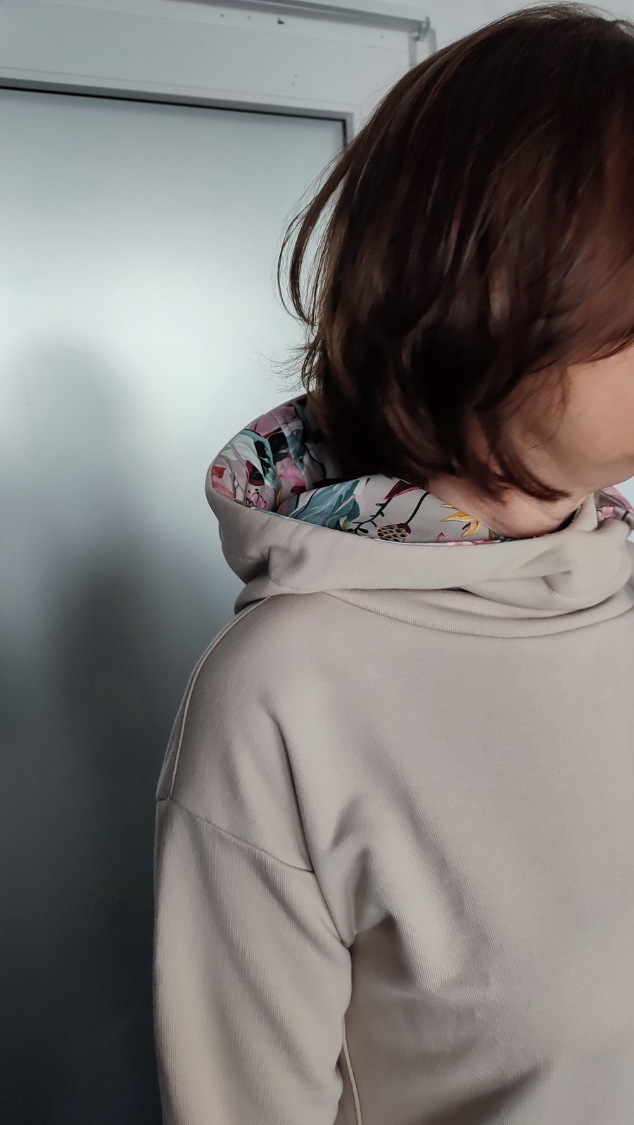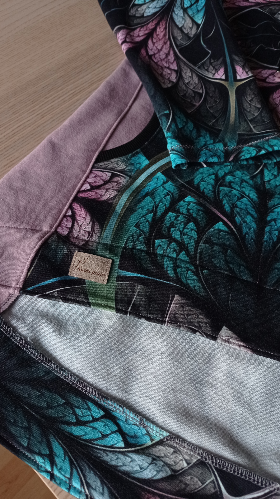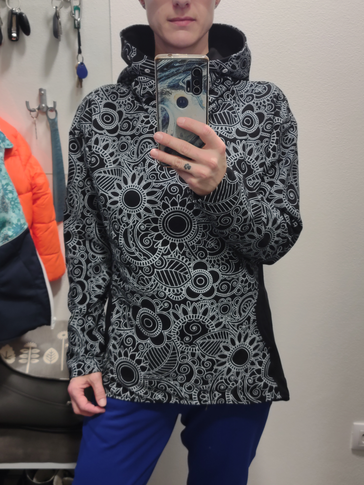 Hodí se především teplákovina s elastanem. Díky volnějšímu střihu můžete použít i vyšší gramáž látky, například počesanou teplákovinu nebo fleece a warmkeeper. Mikina má dost místa na volnost pohybu a to nám dává možnost sáhnout i po méně pružných teplákovinách.
