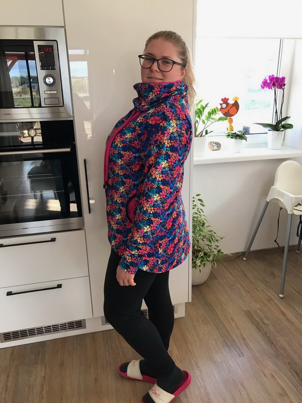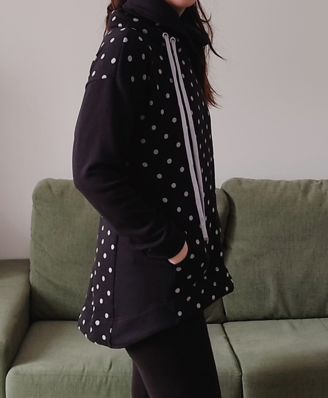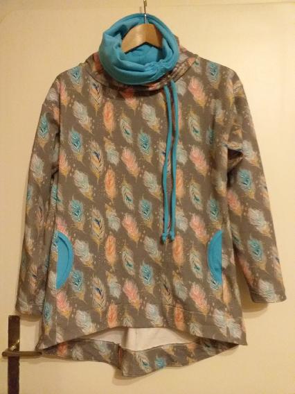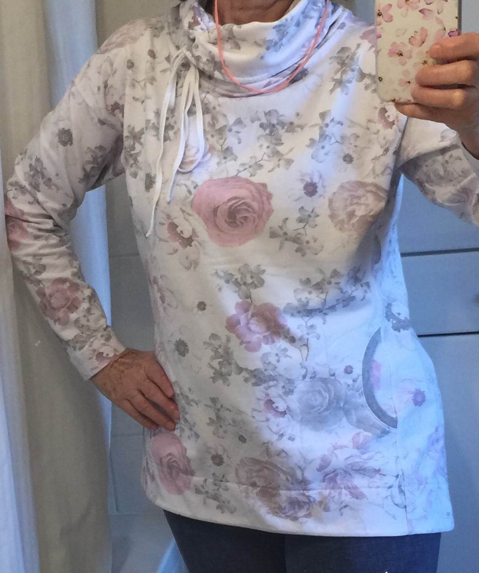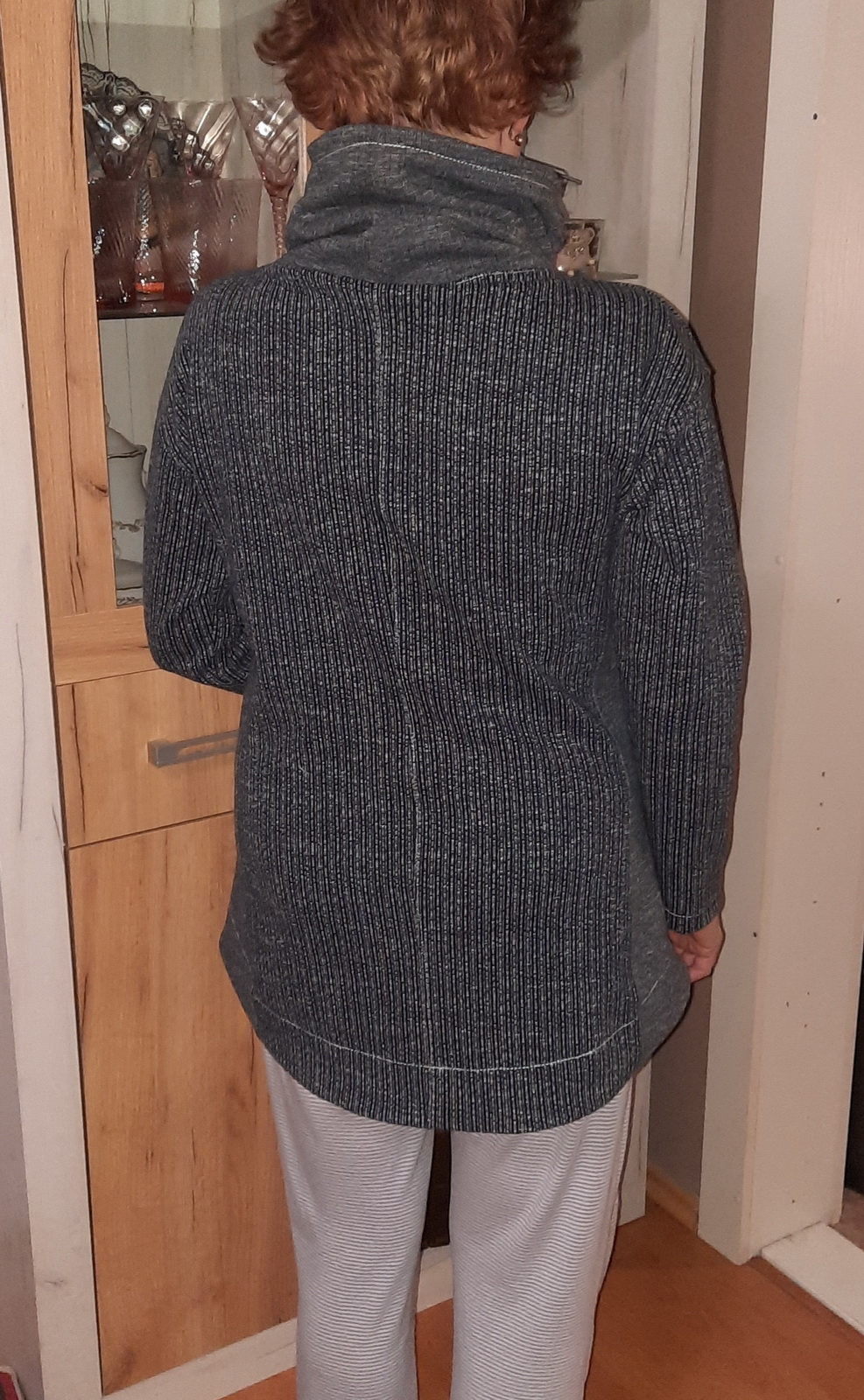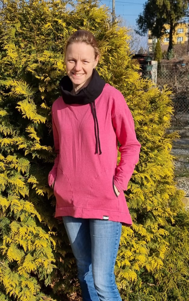 „Je to můj první zkušební vzorek z darových zbytků teplákoviny. Chybělo, takže jsem mikinu pouze podhrnula. Kapsy jsem vynechala, aby mi nezvětšovaly břicho. Zůžila jsem si průkrčník, abych nemusela nosil šátky. Je krásně vypasovaná, takže mi není zima na záda. Závěr: prostě potřebuju další :-D A s videonávodem to byla fakt brnkačka.“