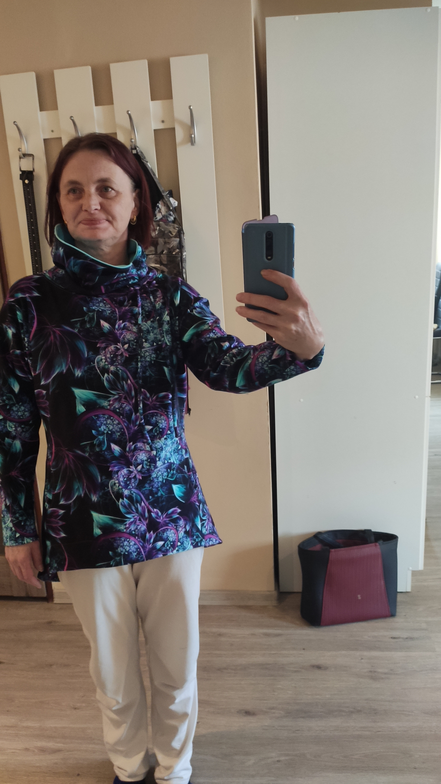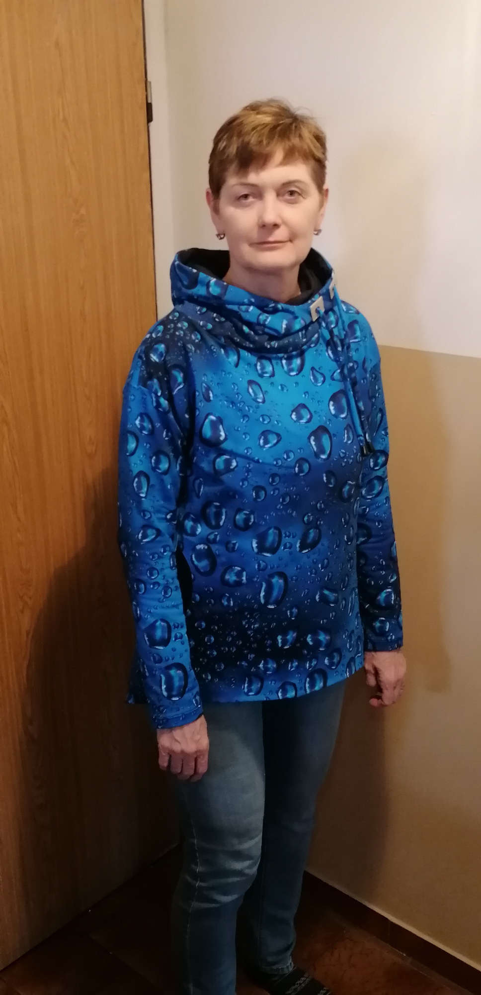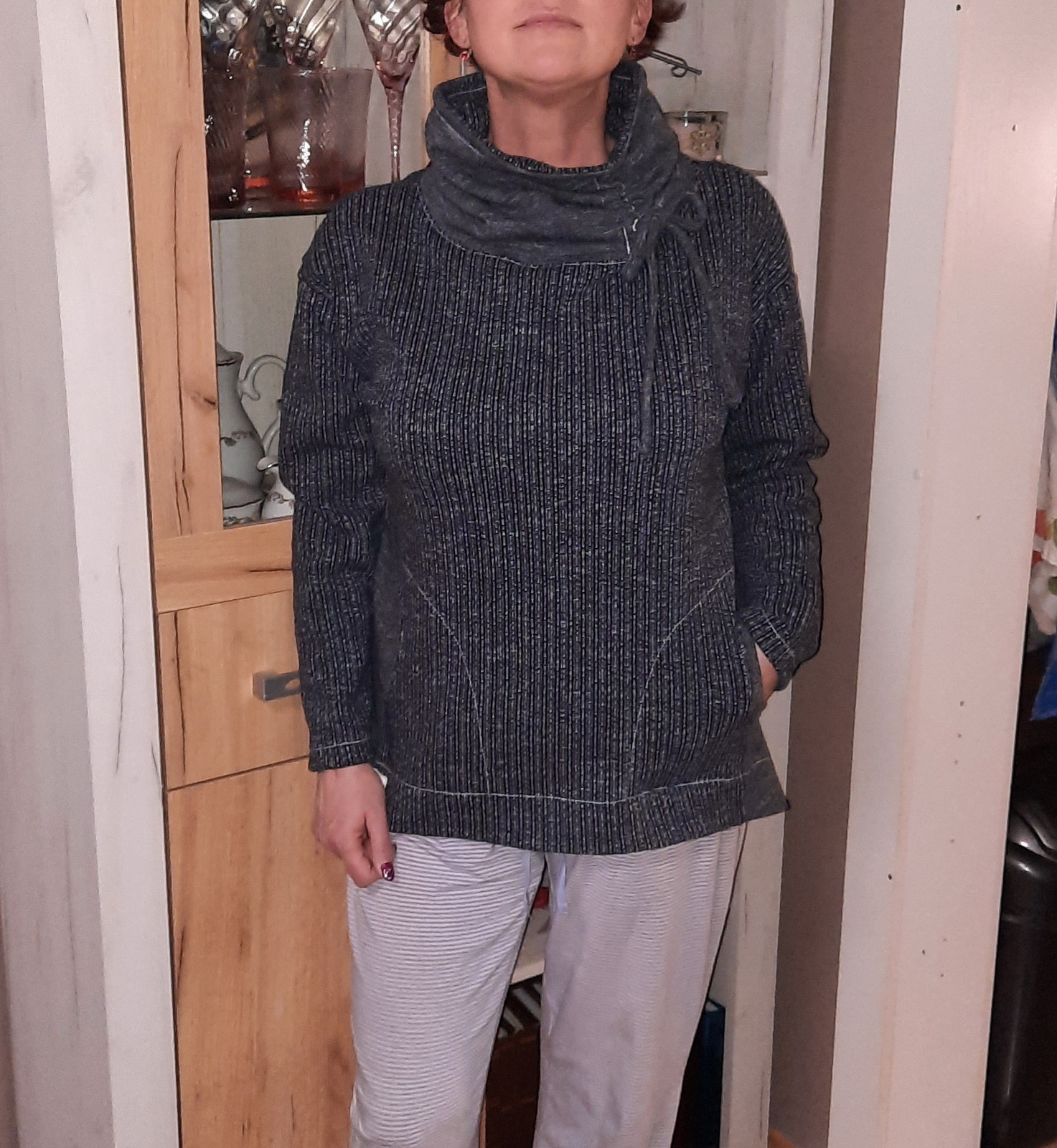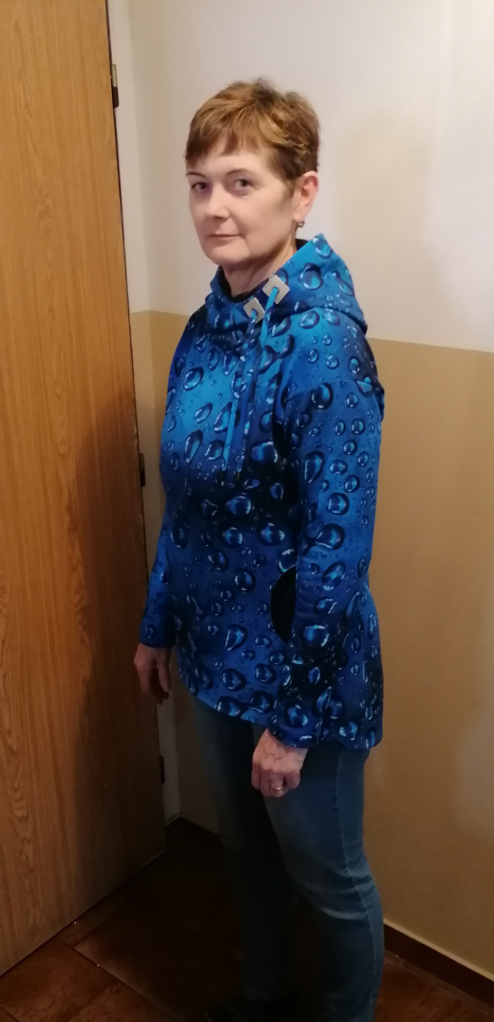 „Je to můj první zkušební vzorek z darových zbytků teplákoviny. Chybělo, takže jsem mikinu pouze podhrnula. Kapsy jsem vynechala, aby mi nezvětšovaly břicho. Zůžila jsem si průkrčník, abych nemusela nosil šátky. Je krásně vypasovaná, takže mi není zima na záda. Závěr: prostě potřebuju další :-D A s videonávodem to byla fakt brnkačka.“