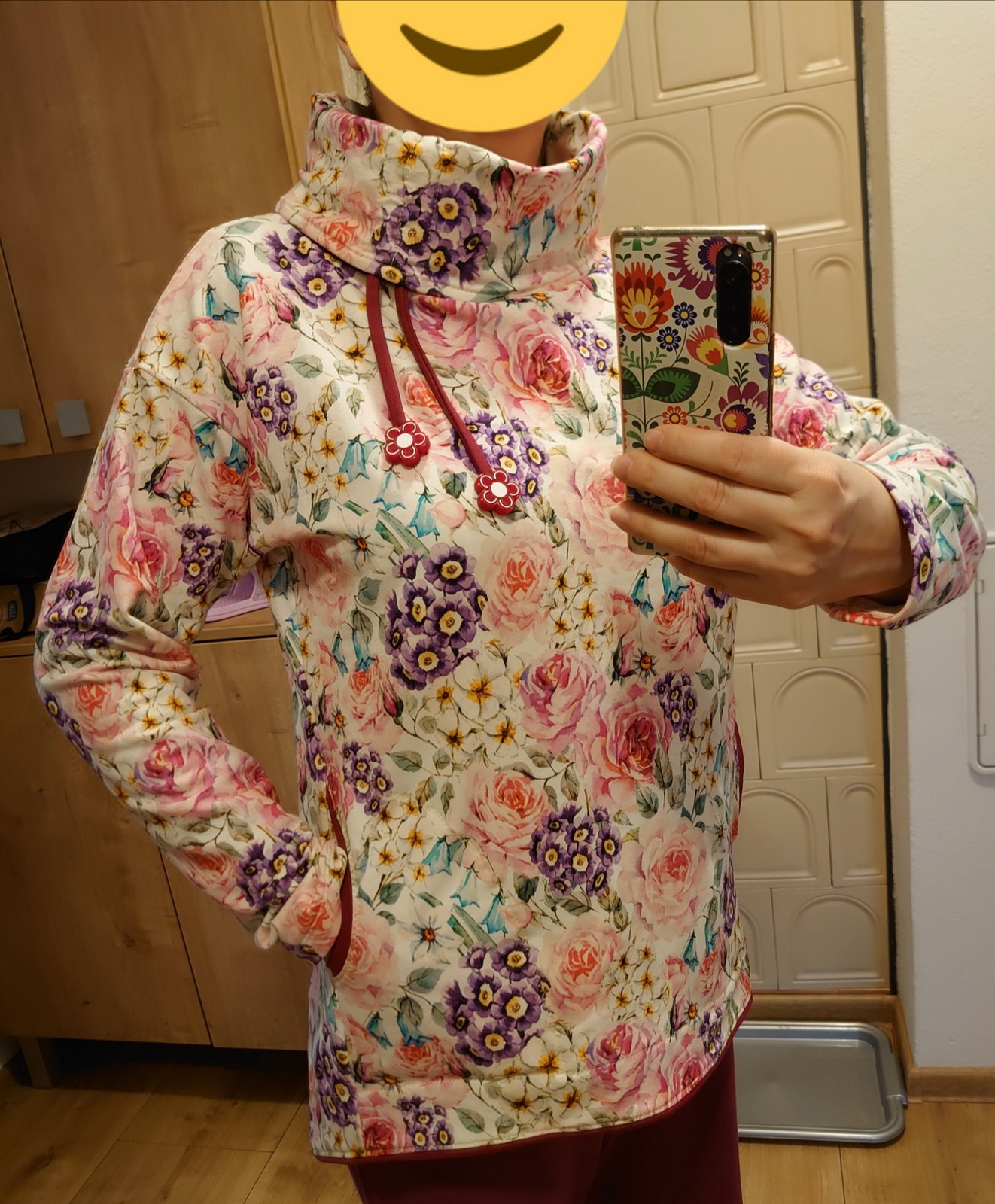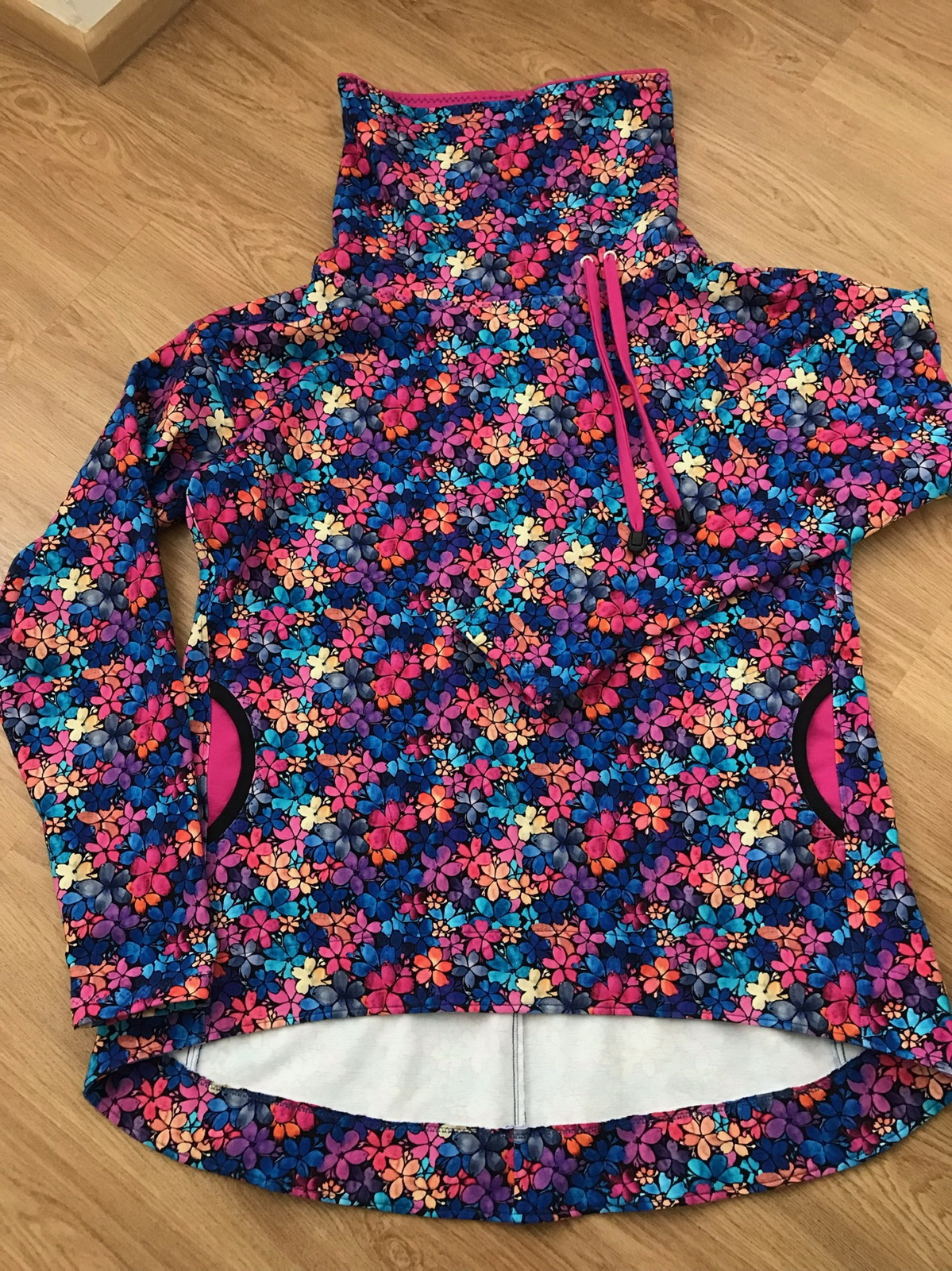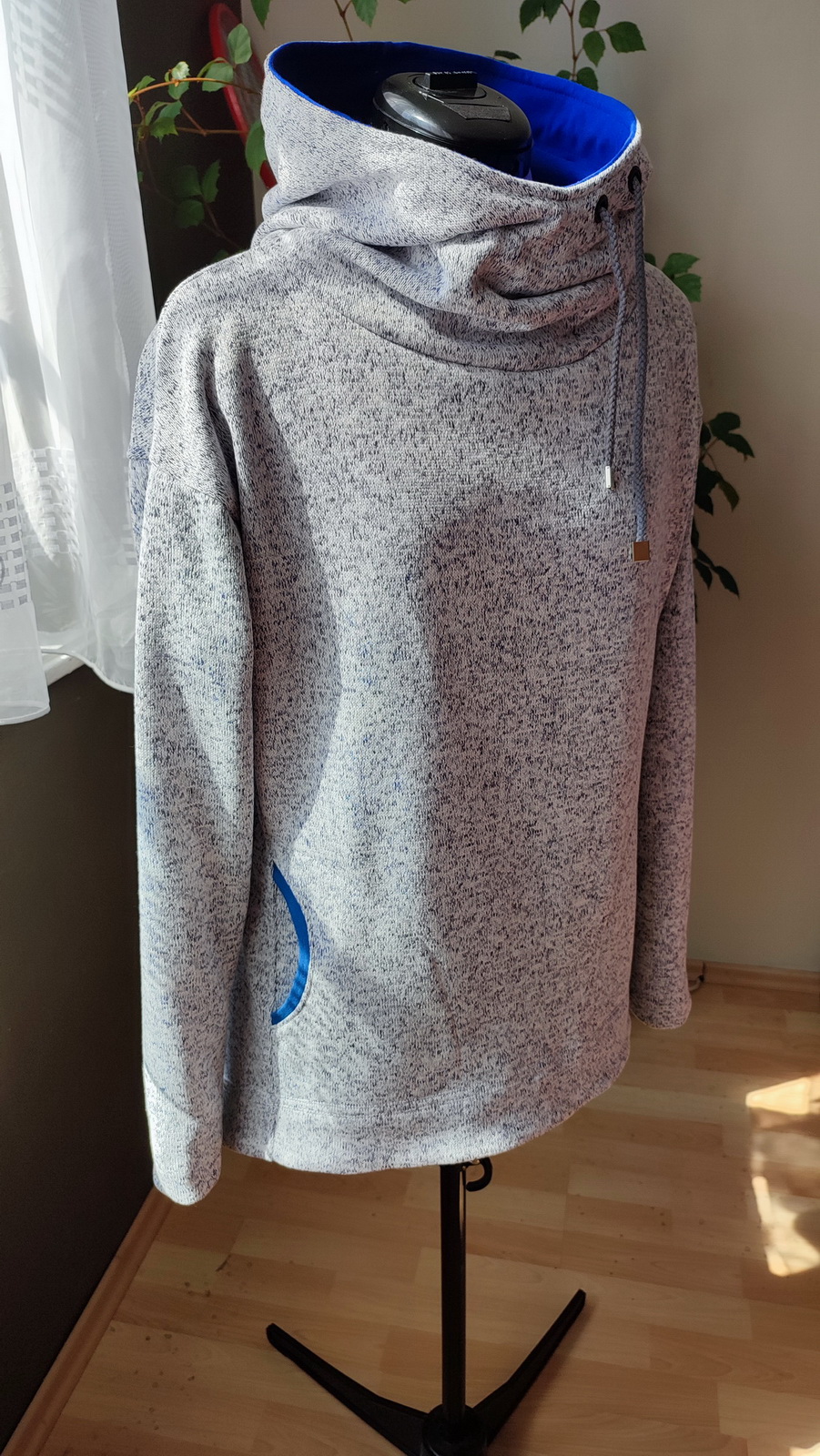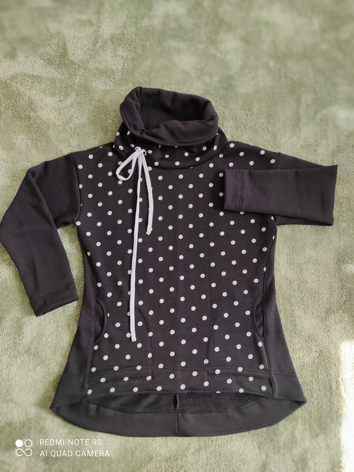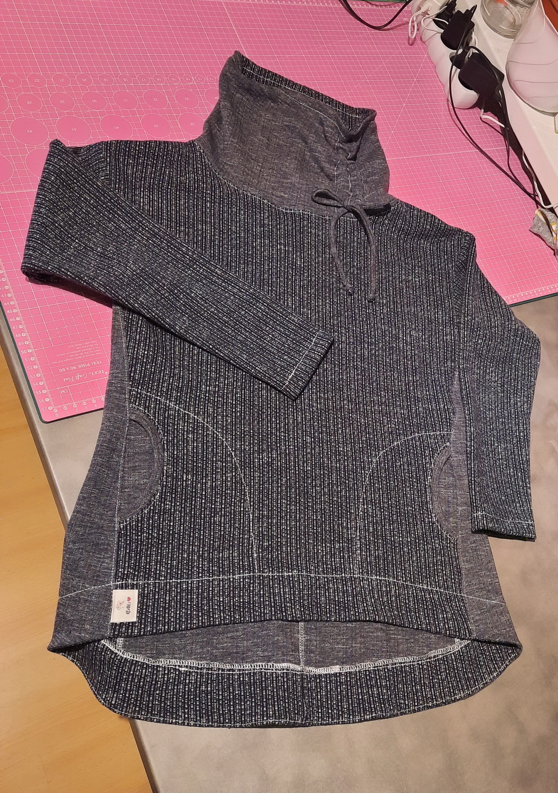 „Je to můj první zkušební vzorek z darových zbytků teplákoviny. Chybělo, takže jsem mikinu pouze podhrnula. Kapsy jsem vynechala, aby mi nezvětšovaly břicho. Zůžila jsem si průkrčník, abych nemusela nosil šátky. Je krásně vypasovaná, takže mi není zima na záda. Závěr: prostě potřebuju další :-D A s videonávodem to byla fakt brnkačka.“