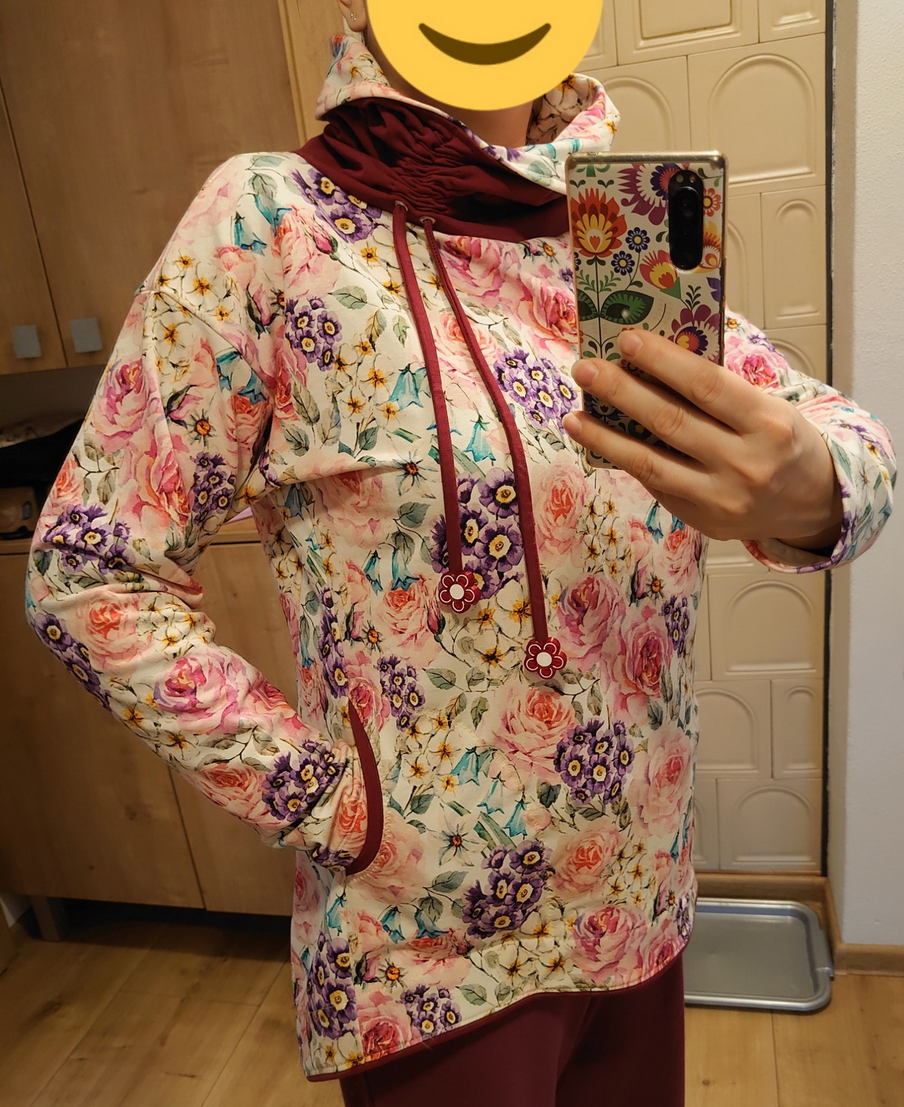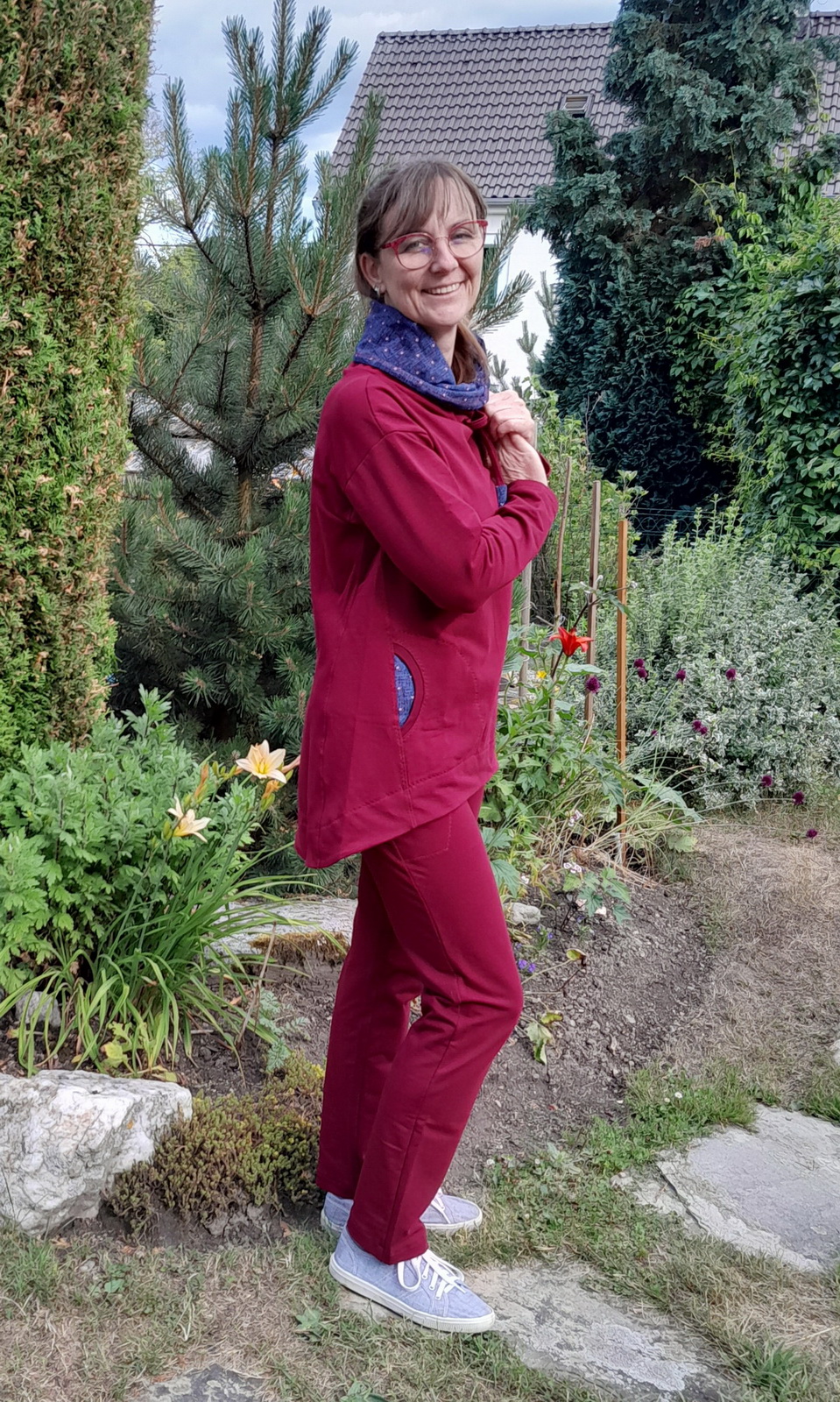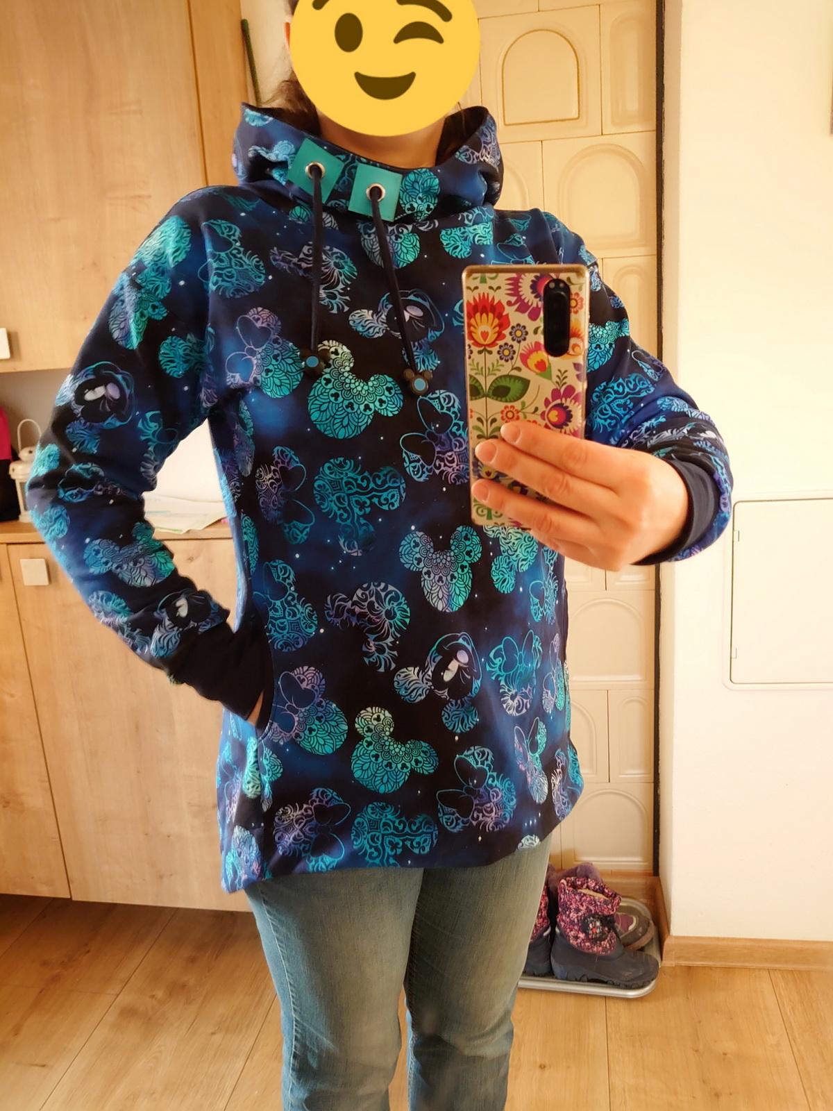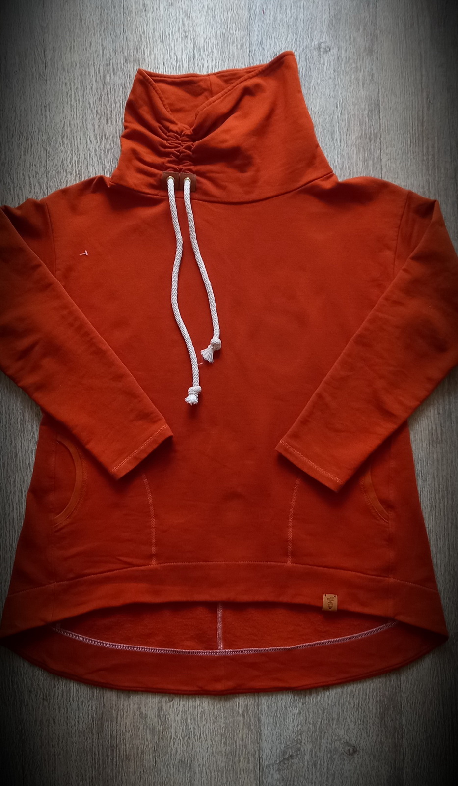 „Je to můj první zkušební vzorek z darových zbytků teplákoviny. Chybělo, takže jsem mikinu pouze podhrnula. Kapsy jsem vynechala, aby mi nezvětšovaly břicho. Zůžila jsem si průkrčník, abych nemusela nosil šátky. Je krásně vypasovaná, takže mi není zima na záda. Závěr: prostě potřebuju další :-D A s videonávodem to byla fakt brnkačka.“