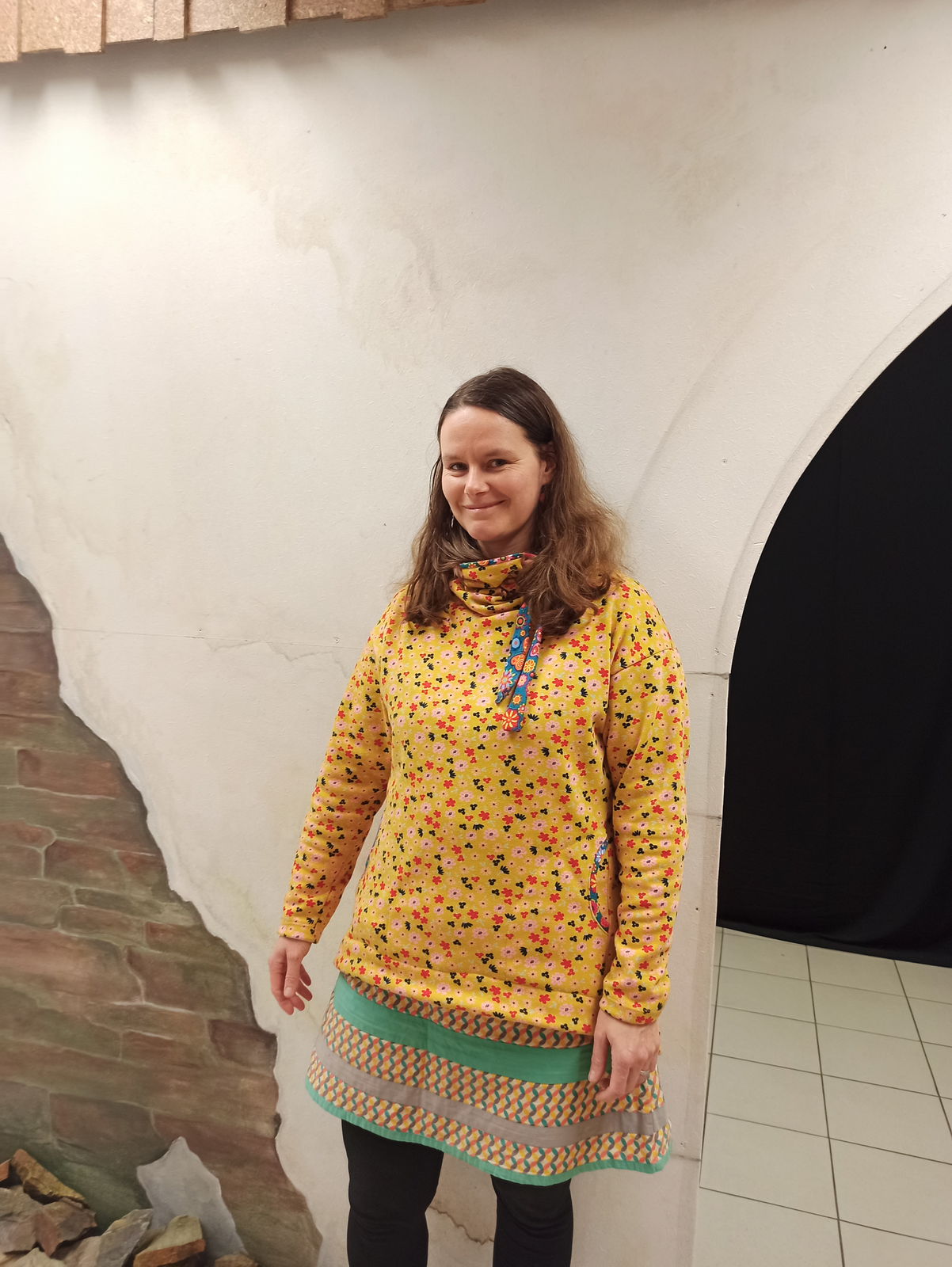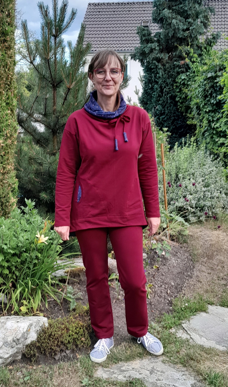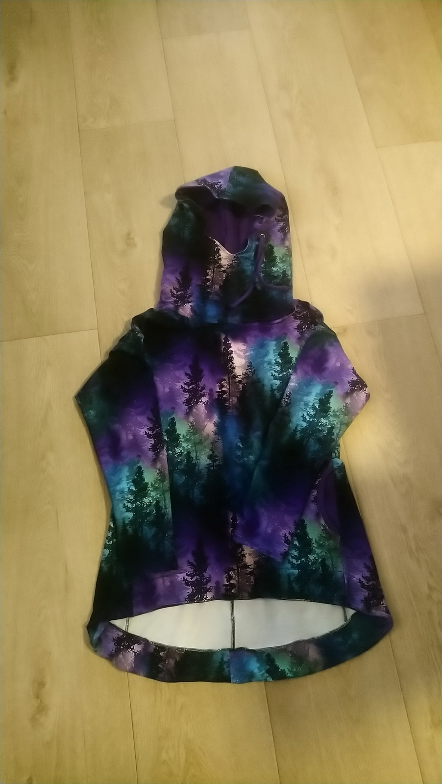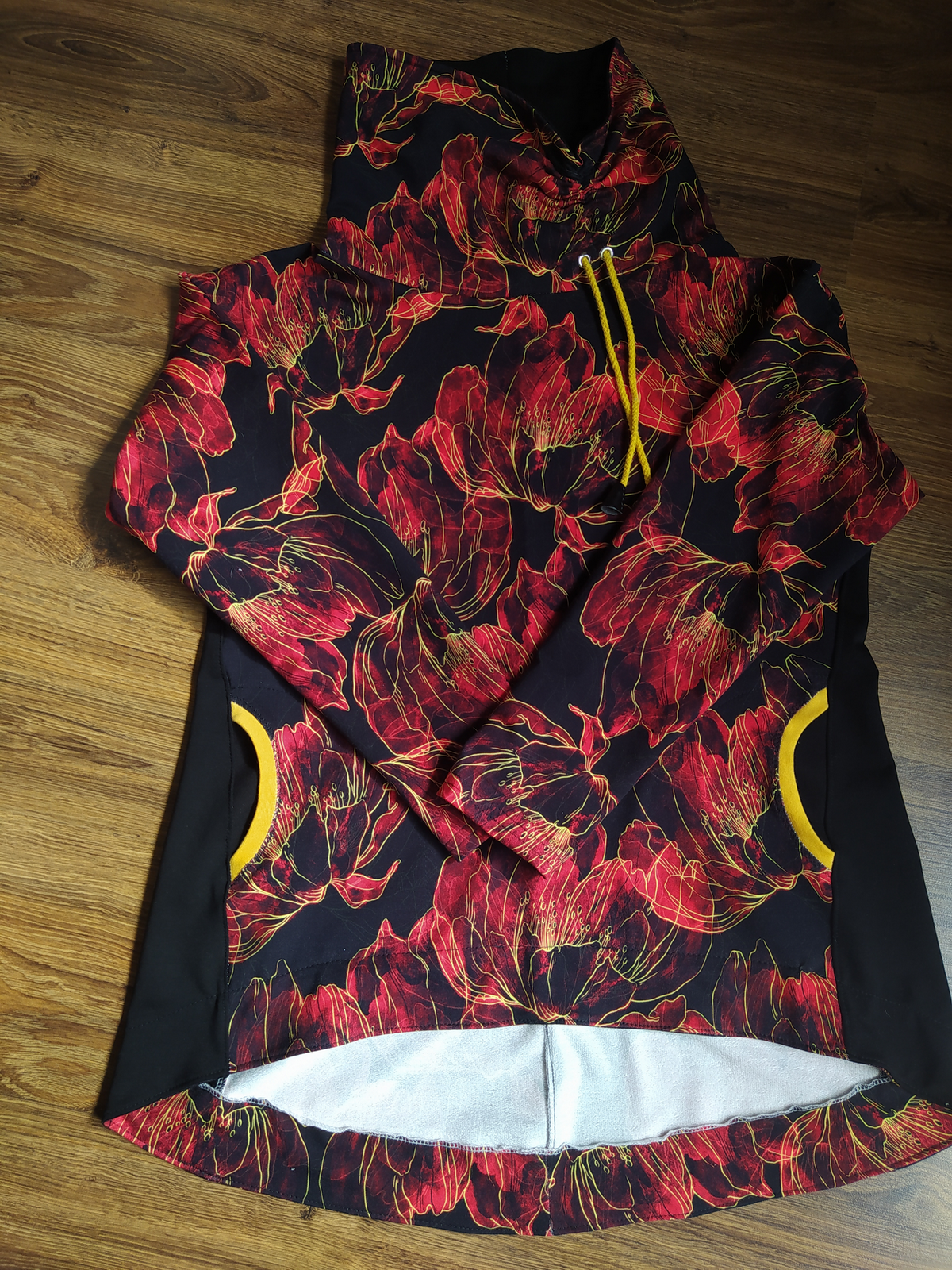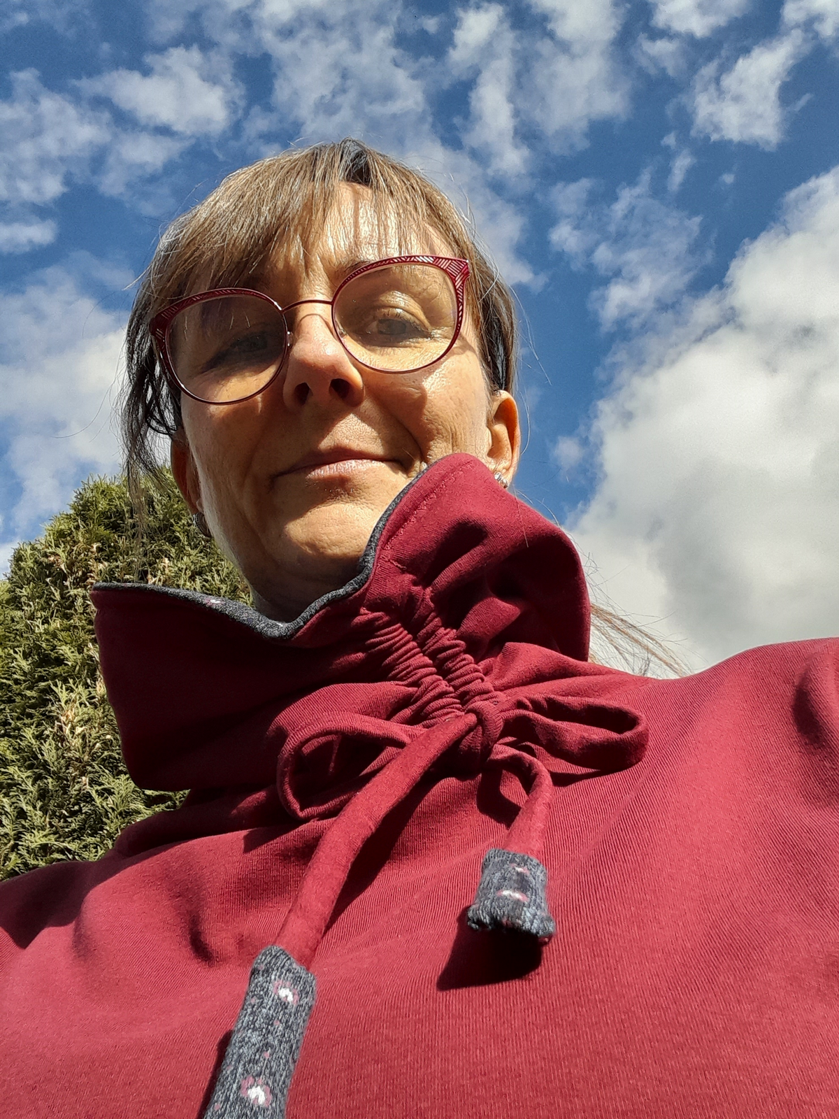 „Je to můj první zkušební vzorek z darových zbytků teplákoviny. Chybělo, takže jsem mikinu pouze podhrnula. Kapsy jsem vynechala, aby mi nezvětšovaly břicho. Zůžila jsem si průkrčník, abych nemusela nosil šátky. Je krásně vypasovaná, takže mi není zima na záda. Závěr: prostě potřebuju další :-D A s videonávodem to byla fakt brnkačka.“
