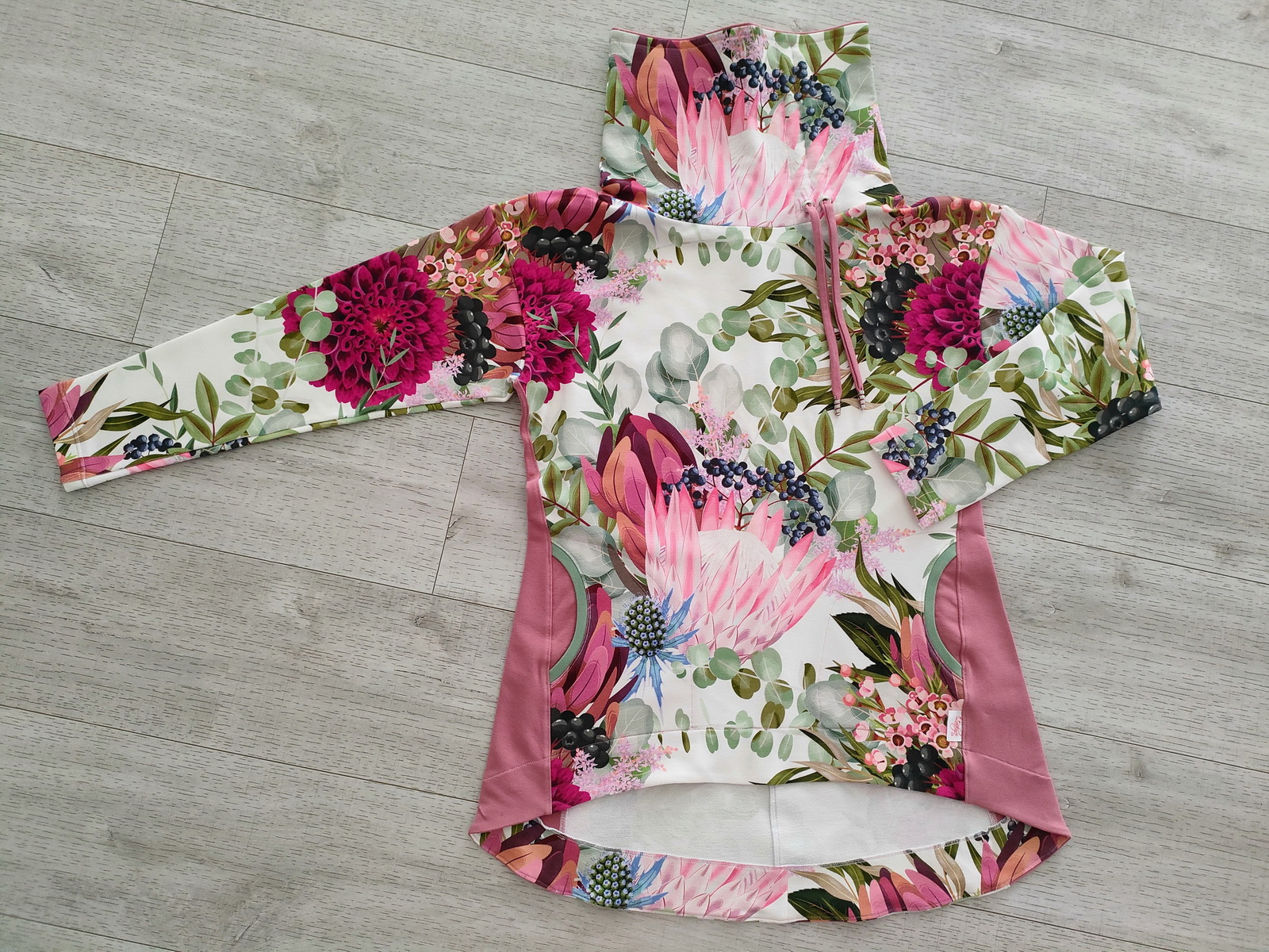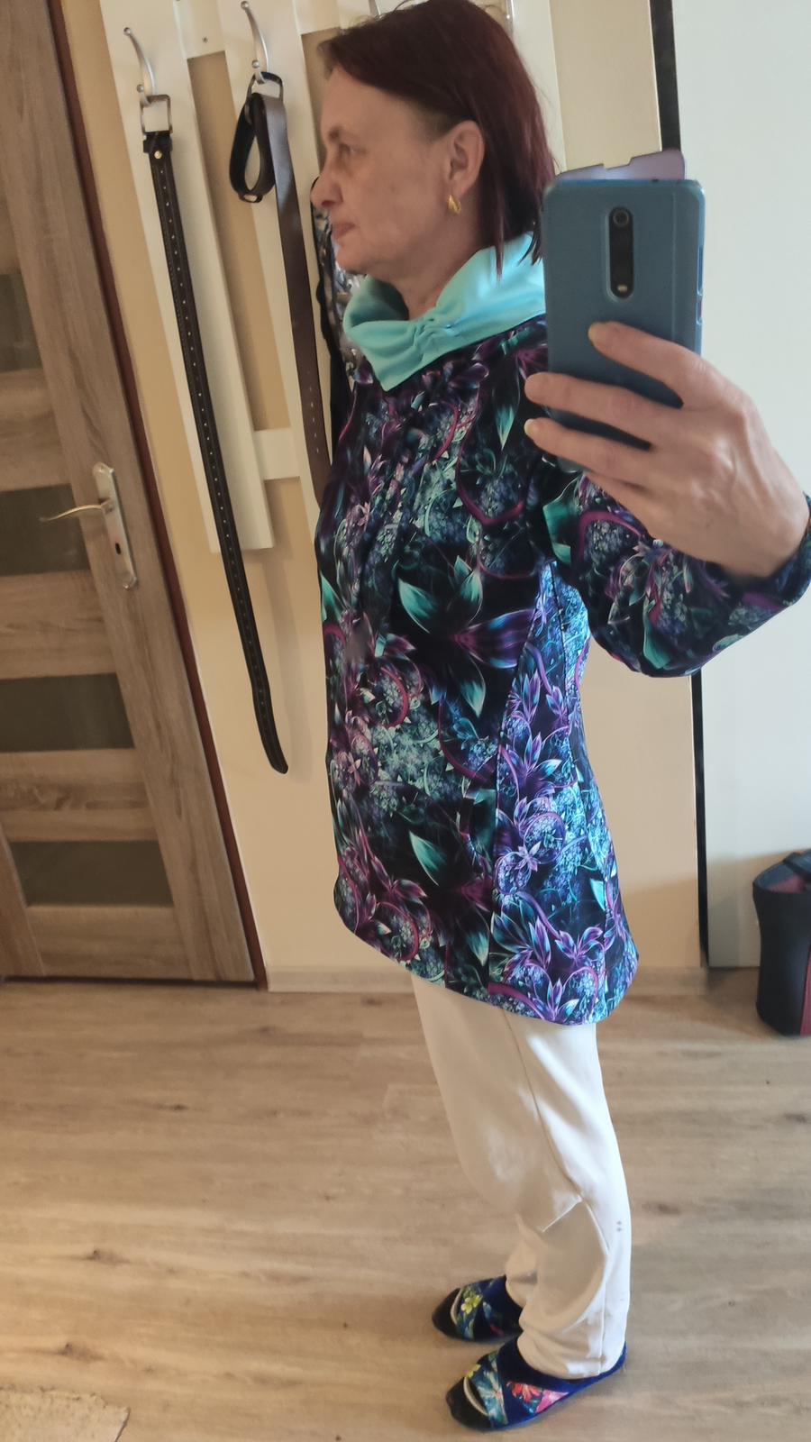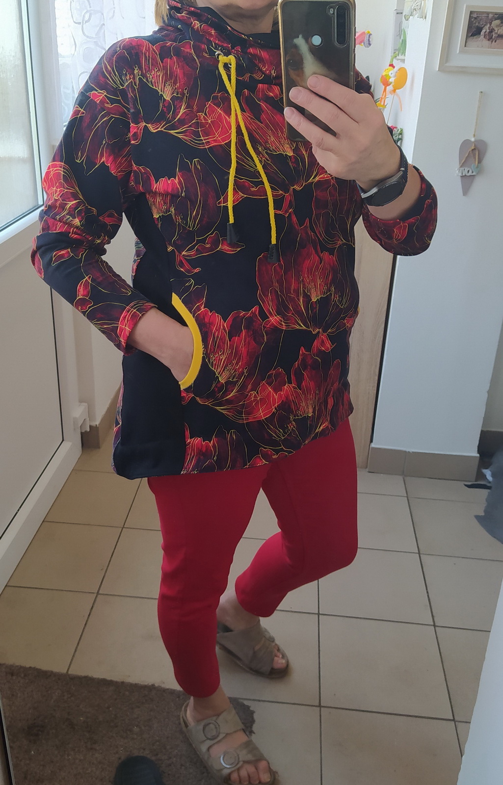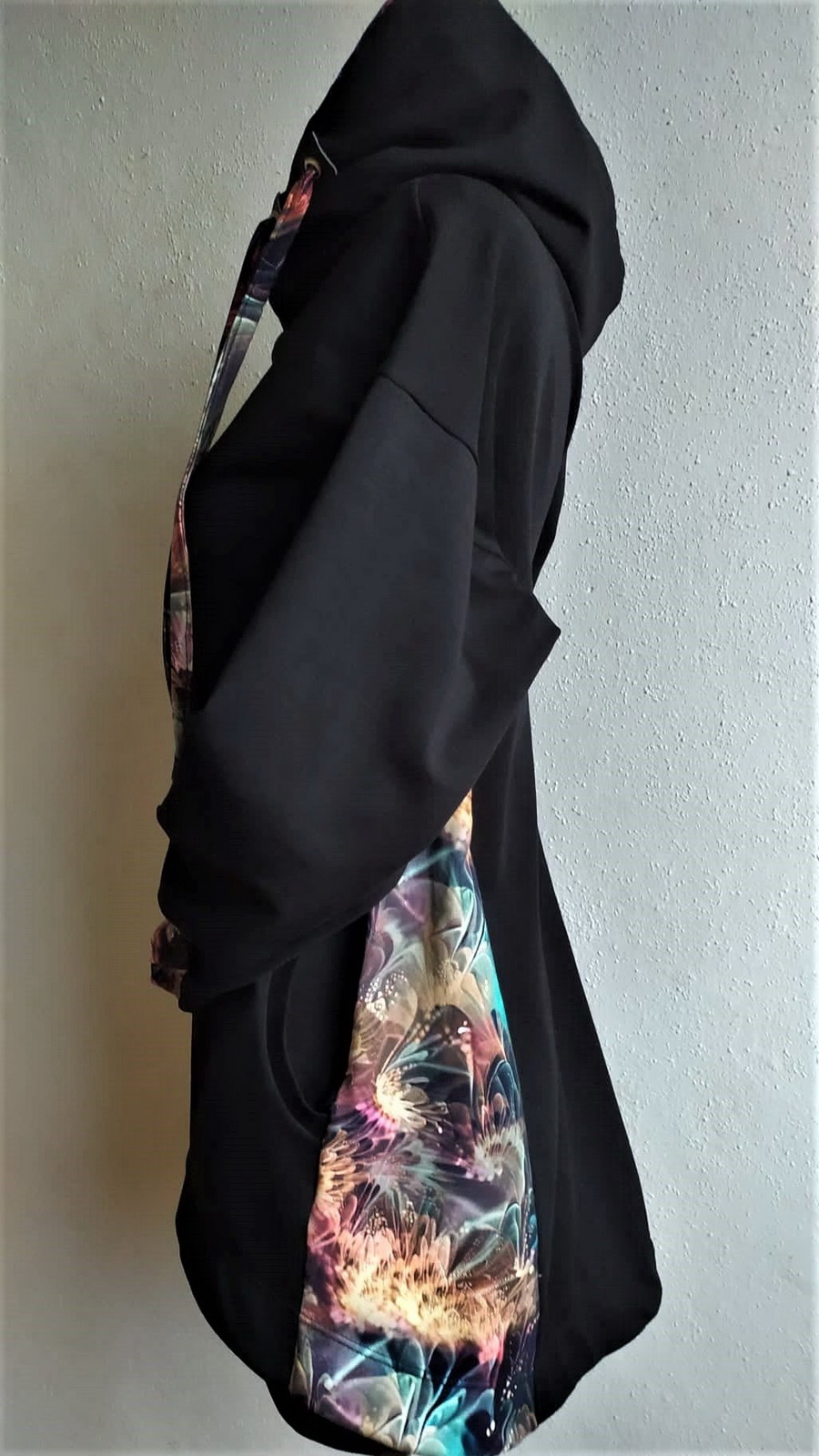 „Je to můj první zkušební vzorek z darových zbytků teplákoviny. Chybělo, takže jsem mikinu pouze podhrnula. Kapsy jsem vynechala, aby mi nezvětšovaly břicho. Zůžila jsem si průkrčník, abych nemusela nosil šátky. Je krásně vypasovaná, takže mi není zima na záda. Závěr: prostě potřebuju další :-D A s videonávodem to byla fakt brnkačka.“