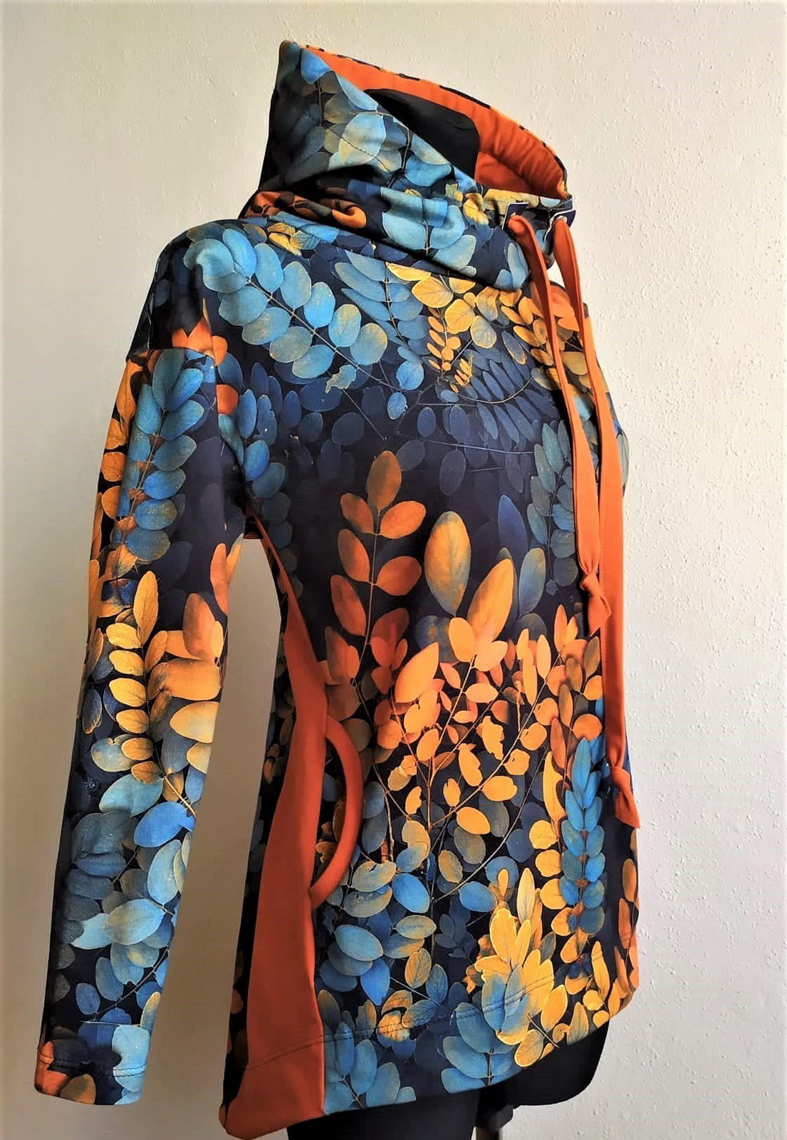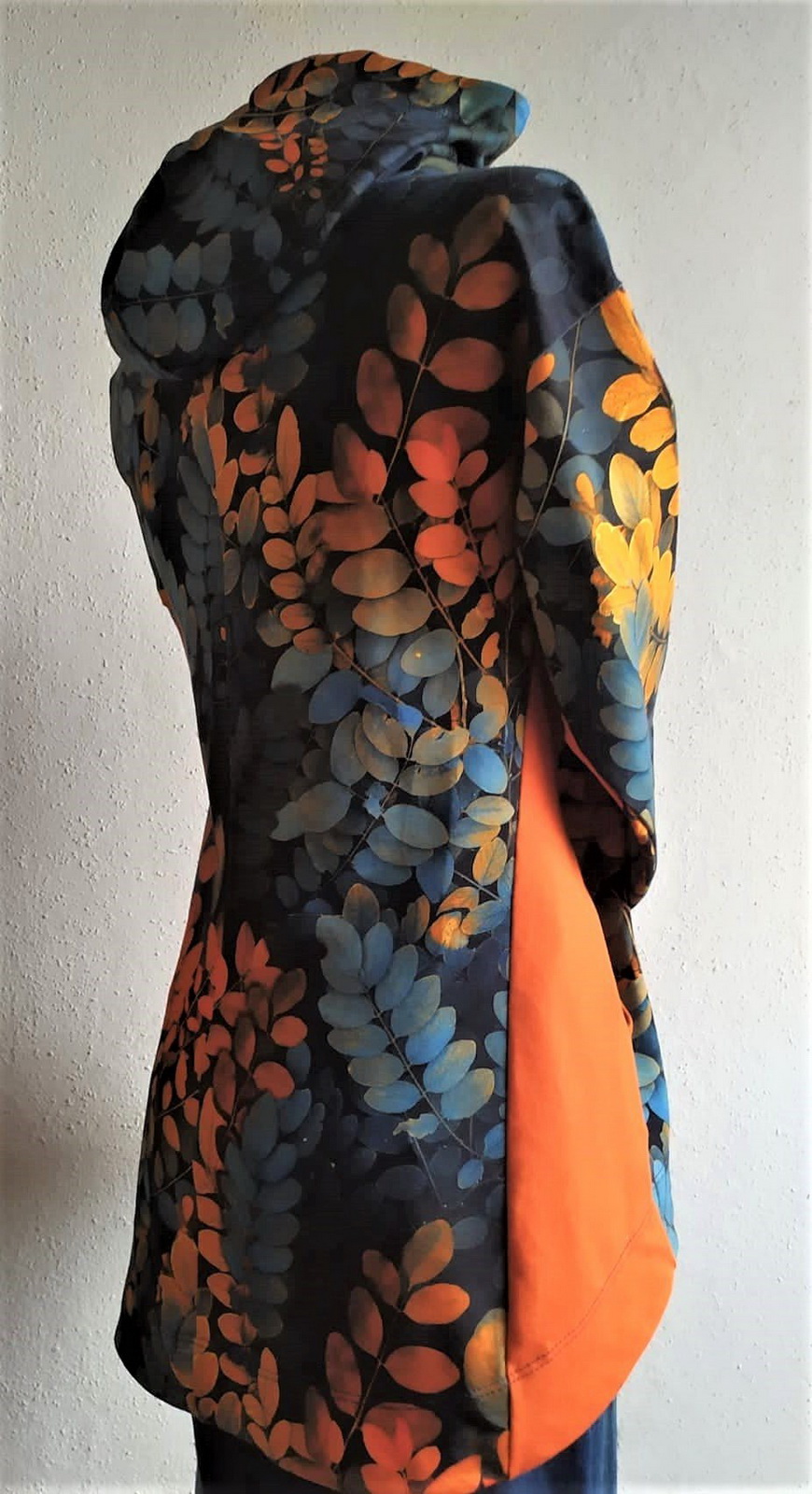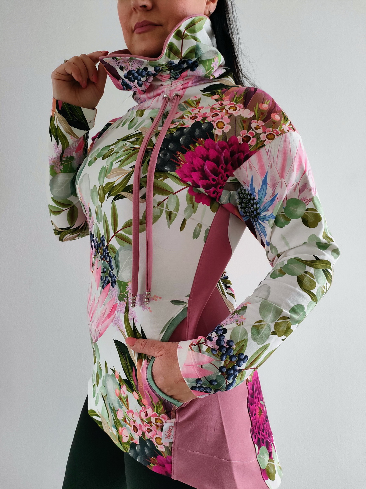Je lehce projmutá v pase, ale pas neobepíná. V zadním středu je šev, který tvaruje postavu a tvoří krásnou siluetu ze všech stran. Od pasu směrem k dolnímu kraji jde Marika do mírného rozšíření, v zadním díle je delší, končí v úrovni sedu, zde záleží na Vašem nastavení: můžete zvolit kratší délku nebo protáhnout až skoro do poloviny stehen. V předním díle je mikina kratší díky čemuž je výsledný dojem velice efektní.