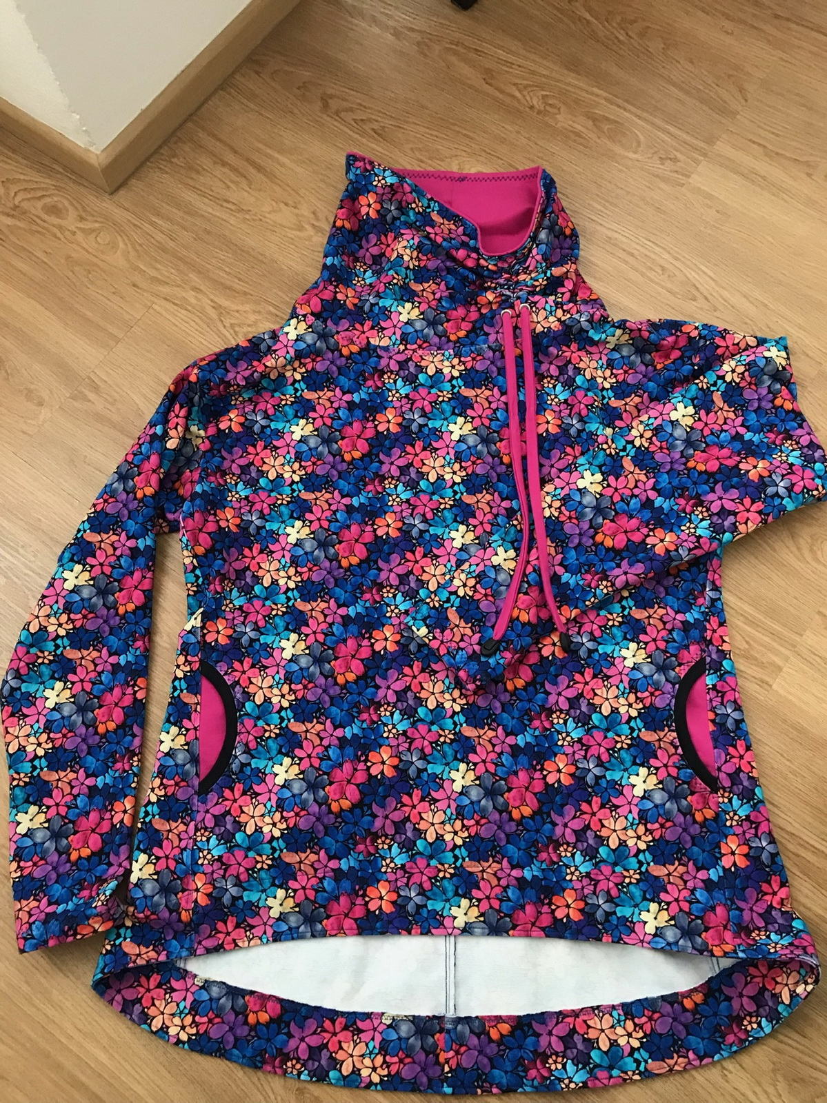 „Mikina se šila skoro sama. Nadchnul mě konfigurátor střihu kde jsem si lehce upravila délku mikiny a šířku rukávů ( prostě jsem to chtěla vyzkoušet). Značky ve střihu, vše krásně sedělo. Hned jsem si nastrihala na další 😀“