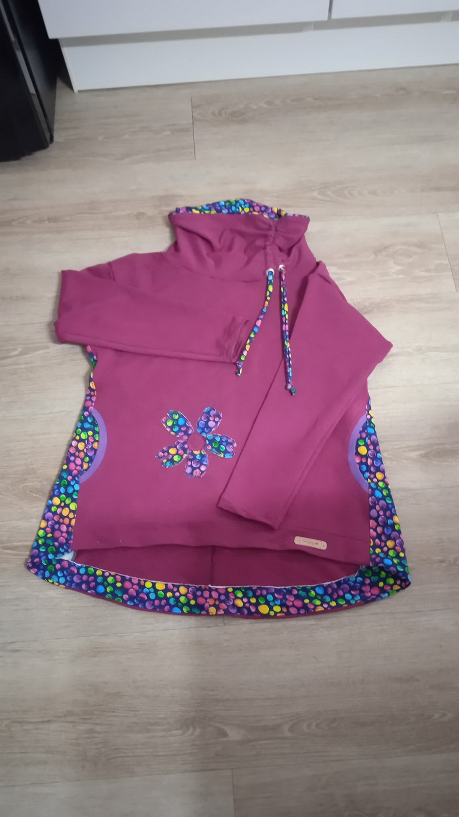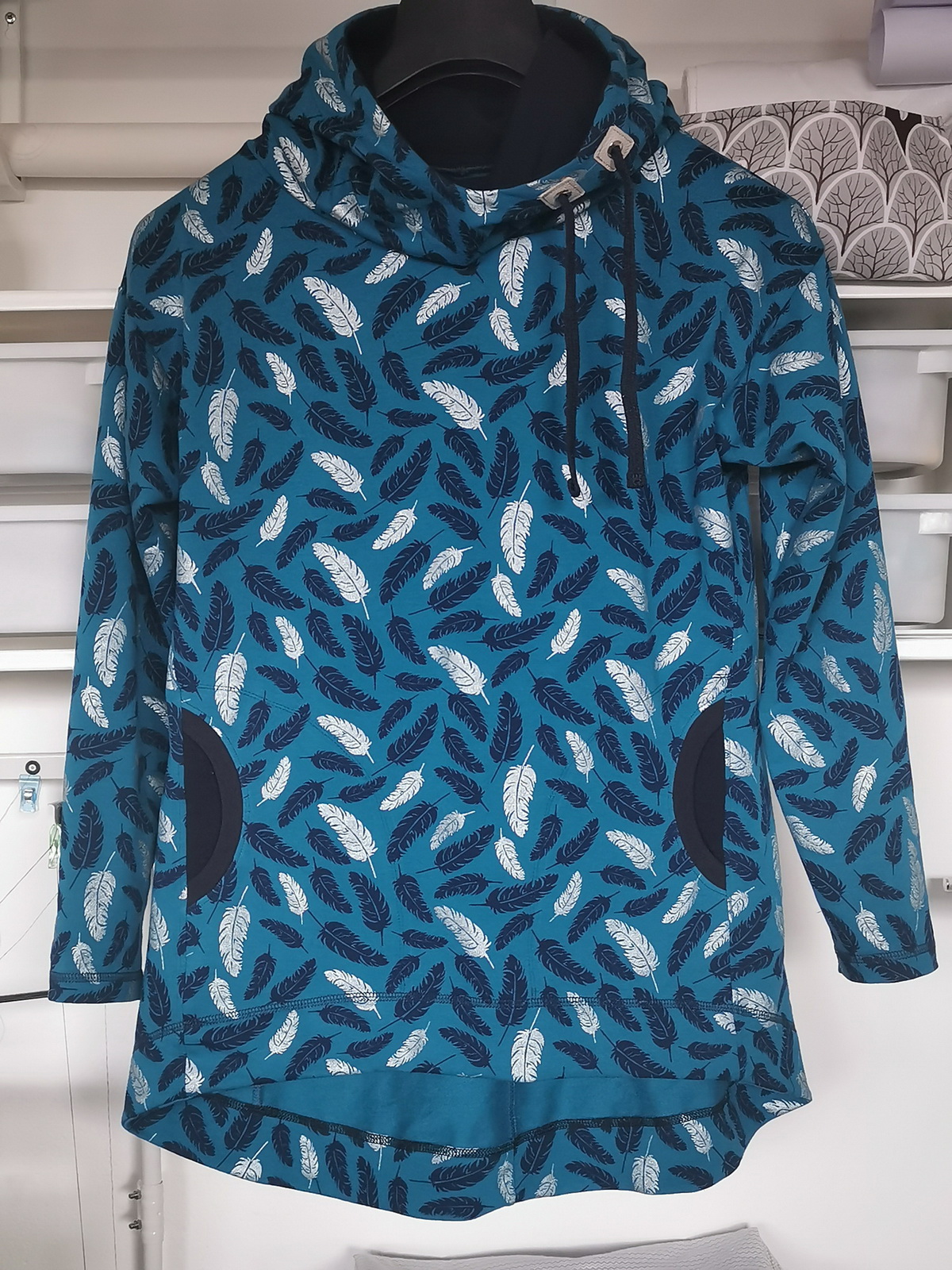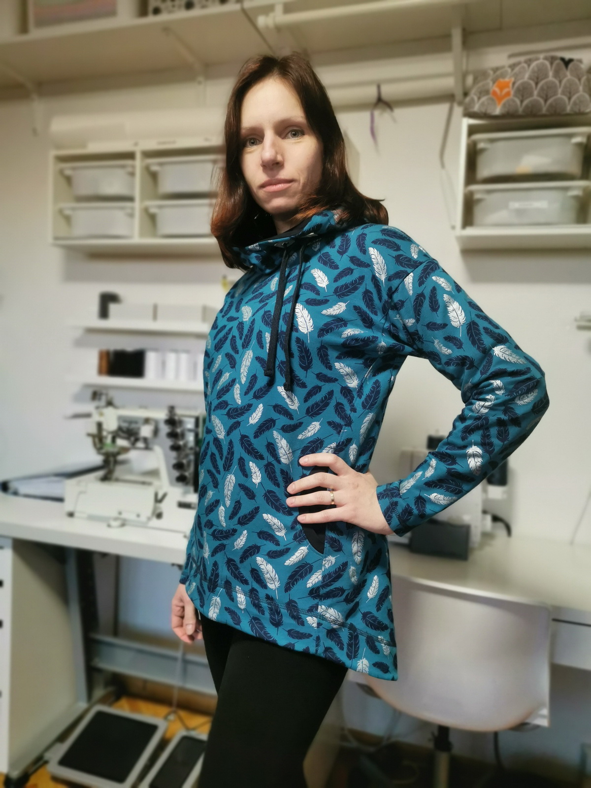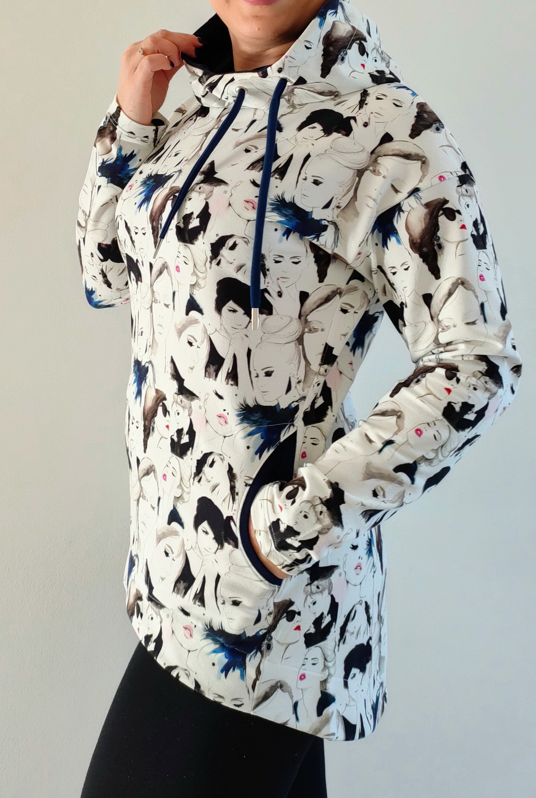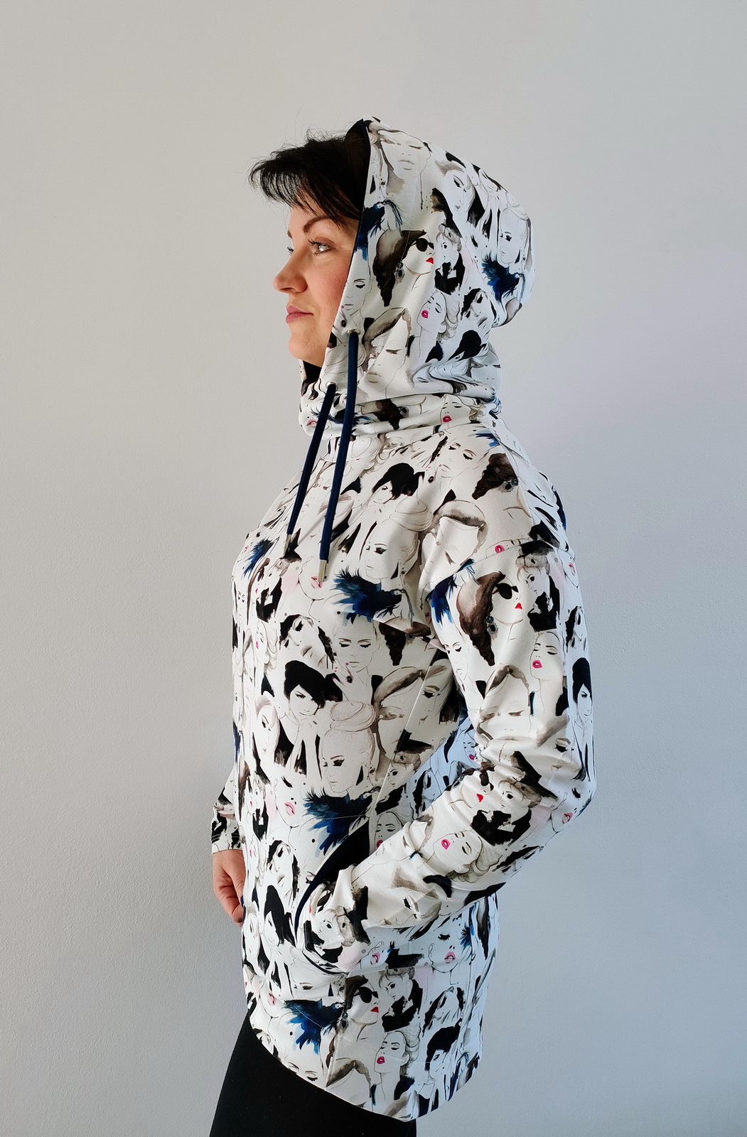 „Přiznávám, že když jsem na tuto mikinu prvně narazila, krom střihu mě zaujala i samotná látka a tak jsem si s požehnání paní Irenky ušila stejnou. Střih je vymazlený, mikča se šila moc hezky. Řekla bych, že je o velikost větší, přesto jsem rukávy i celkovou délku trochu prodlužovala. Na mě je dole až moc sukýnkovitá, příště možná malinko zúžím spodní část a zkrátím ZD - vykukuje pod bundou, ale na jaře bez bundy bude moc fajn!