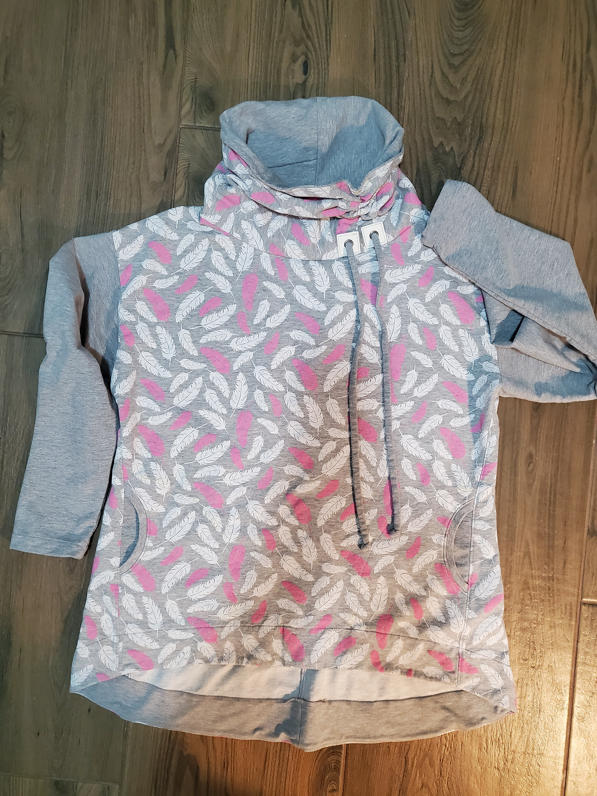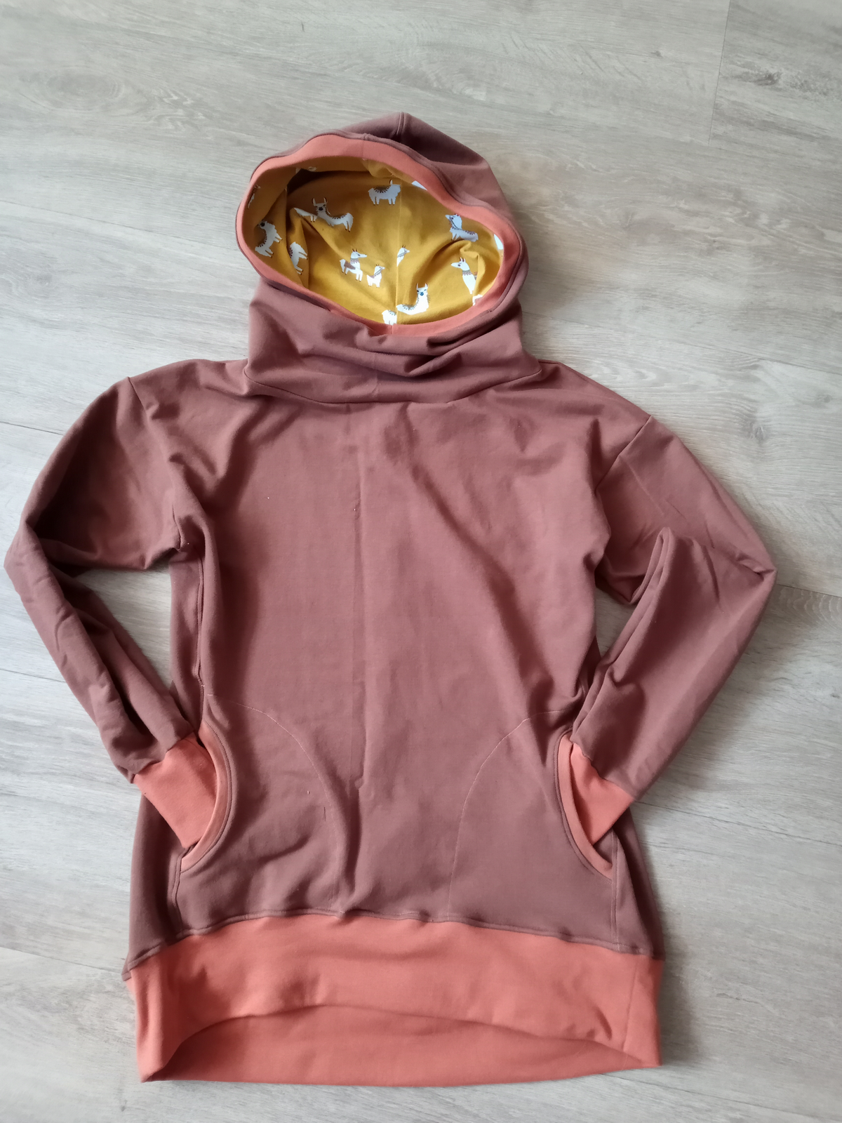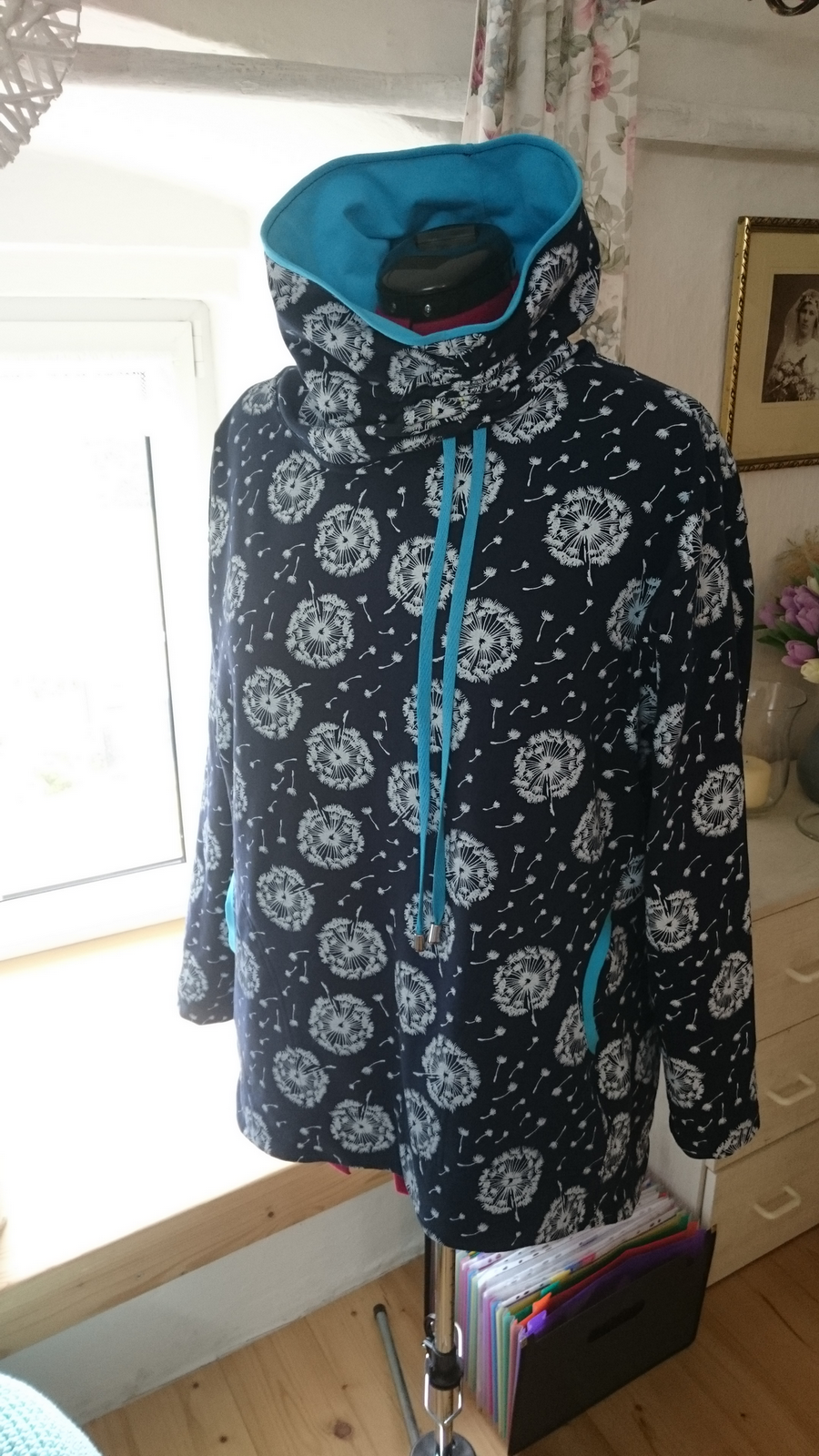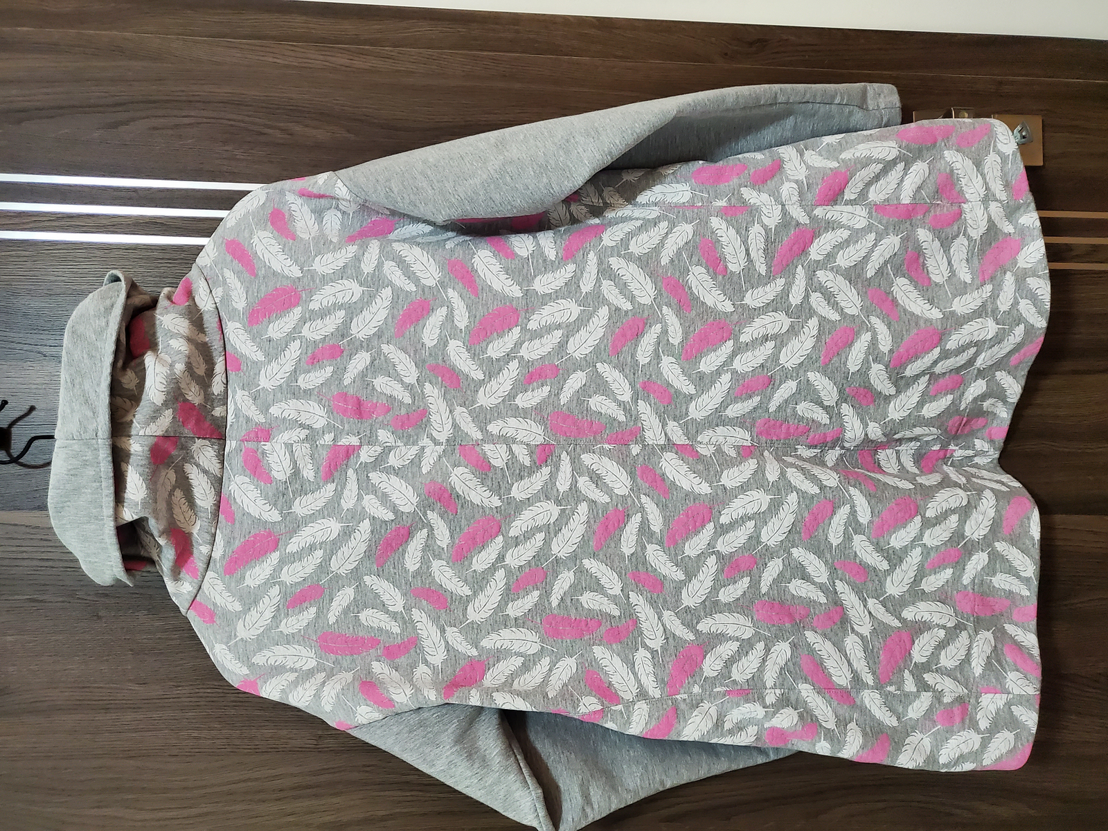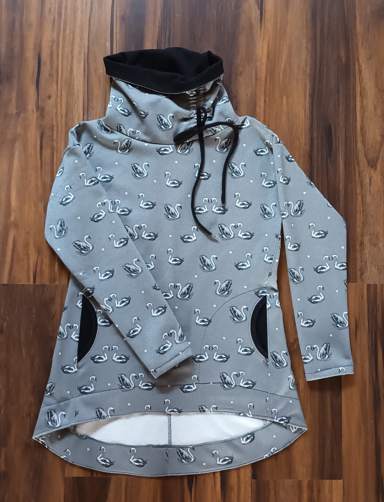 „Přiznávám, že když jsem na tuto mikinu prvně narazila, krom střihu mě zaujala i samotná látka a tak jsem si s požehnání paní Irenky ušila stejnou. Střih je vymazlený, mikča se šila moc hezky. Řekla bych, že je o velikost větší, přesto jsem rukávy i celkovou délku trochu prodlužovala. Na mě je dole až moc sukýnkovitá, příště možná malinko zúžím spodní část a zkrátím ZD - vykukuje pod bundou, ale na jaře bez bundy bude moc fajn!