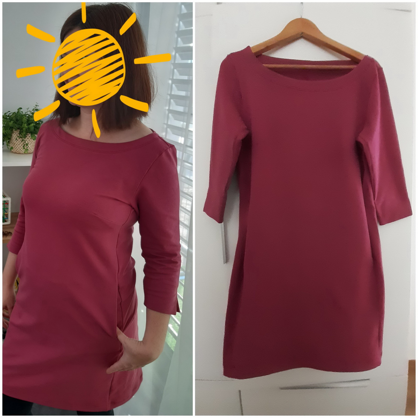Jsou to šaty, které díky své délce i střihu jdou nosit jak s legíny tak bez nich. Délka rukávu je praktická a zakončená úžasnou manžetou, která vás bude při šití bavit svou jednoduchostí a při nošení vám zajistí veškerý komfort ať už ji ohrnete nebo necháte směrem dolů jako rozparek. Pouzdrové šaty mají lehce projmutý pas, v předním díle jsou všité důmyslné kapsy, které jsme vymysleli tak, že partii bříška nepřidávají, a váčky se nekrčí. Jejich snadné šití díky videonávodu zvládne každá hobby švadlenka.
