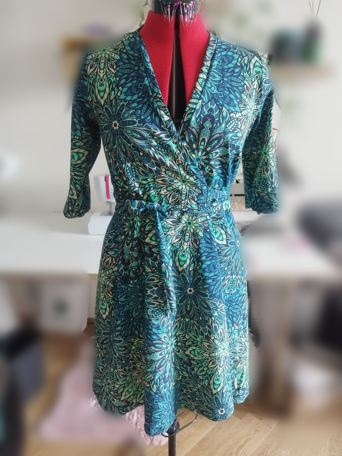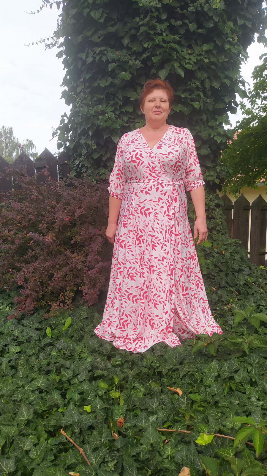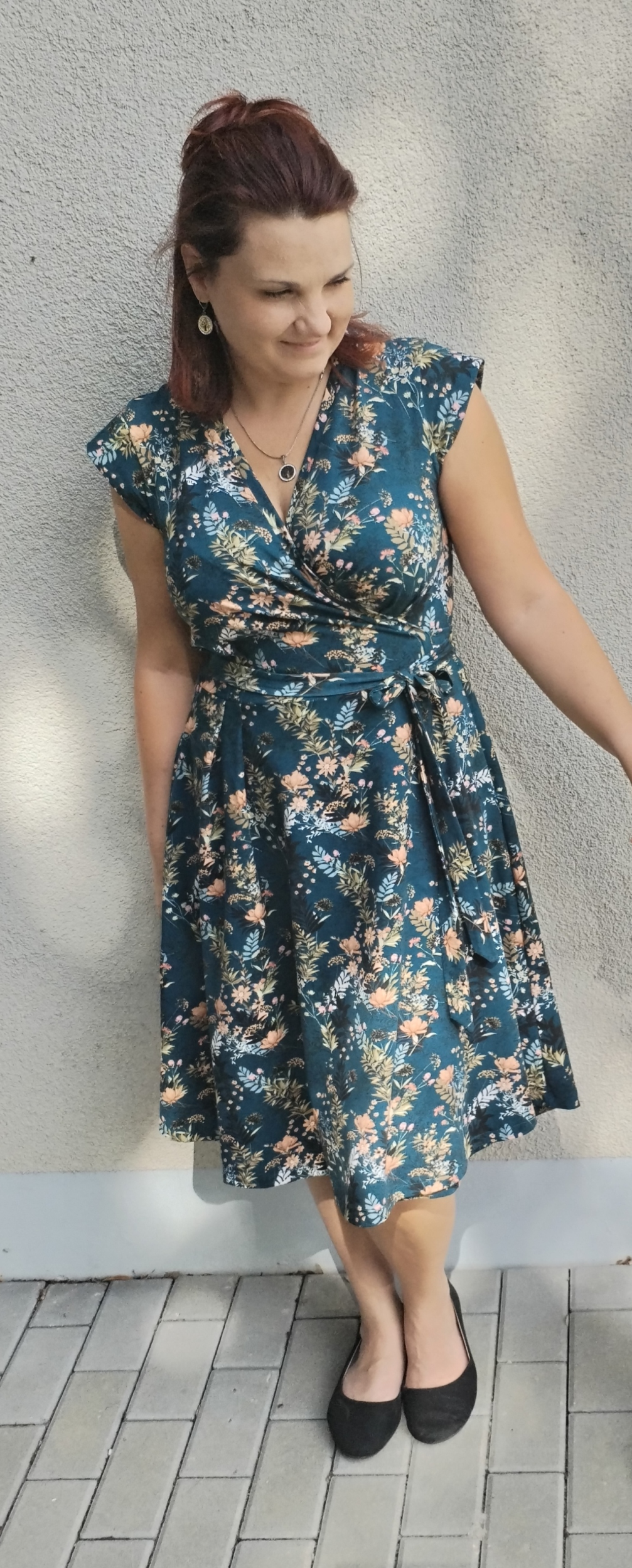 „Druhý pokus - tentokráte již z pružnéhu úpletu. Myslela jsem, že vím jak to, ale ZASE jsem střihla sukni opačně, takže zavinuji levou stranu přes pravou. Ale to byste si nevšimly, kdybych to sama neprozradila :D šije se fajn, jen si člověk musí pamatovat, co jsou záševky a co sesazovací značky. Z výstřihu jsem tak nějak volně ubrala až 5 cm, aby byl otevřenější (délku lemovacího proužku jsem nechala) a od došití jsou to moje nejnošenější šaty“