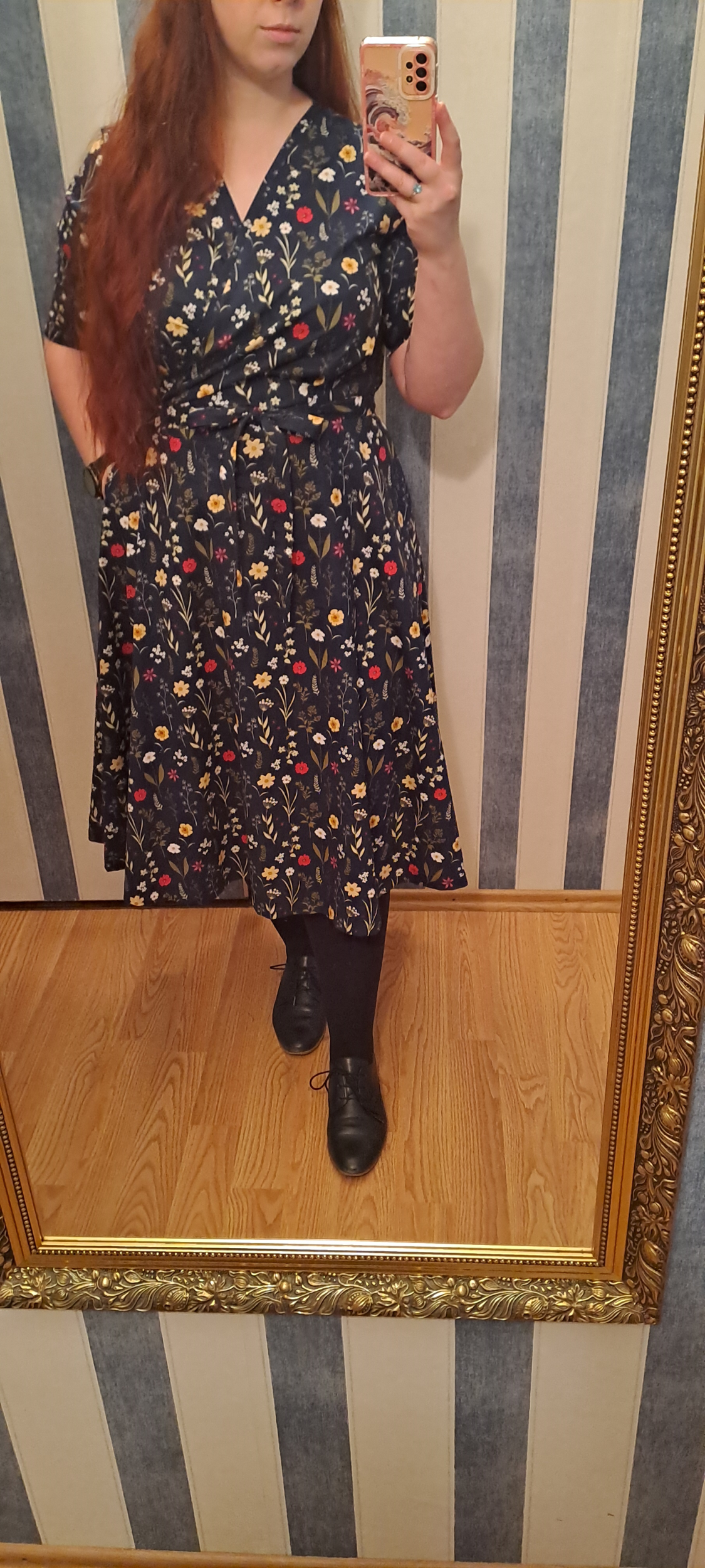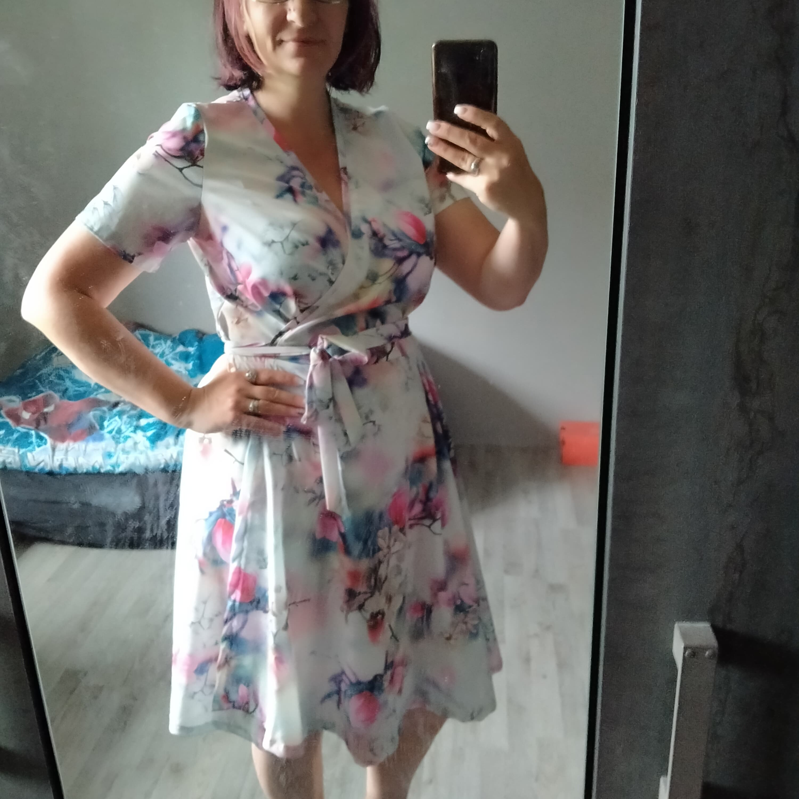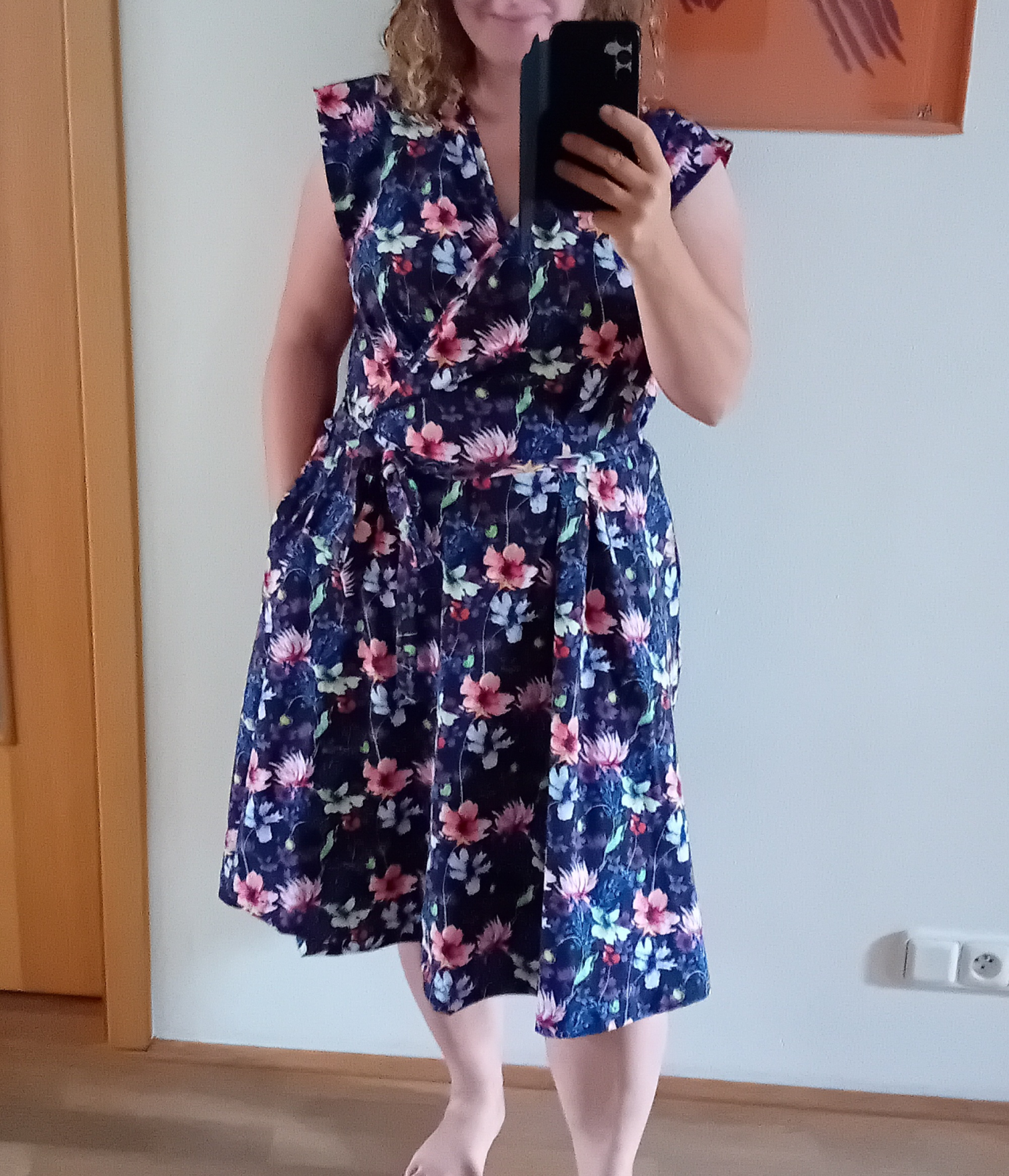 „Druhý pokus - tentokráte již z pružnéhu úpletu. Myslela jsem, že vím jak to, ale ZASE jsem střihla sukni opačně, takže zavinuji levou stranu přes pravou. Ale to byste si nevšimly, kdybych to sama neprozradila :D šije se fajn, jen si člověk musí pamatovat, co jsou záševky a co sesazovací značky. Z výstřihu jsem tak nějak volně ubrala až 5 cm, aby byl otevřenější (délku lemovacího proužku jsem nechala) a od došití jsou to moje nejnošenější šaty“