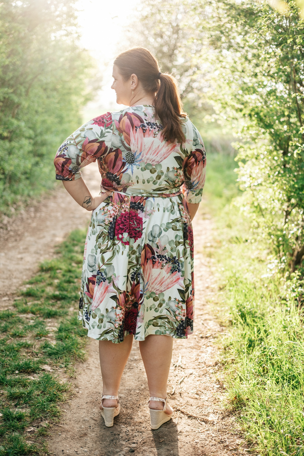 LenSo: "Šaty jsou nádherné a cítím se v nich skvěle. Střih jsem si nakonfigurovala na míru, což je naprosto super výhoda a téměř jistota, že mi hned napoprvé skvěle sednou. Kdybych šila čistou 44,tak mi v pase budou dost těsné a naopak a čekalo by mě tak mnoho úprav. Díky podrobnému videonávodu jsem šití zvládla na jedničku,bez něj bych byla ztracená. Jinak je to trochu pracnější šicí projekt,ale stojí za to. Oproti puvodnimu střihu jsem si zkratila delku,ale ješte je alespon o 10-15 cm zkrátím lehce nad kolena." *