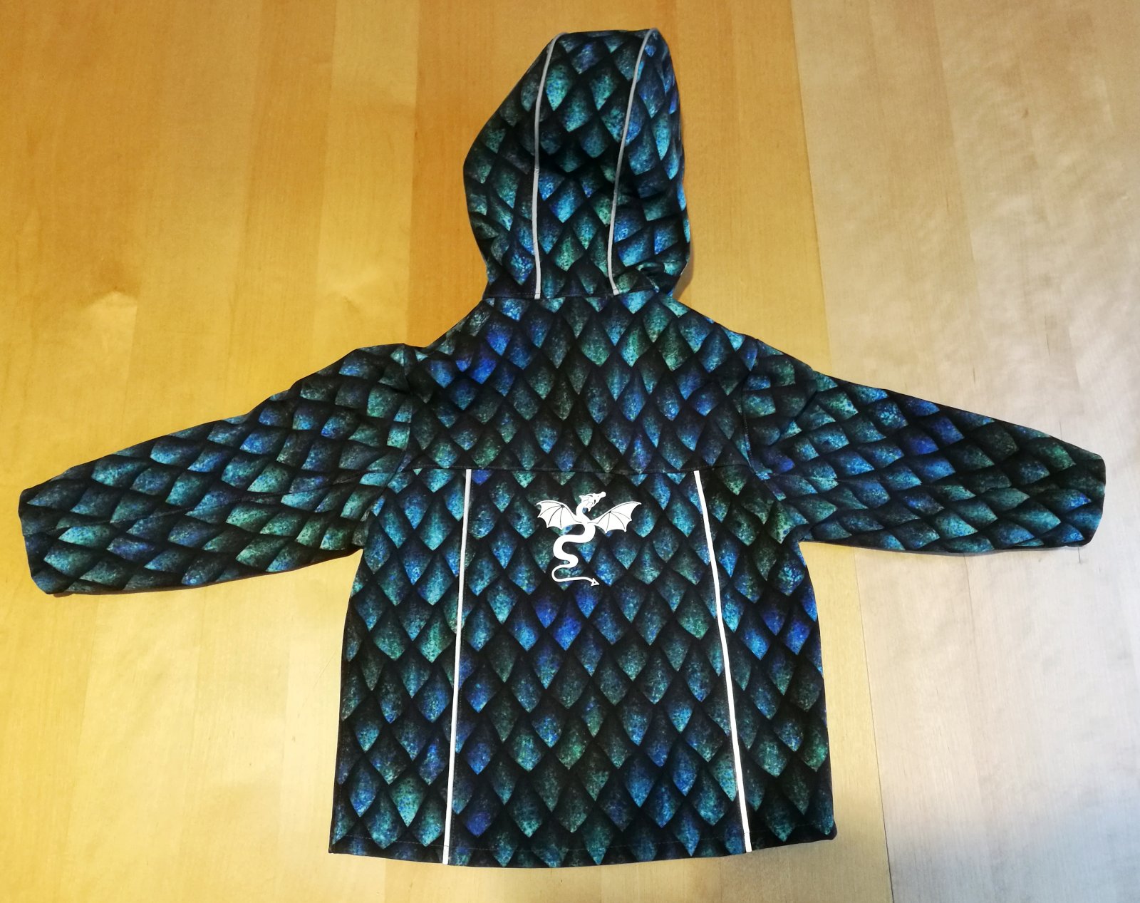 „Střih je skvěle propracovaný, dle videa se šilo výborně (jsem začátečník), jen jsem stále zapomínala na reflexní paspulky, takže jsem musela párkrát párat a na rukávech se jich vzdát :) Už ale vím, že příště musím na podsádky zvolit jiný materiál, než zimní softshell, bohužel mi stroj špatně provazoval, především u zipu. Bunda je zatím malému veliká, hlavně rukávy má dlouhé, ale na podzim bude akorát! Jediný problém je, že tatínek chce taky dračí bundu, tzn. dračí zbroj..“