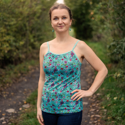 „Střih a návod opět perfektní. Zamotala jsem se do přišití ramínek, aby nebyly vidět atřižené konce pruženky (kdybych na návod koukala na počítači, ulehčilo by mi to). Díky řasení opravdu pěkně sedí. Jelikož tílka v zimě ráda nosím jako spodní vrstvu, jsem nadšená z délky (záda budou pěkně v teple). Těším se na další.“