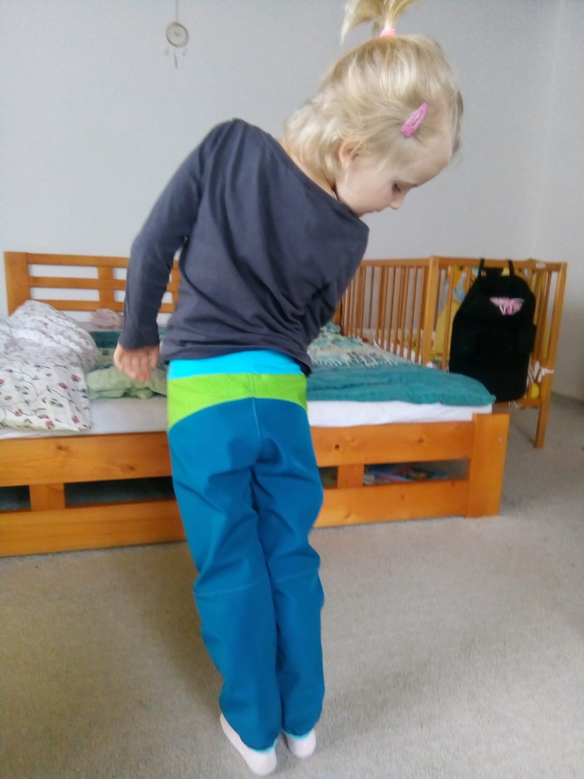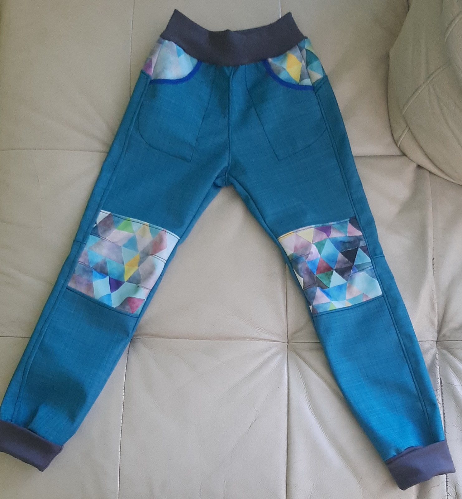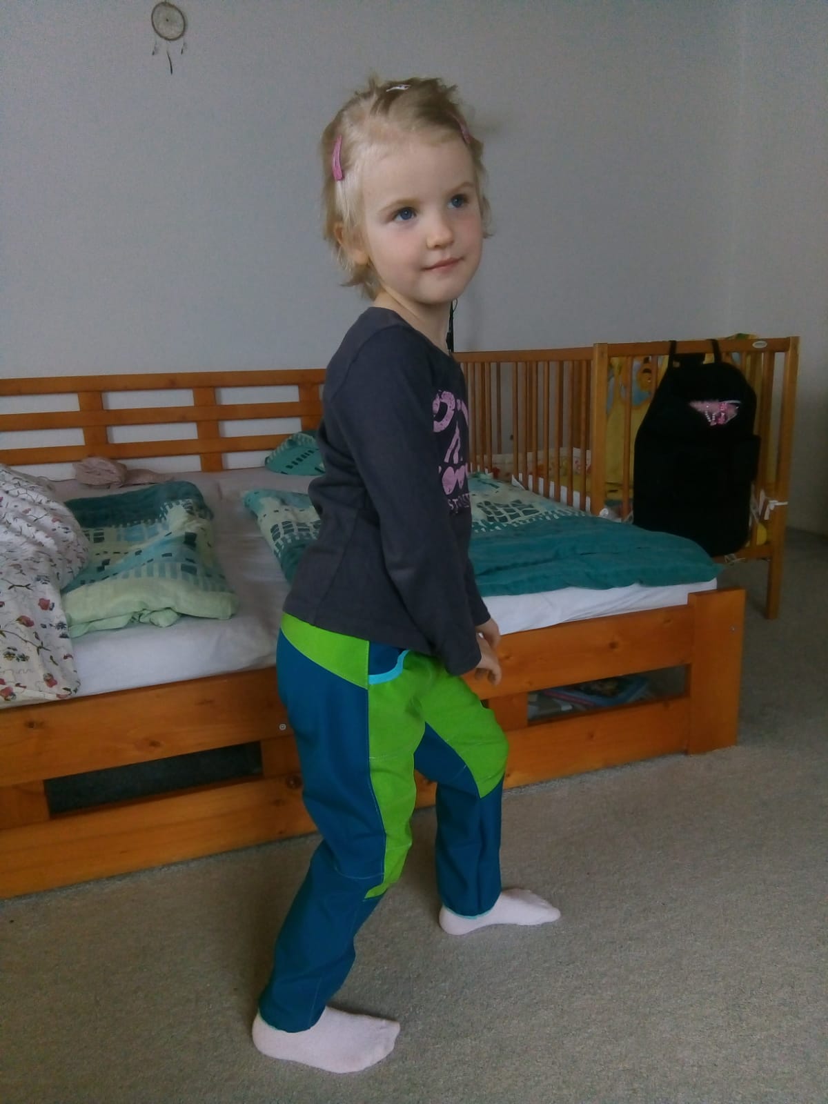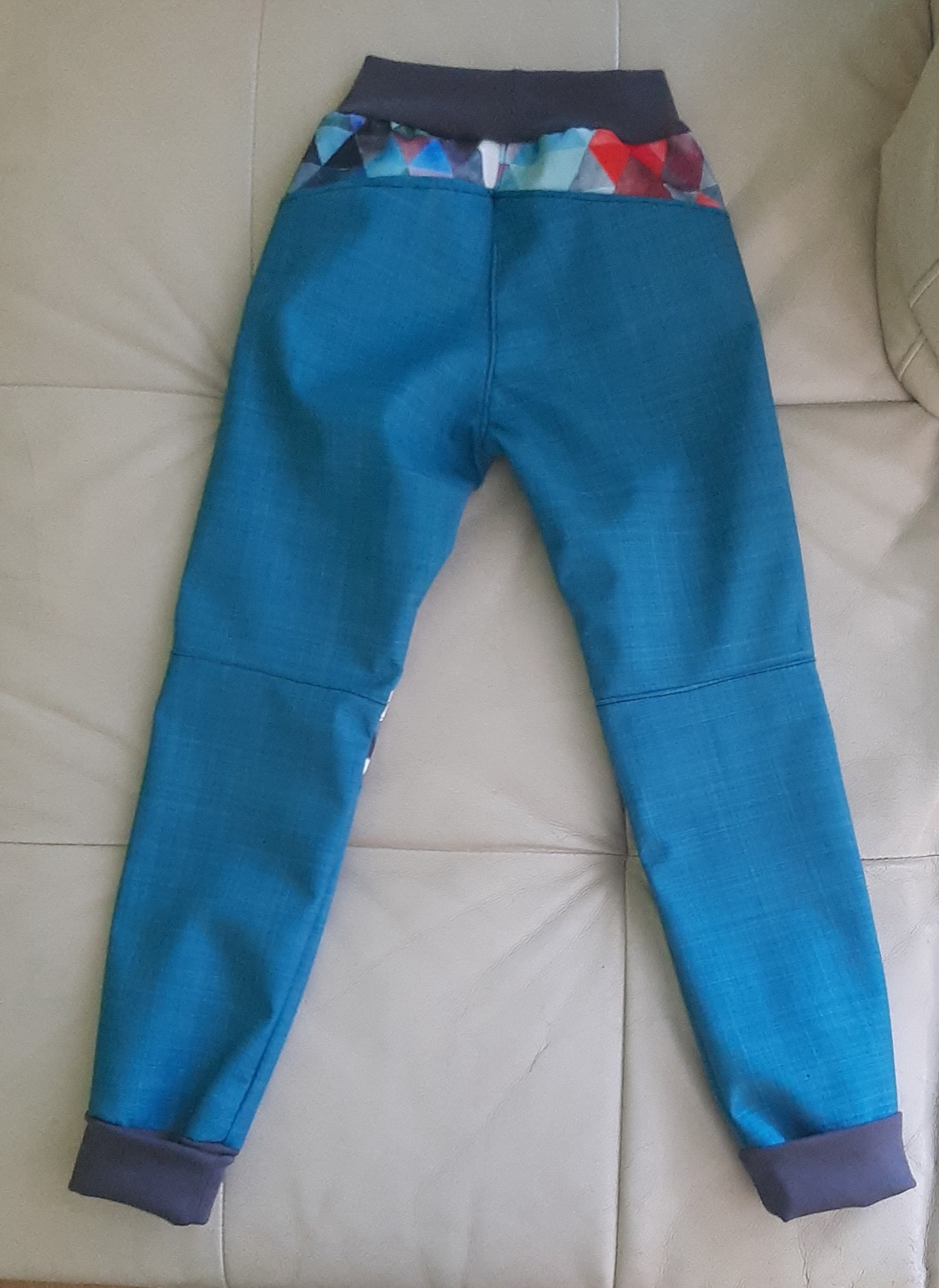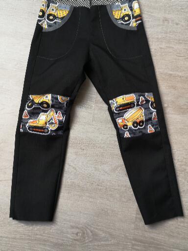 „Ještě nikdy jsem nešila kalhoty z tolika dílů :) Aspoň jsem spotřebovala zbytky a prostřihy. Šilo se hezky, vše sedělo jak má. A hlavně kalhoty pěkně pasují! Libí se, M se v nich volně hýbe,nikde neškrtí a vypadají skvěle! Šila jsem podle fotonávodu, někde jsem si nebyla jistá, tak jsem nakonec hledala upřesnění ve videu. Určitě budou další.“