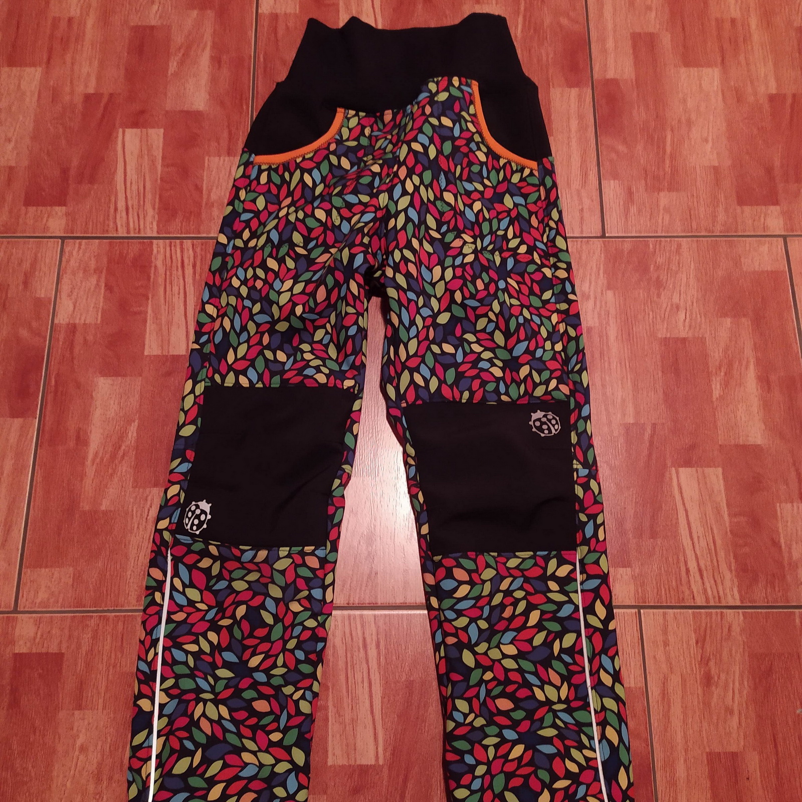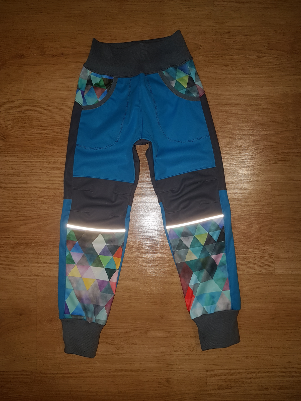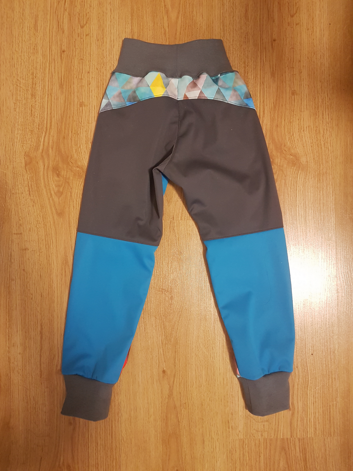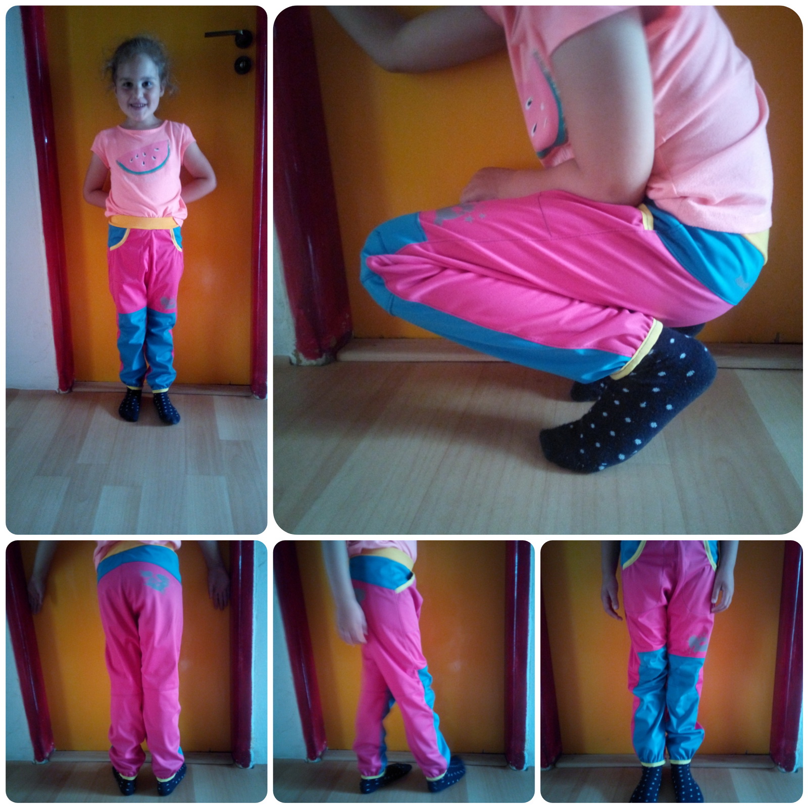 „Ještě nikdy jsem nešila kalhoty z tolika dílů :) Aspoň jsem spotřebovala zbytky a prostřihy. Šilo se hezky, vše sedělo jak má. A hlavně kalhoty pěkně pasují! Libí se, M se v nich volně hýbe,nikde neškrtí a vypadají skvěle! Šila jsem podle fotonávodu, někde jsem si nebyla jistá, tak jsem nakonec hledala upřesnění ve videu. Určitě budou další.“
