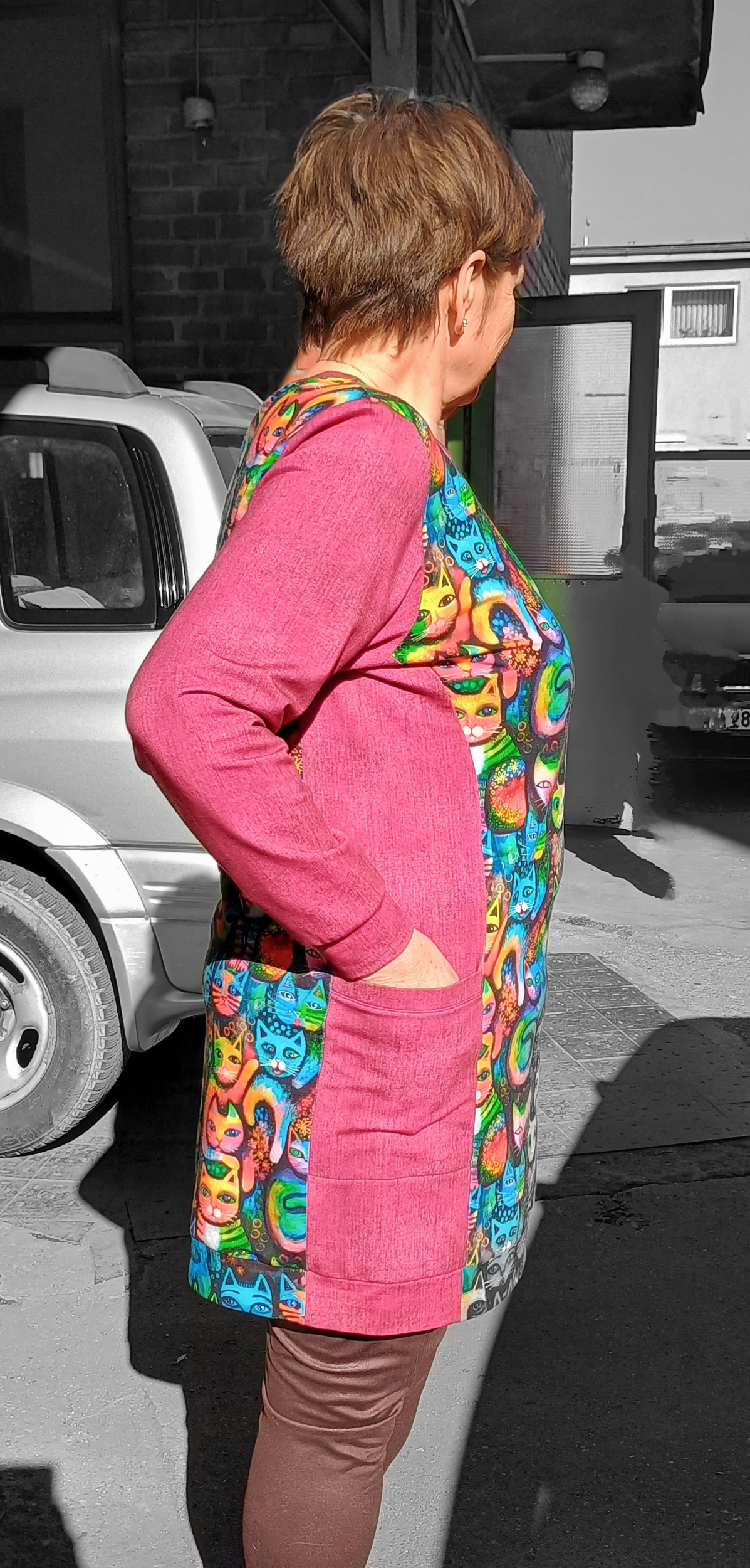 MS: "Oceňuji hlavně návod. Dosud jsem nikdy nevšívala rukáv do živůtku tímto stylem, ale má to svůj význam, asi u toho zůstanu:) Mikinu jsem konfigurovala na svou žirafí a ne úplně konfekční postavu. Vycházela jsem z nakonfigurovaného životrika e nějak to odhadla a na první pokus to není vůbec špatné. Příště asi doladím k dokonalosti. Střih se hodí spíše na vzorovanou látku, ale zrovna jsem žádnou neměla. Mám pocit, že na jednobarevné trošku více "lezou" prsní záševky. Příště bude vzorovaná:)" *