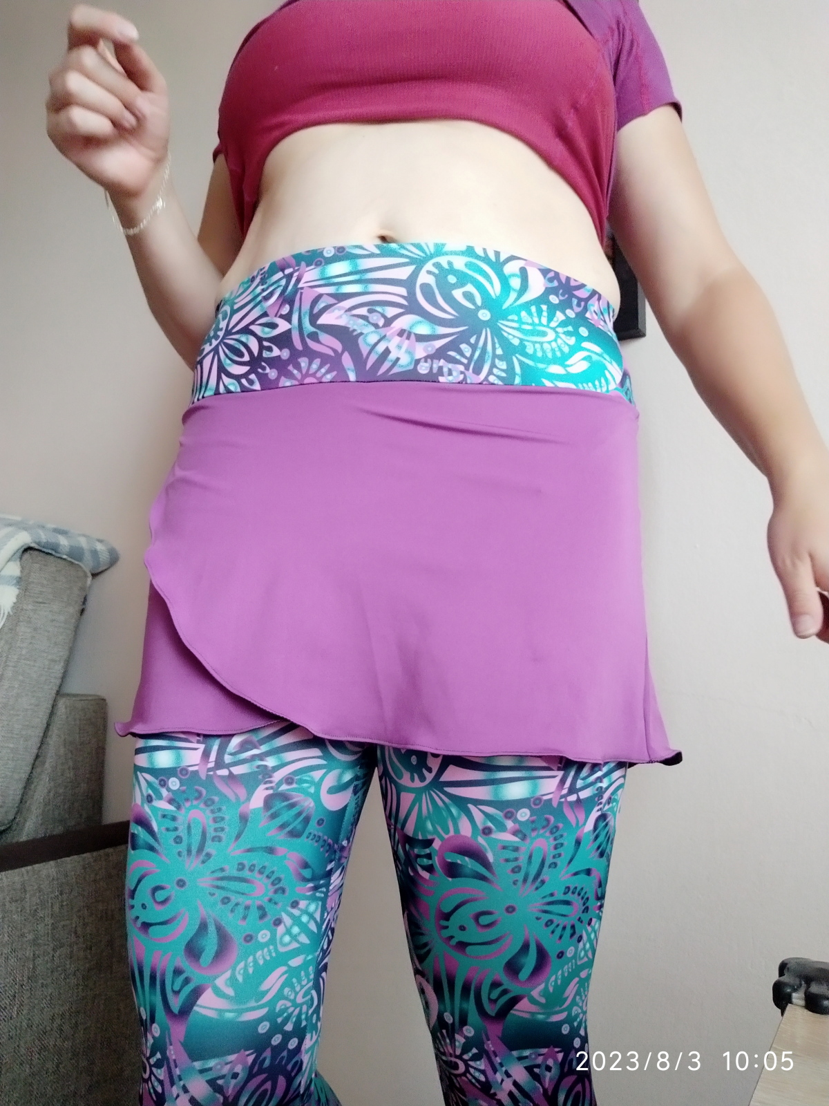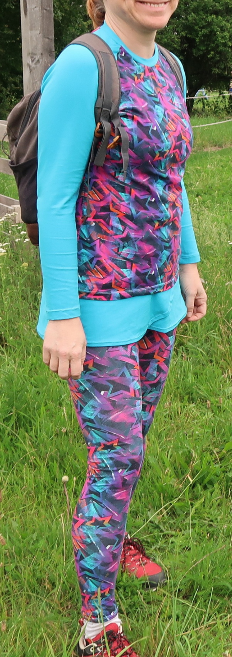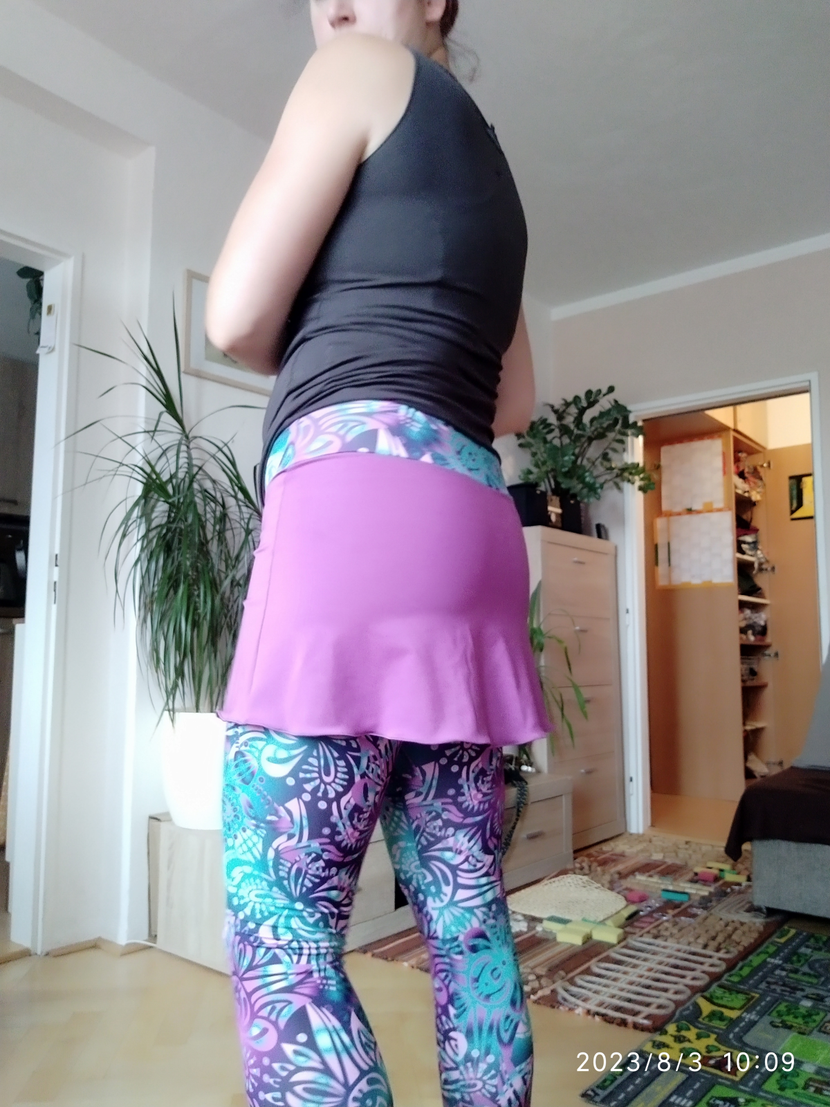 „Dobrý den, vzhledem k mé výšce (180 cm) a nekonfekční postavě již dlouho bojuji s jakýmkoliv střihem. Po neúspěšném ušití legín od jiných značek jsem sáhla k Živým střihům a neprohloupila jsem. Nejprve jsem ušila modrý model z funkčního úpletu z Unuodesign. Ten mírně stahuje a střih mi klouzal ze zadku. Všití široké gumy to částečně spravilo. Následně jsem napodruhé nastavila v mé konfiguraci vnější i vnitřní hodnoty na stehně, výšku pásku a rozměry předního i zadního sedu na maximum a výsledek - strakaté zelené legíny s růžovou sukénkou - je podle mě dokonalý. Výrobek na stehně lépe drží, nepadá ze zadku a celkově je nošení velmi komfortní.“