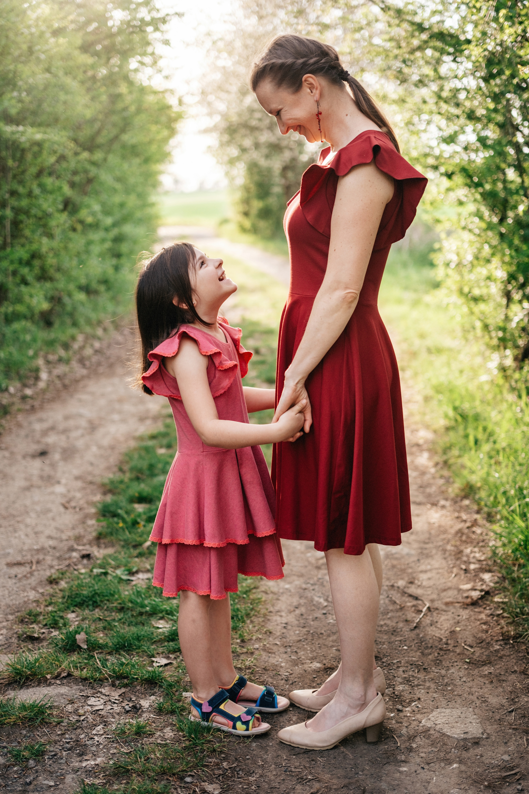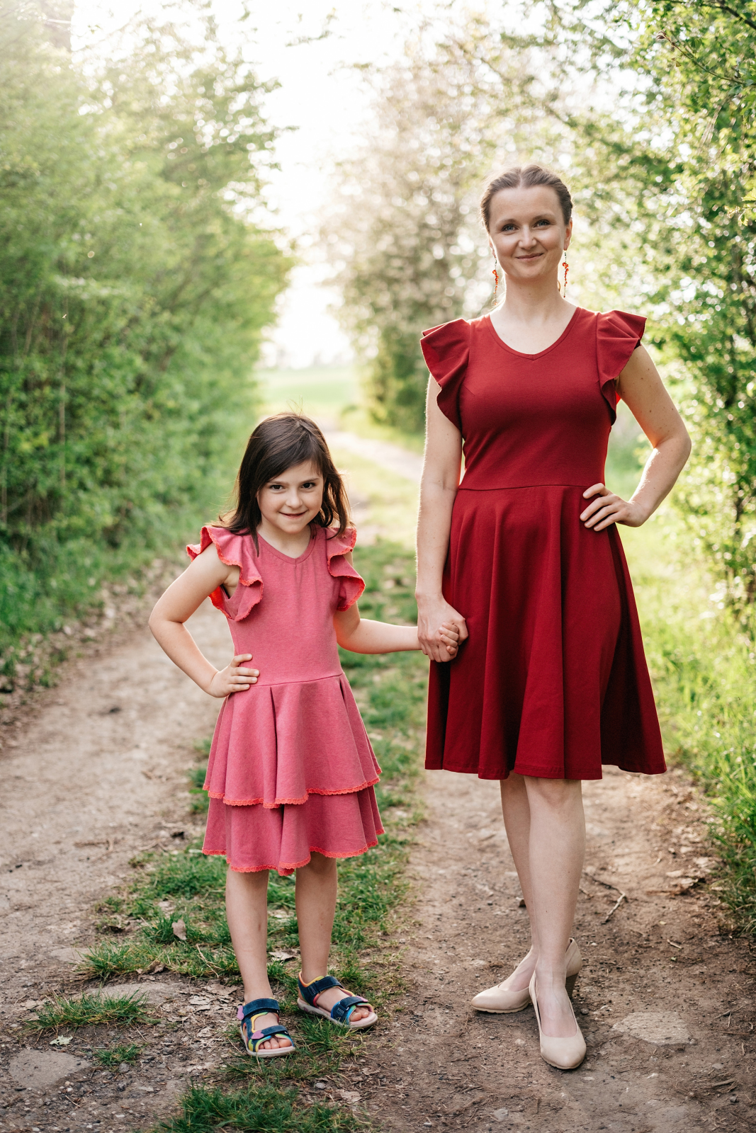 „Po dětských Jasmínkách následovaly šaty i pro maminku 😊. Šily se krásně, sesazovací značky perfektně sedí, komplet šité na rovnostehu. Díky za střih.“