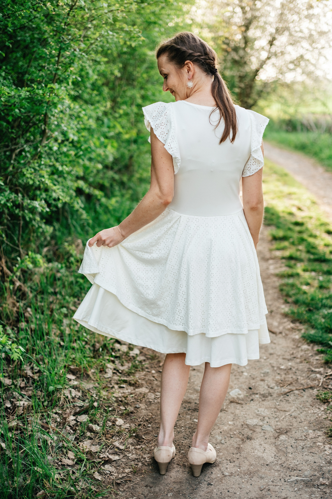 Inspirací pro šaty nám bylo tričko Viola. Živůtek šatů je ale více vypasovaný. Průramky jsou důmyslně řešené dvojitým zakončením, a prsním výběrem, který zajistí perfektní padnutí. Celý živůtek je upravený pro všití do sukně.