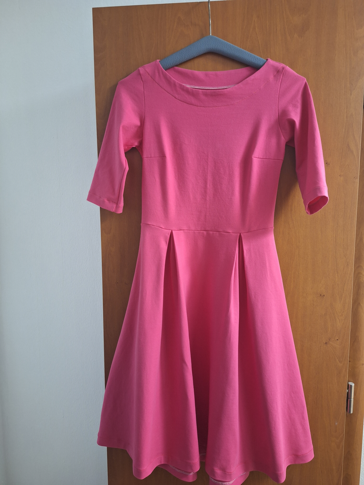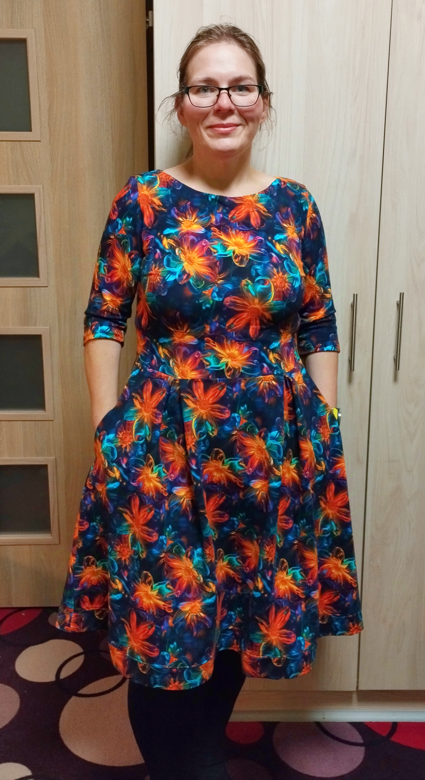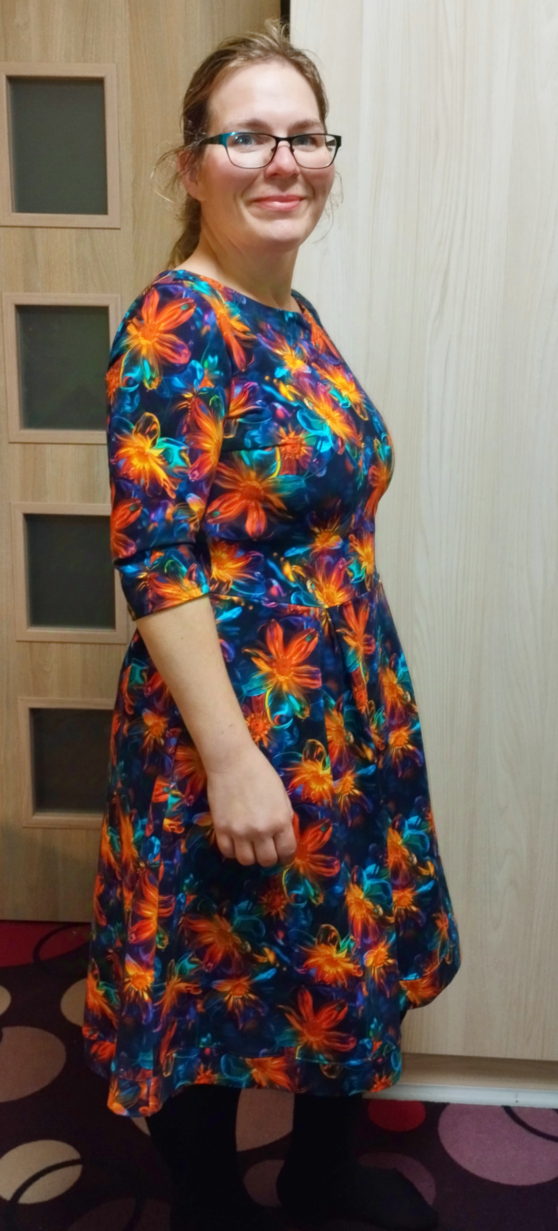 „Se střihem jsem byla velmi spokojená, zrovna tak s návodným videem. Prodloužila jsem rukávy a nepatrně i délku. Délku jsem ještě navíc lemovala proužkem na polovinu. Sklady na předním dílu se otevírají postupně. Takže šaty jsou dost dlouhé a dost hezké, jak říká okolí. Spíše na pozdní podzim a zimu.... Krása. Děkuji za nápad a návod.“