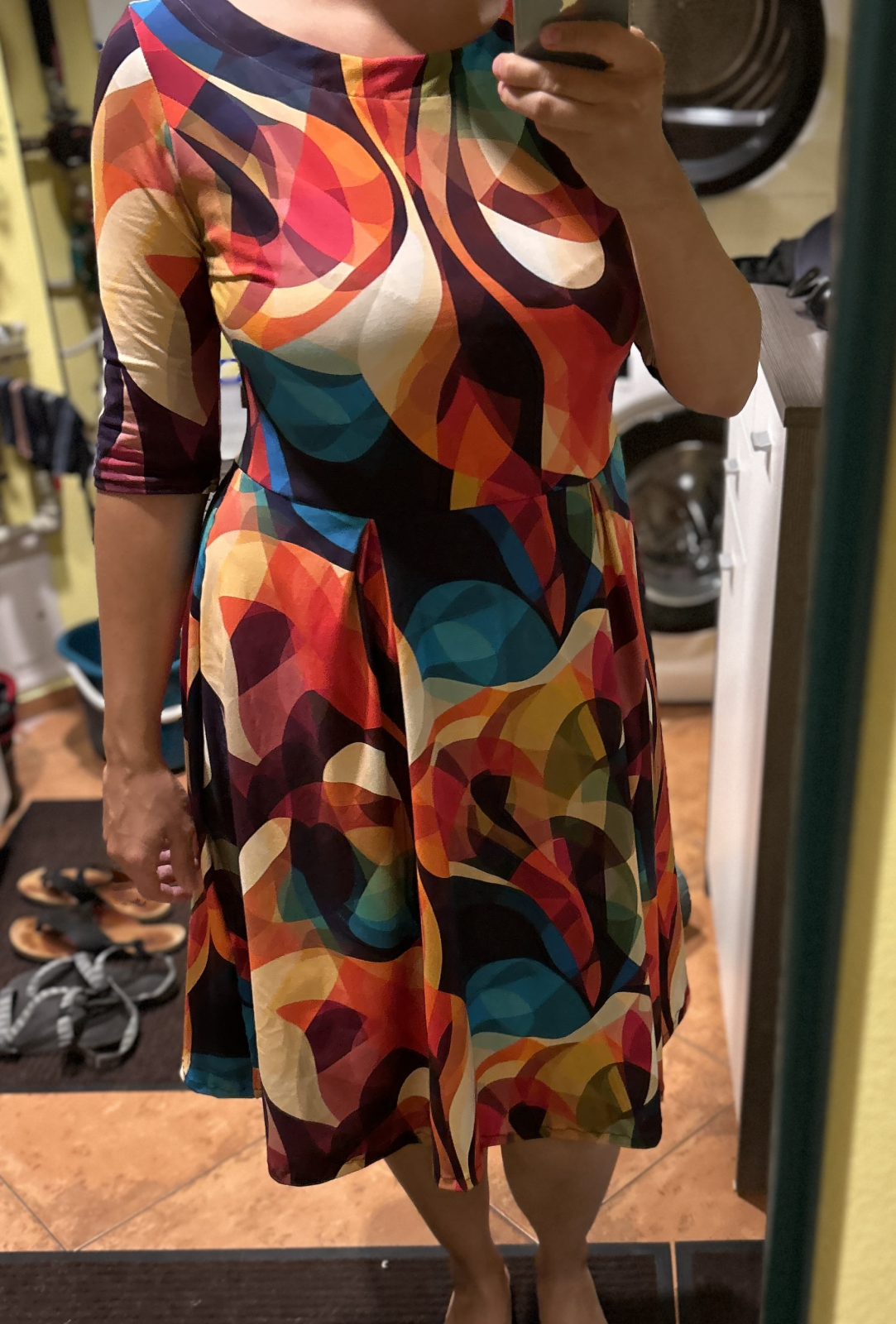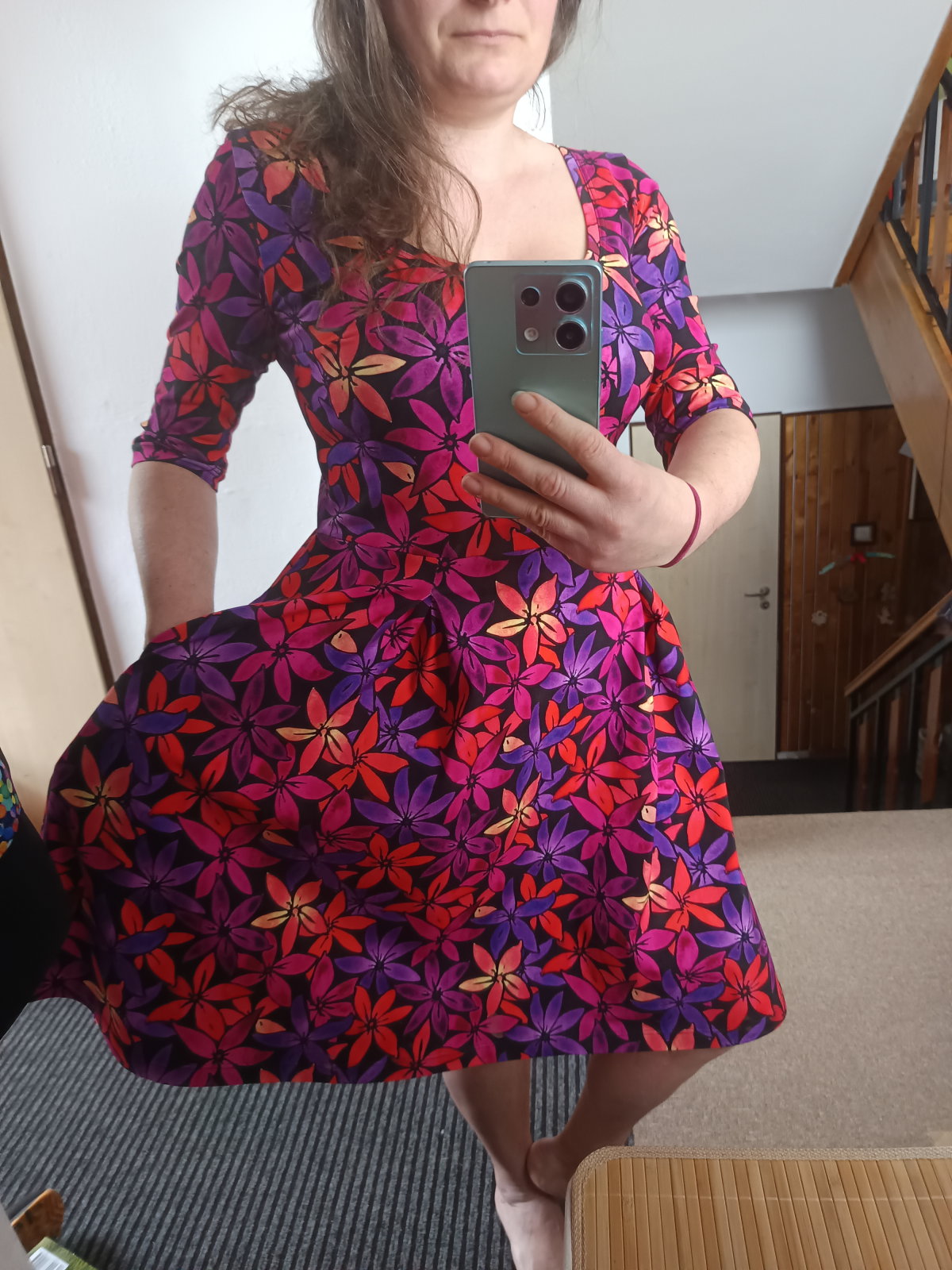 „Chtěla jsem trošku větší výstřih - tak jsem to střihla od oka 😁. Výstřih lemován proužkem na půl (podsádka se mi nějak nedaří). Střih je úplně super! Budu šít brzy další.“