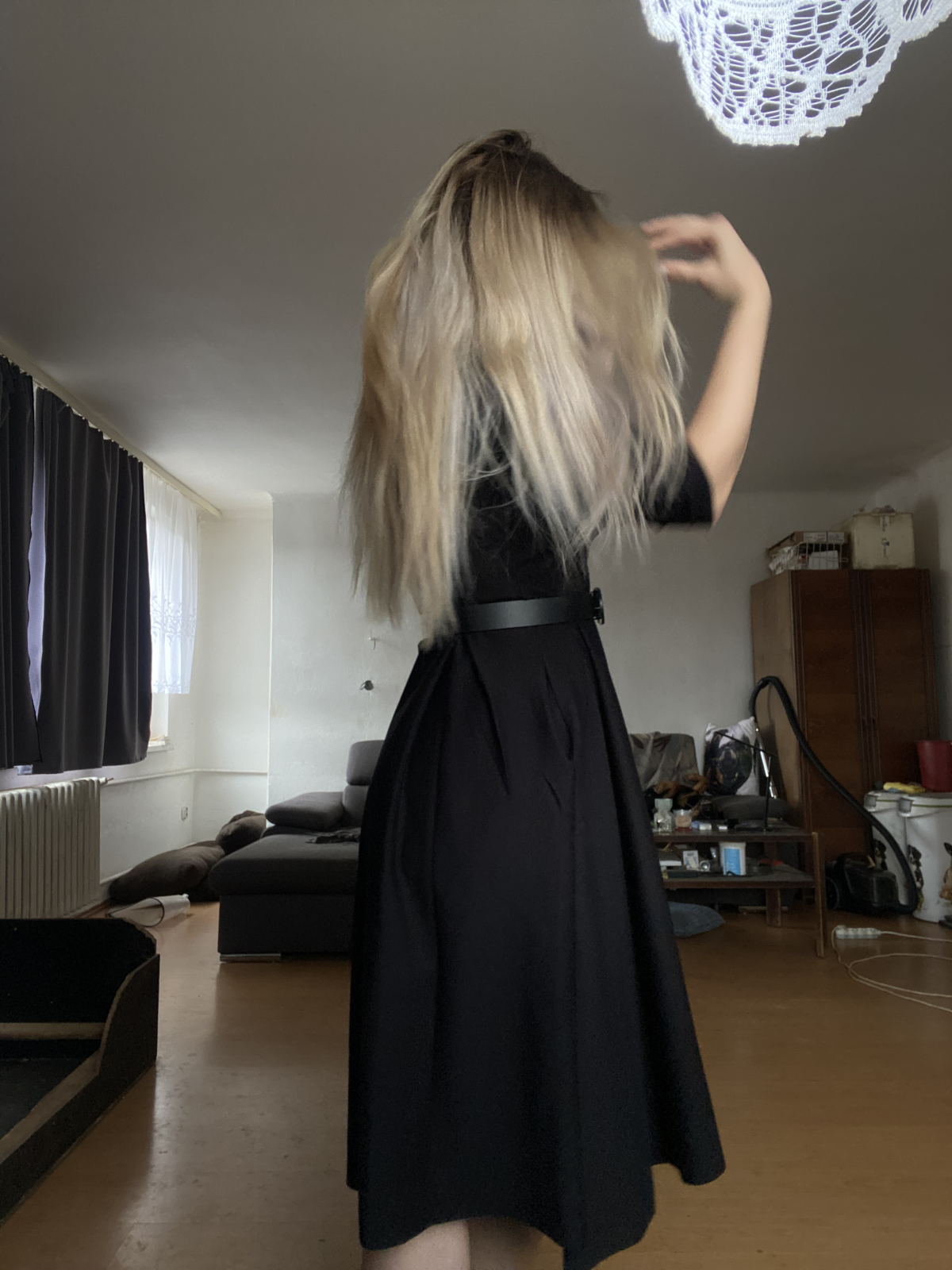 „Mierne predĺžené rukávy a sukňa, keďže som vysoká. Zjednodušené sklady vpredu. Šilo sa skvele, ako všetko od živých strihov.“