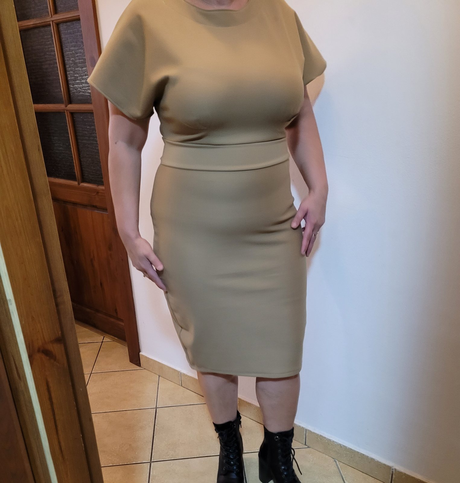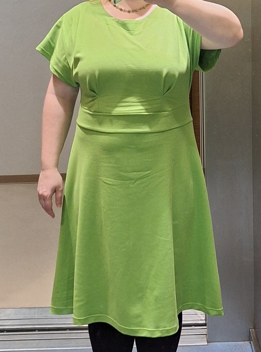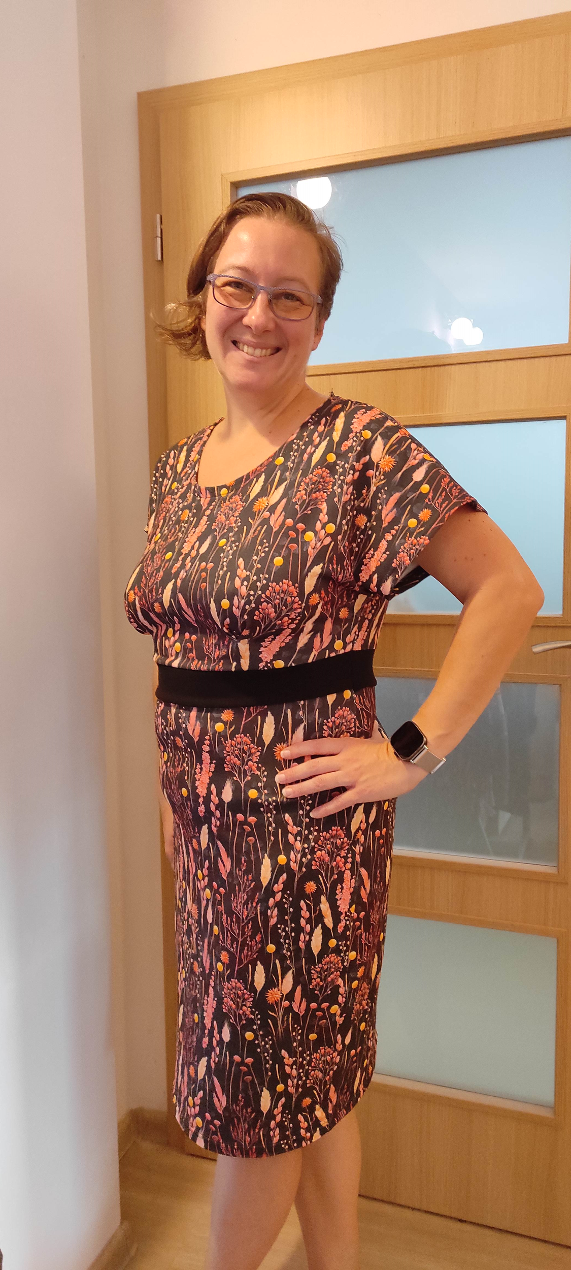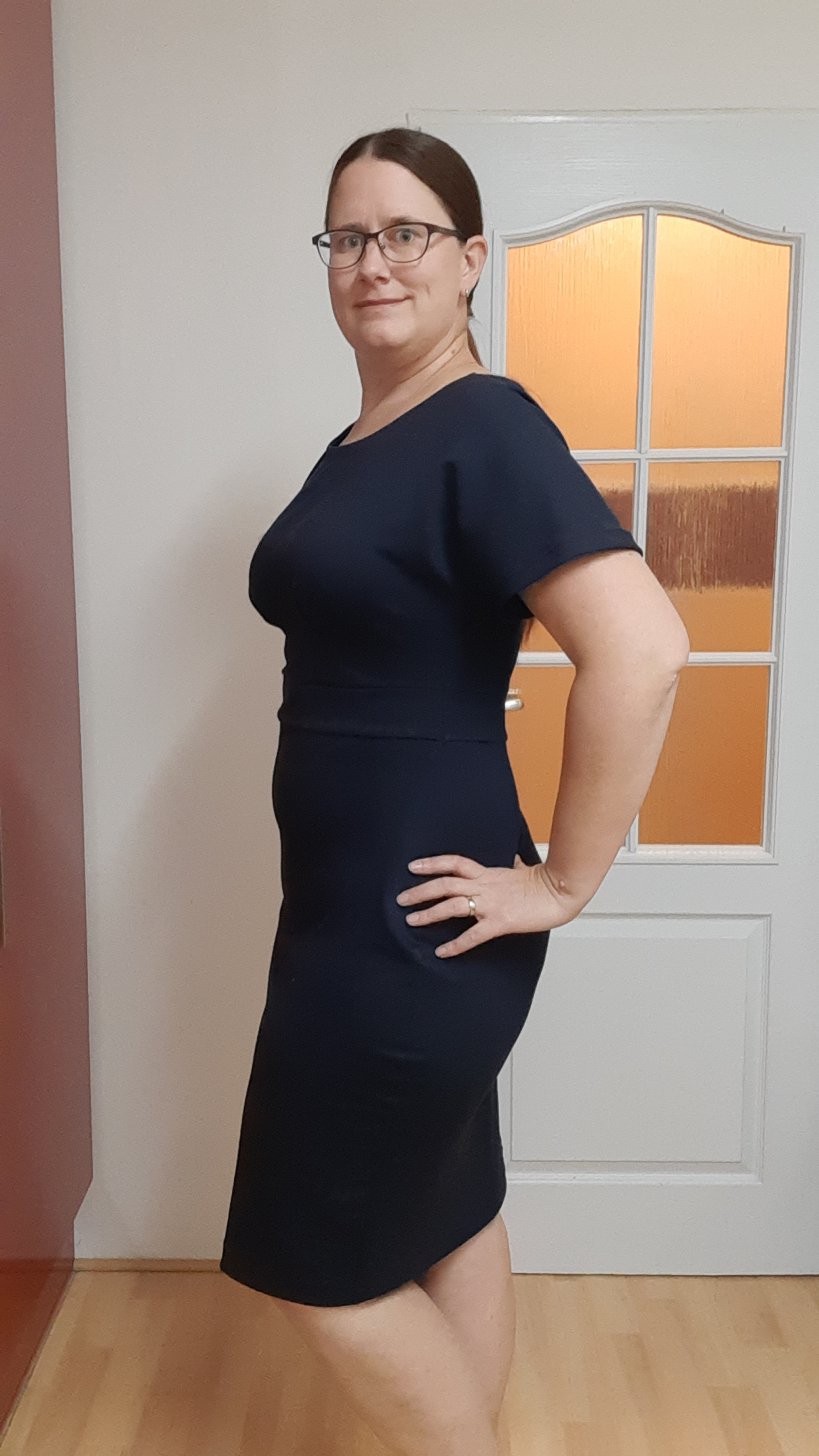 MH: "Tyhle šaty se šijou opravdu dobře (řekla bych, že je to fajn střih pro začátečnice) a rozumím tomu, proč je v návodu několikrát řečeno, že je lepší si nechat větší přídavek a počítat s úpravou. No jo, jenže to bych se do toho nesměla vždycky vrhnout po hlavě. 😀 Šila jsem jich několik a tyhle dopadly nejlíp. Určitě se na ně hodí pevnější úplet, což tenhle je (má 8 % elastanu). Pouzdrou sukni jsem na sebe musela trochu zúžovat. Áčkovou sukni bych naopak potřebovala nahoře trochu zvolnit, ale na to jsem si tam neudělala ten větší přídavek. 😅 Možná budu konfigurovat znova a příště si dám užší rukávy. Mile mě překvapilo, že i já 🍐 můžu mít pouzdrovky. 😁 Díky." *