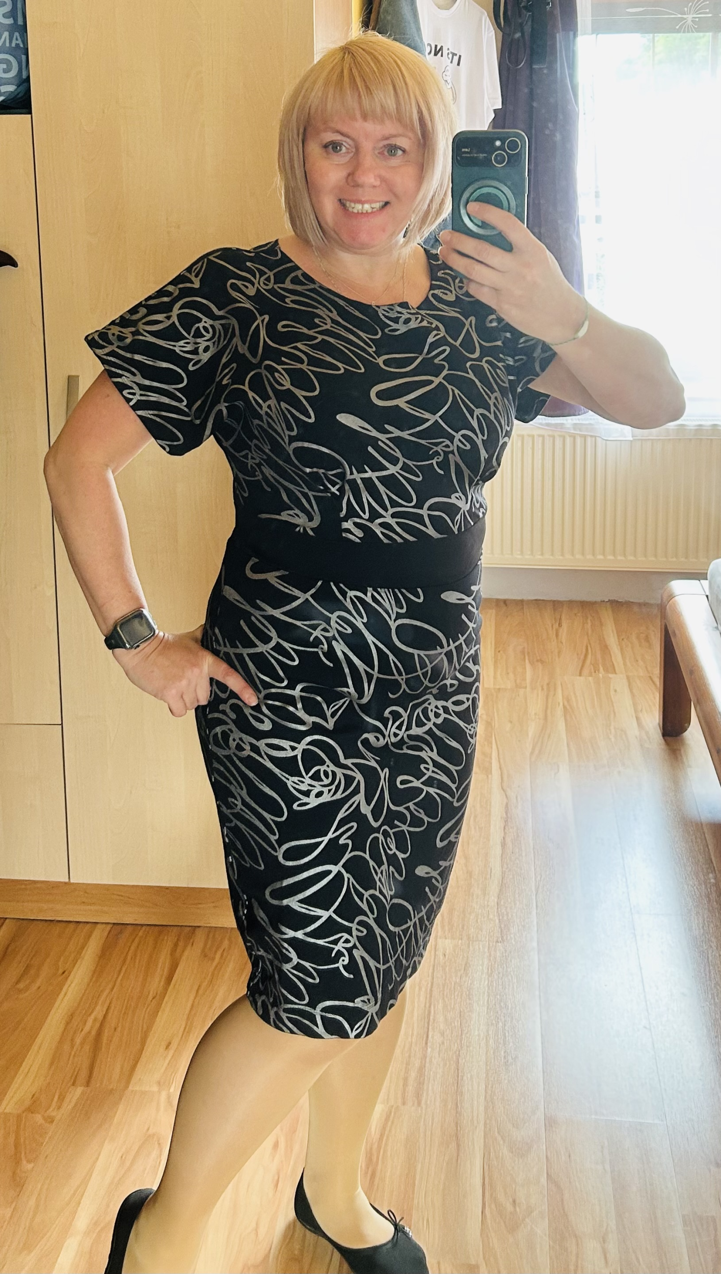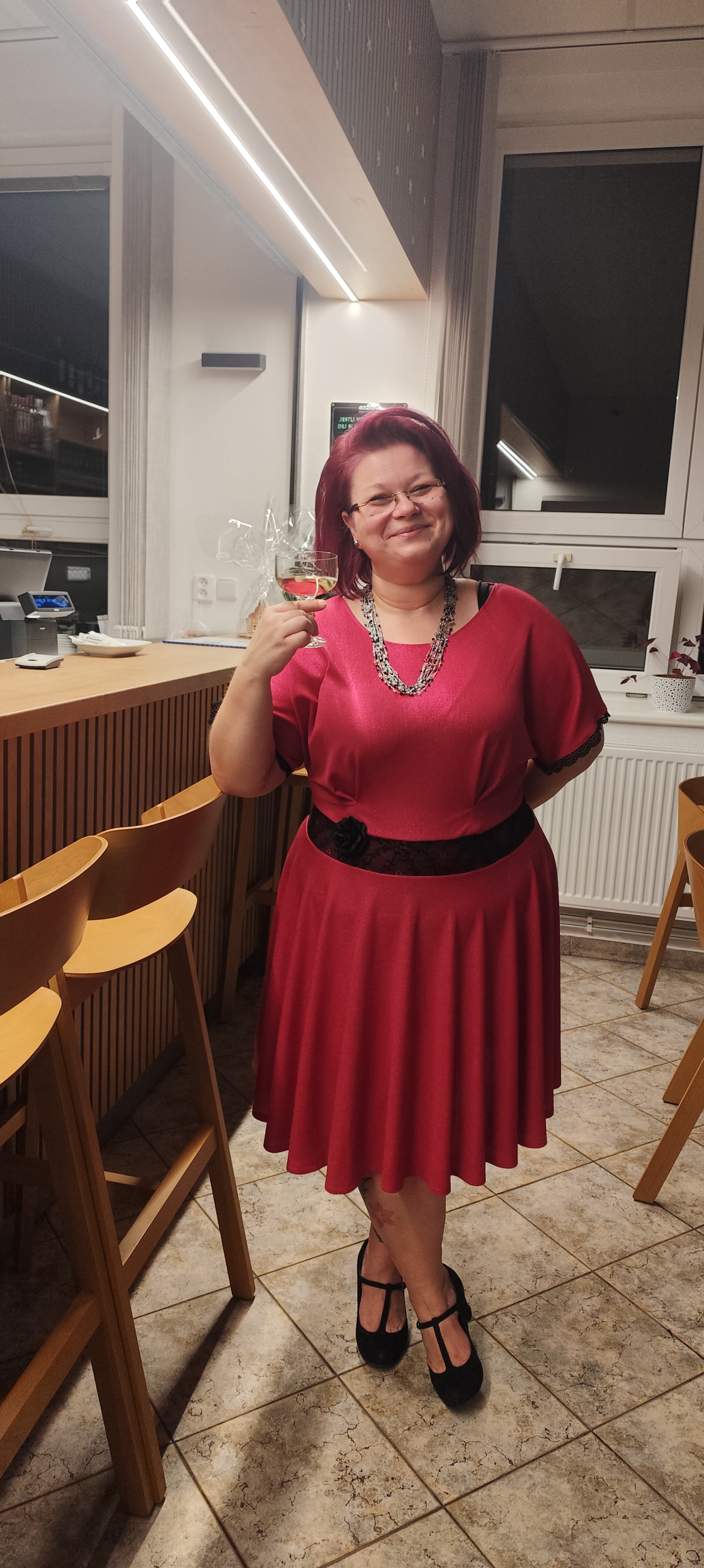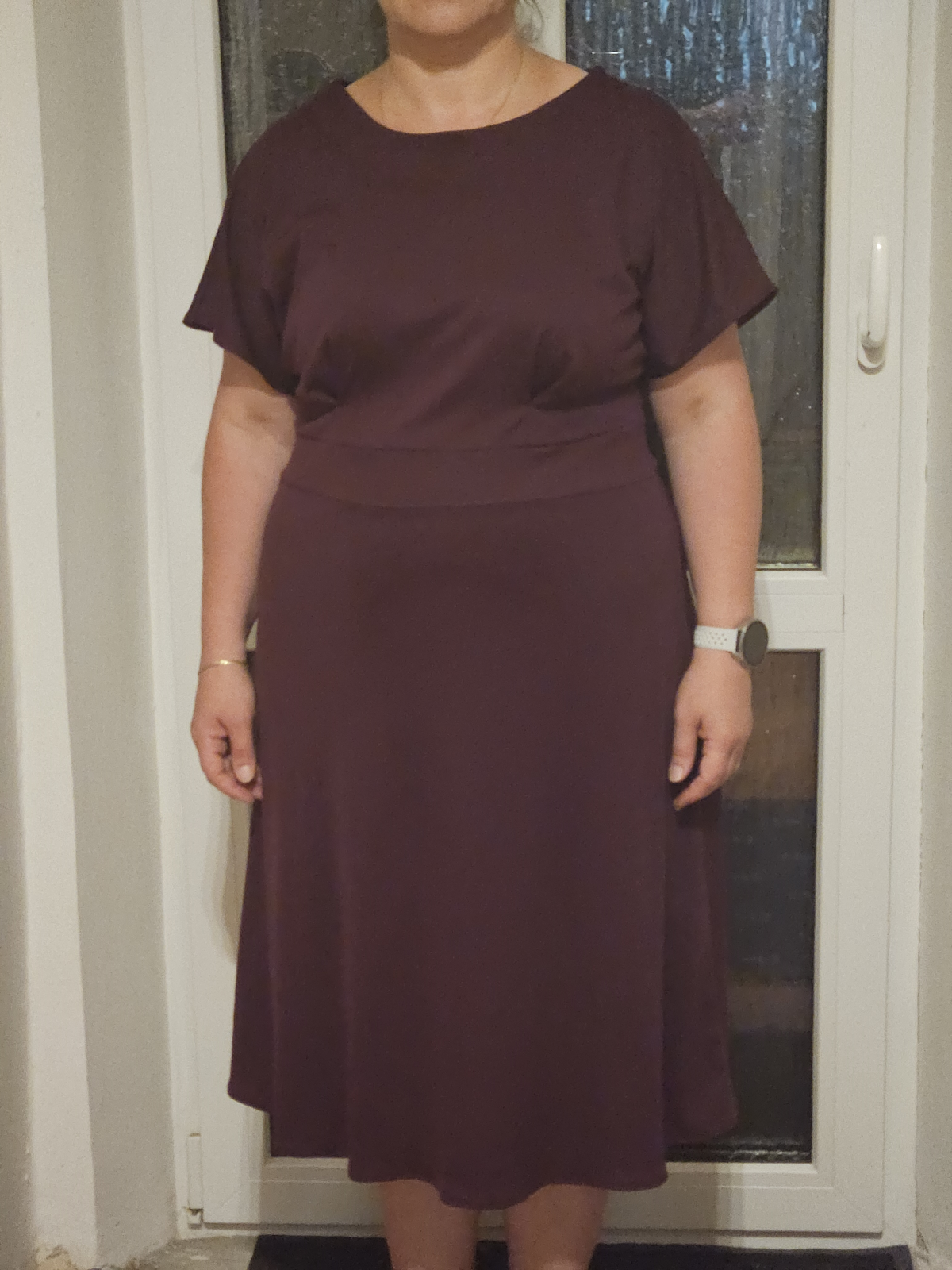 MH: "Tyhle šaty se šijou opravdu dobře (řekla bych, že je to fajn střih pro začátečnice) a rozumím tomu, proč je v návodu několikrát řečeno, že je lepší si nechat větší přídavek a počítat s úpravou. No jo, jenže to bych se do toho nesměla vždycky vrhnout po hlavě. 😀 Šila jsem jich několik a tyhle dopadly nejlíp. Určitě se na ně hodí pevnější úplet, což tenhle je (má 8 % elastanu). Pouzdrou sukni jsem na sebe musela trochu zúžovat. Áčkovou sukni bych naopak potřebovala nahoře trochu zvolnit, ale na to jsem si tam neudělala ten větší přídavek. 😅 Možná budu konfigurovat znova a příště si dám užší rukávy. Mile mě překvapilo, že i já 🍐 můžu mít pouzdrovky. 😁 Díky." *