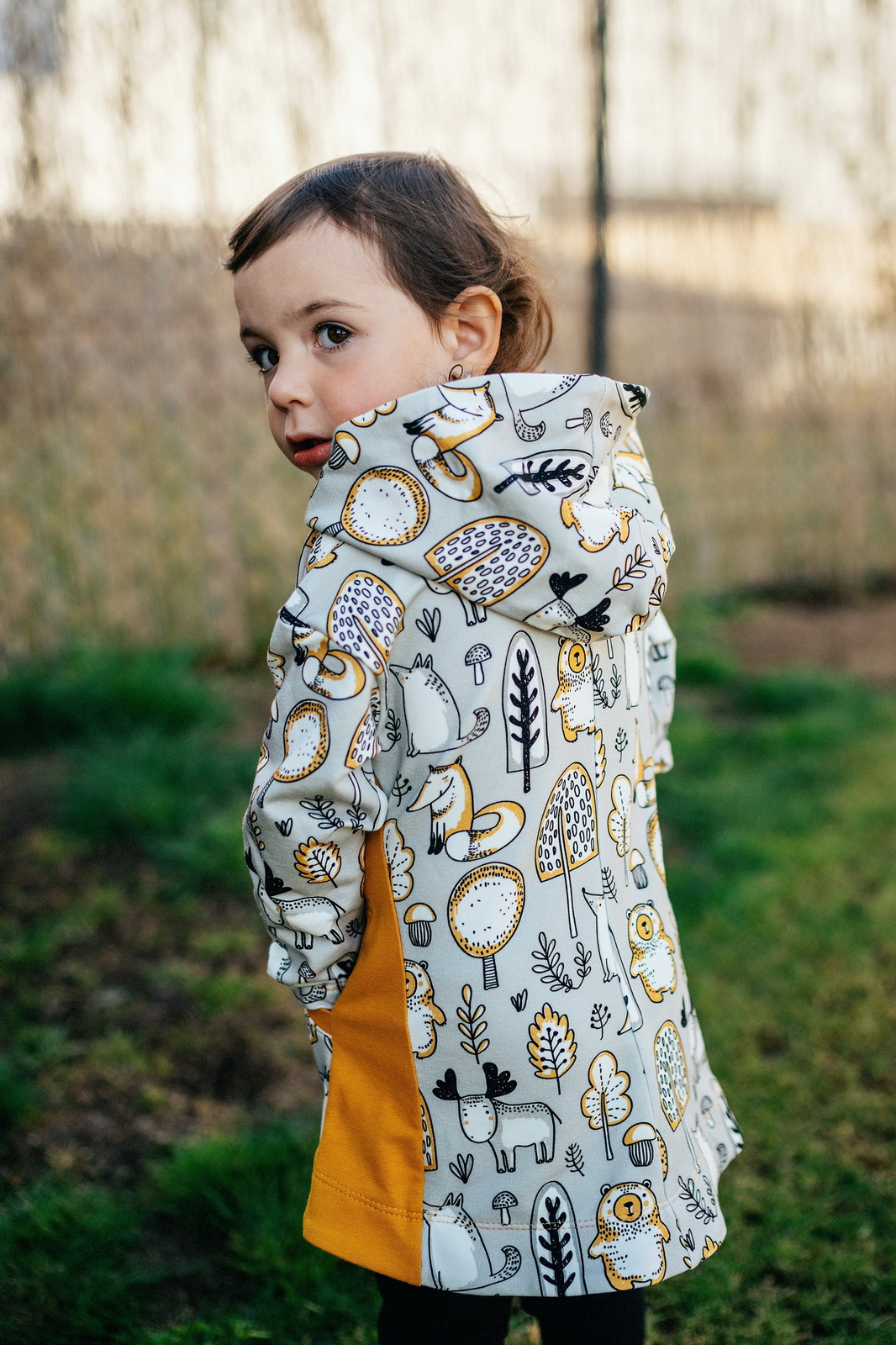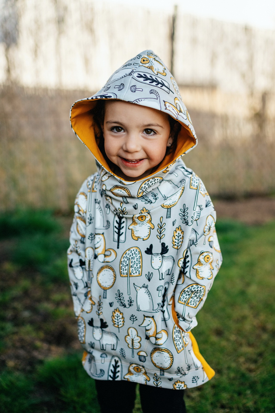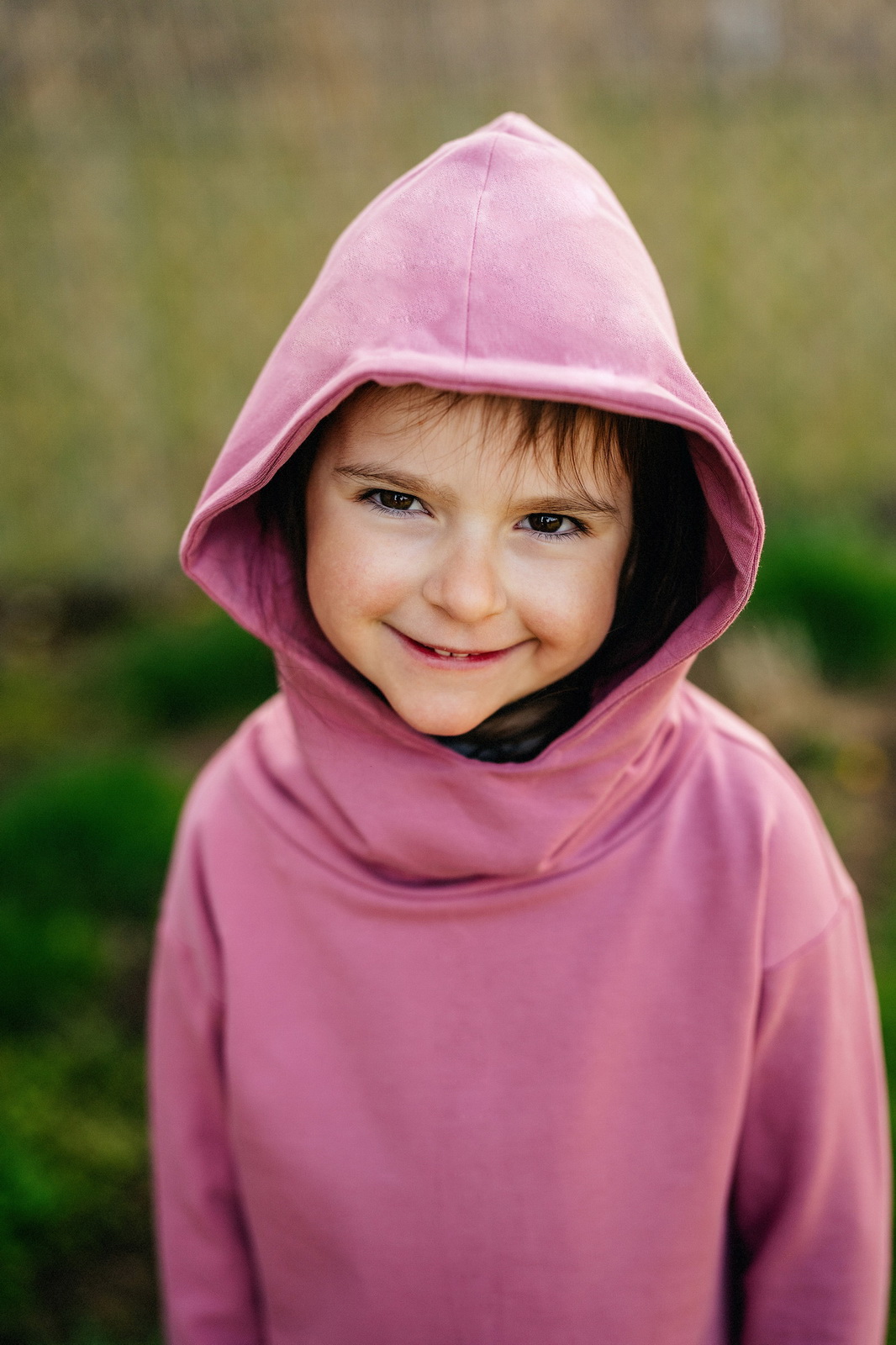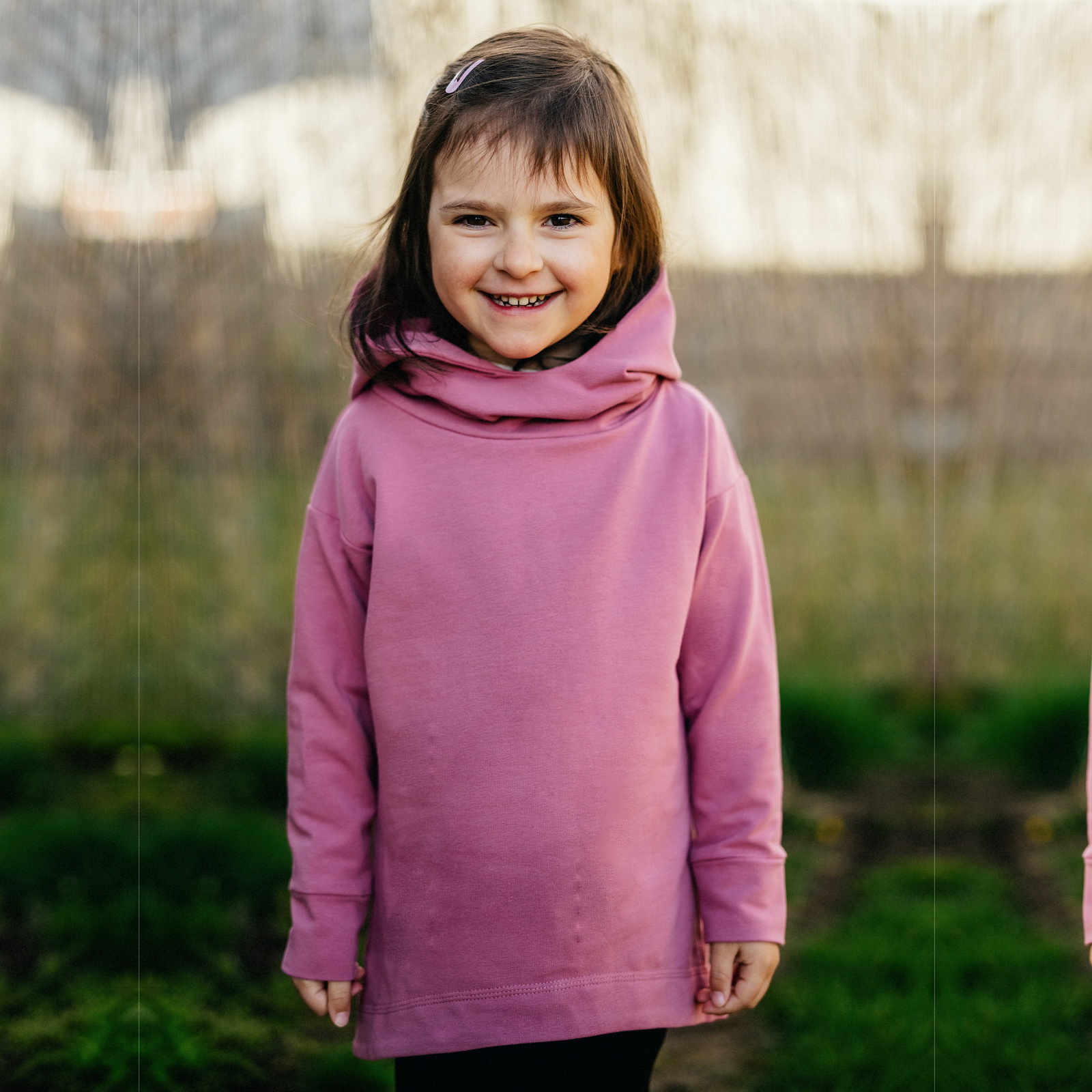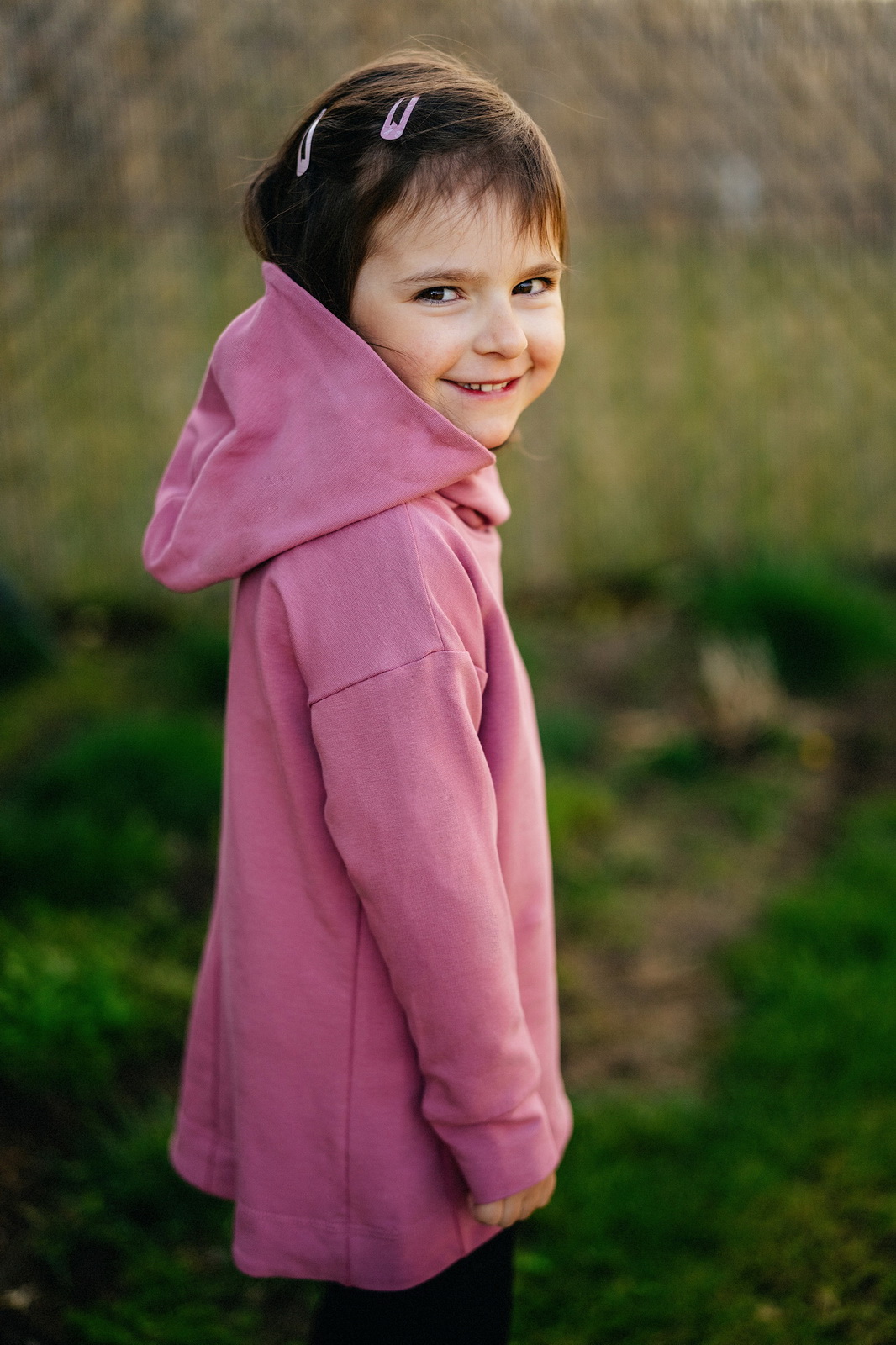 A proto jsme se rozhodly vytvořit dětskou verzi. Je stejně perfektní, pohodlná, nebrání pohybu. Zvonivý tvar dolního kraje působí kouzelně a zároveň sahá pod zadek a tak je i naše maminkovská starostlivost v klidu. Mikina má kapsy a u krku můžete volit mezi límcem s proslulým stahováním, který máte tak rády, nebo kapucou s vyšším rolákem.